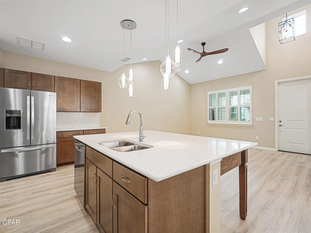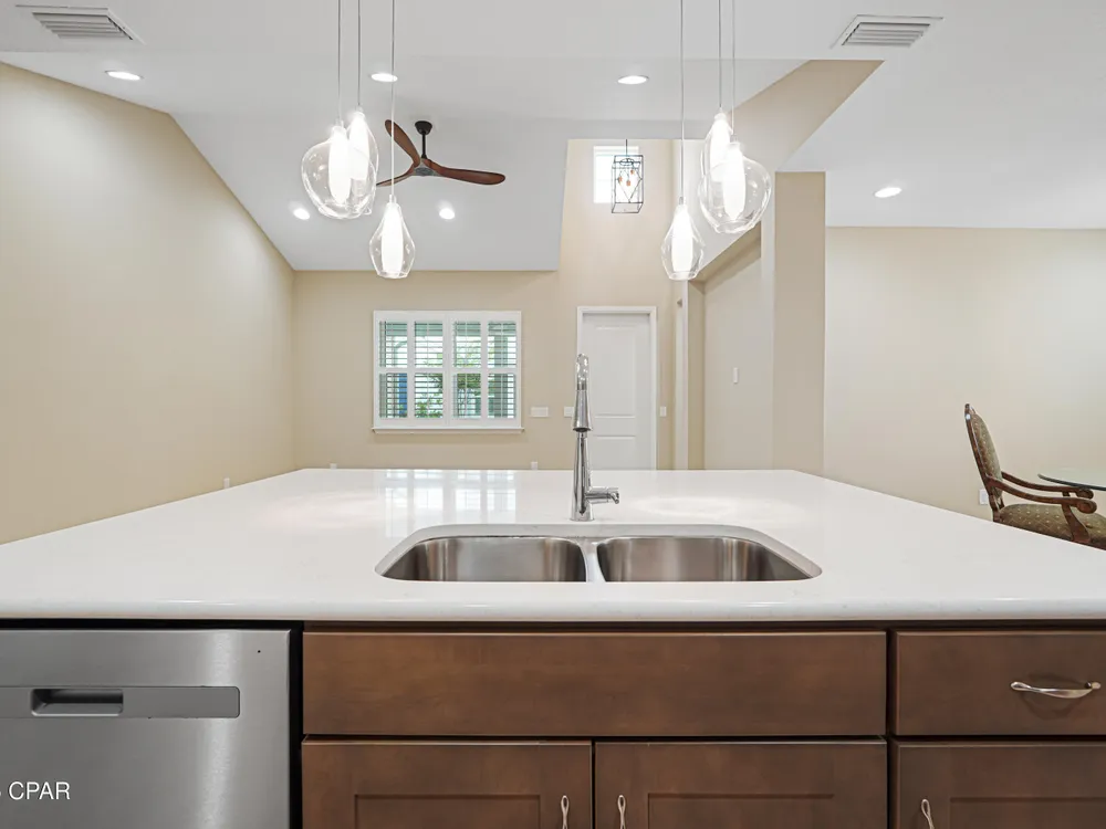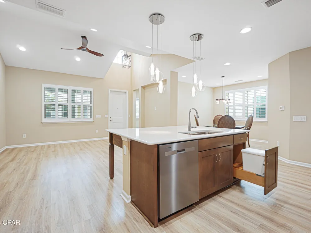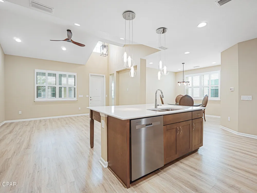 It's always five o'clock somewhere — and here at Latitude Margaritaville Watersound, paradise is calling. This gorgeous Camellia model is ready for new owners to kick back, relax, and enjoy the active Florida lifestyle to the fullest. Every inch of this thoughtfully designed home reflects modern coastal comfort with sophisticated finishes and upgrades that maximize style and storage. Step inside to an inviting, open-concept floor plan where the heart of the home shines. The spacious living area, ideal for entertaining, flows effortlessly into the dining space and stunning open kitchen — complete with an extended island featuring beautiful pendant lighting, custom additional drawers, and an installed trash pullout to keep everything tucked away. You'll love the upgraded laminate flooring, quartz countertops, premium cabinetry, all framed by large windows that bathe the space in natural Florida sunshine. Throughout the home, recessed lighting, plantation shutters, and a clean coastal color palette create a light, warm feel. Storage has been maximized with thoughtful additions including cabinets in the laundry room, extra cabinetry in the garage, and custom touches throughout. Retreat to the serene owner's suite where coastal tones meet relaxation. The en suite bath features dual vanities, refined finishes, and a fully tiled walk-in shower designed to echo the gentle movement of beach waves. Both bathrooms in the home are tiled for a polished, easy-to-maintain finish. A split-bedroom layout offers privacy for you and your guests, ensuring everyone feels right at home. Step outside to your private screened lanai — the perfect place to savor your morning coffee or unwind with the evening breeze under the stars. And just beyond your doorstep, the soft white sands and clear Emerald waters of the Gulf are waiting to welcome you. Living in Latitude Margaritaville Watersound means more than just a beautiful home — it's a vibrant, active 55+ community with world-class amenities. Enjoy resort-style pool, delicious on-site restaurant BAr & Chill, state-of-the-art fitness center with a 75 foot pool, Workin' and Play Center that includes: The Hangar, The Clayground, Barkaritaville Spa, and the Last MAngo Theatre and of course live entertainment multiple times each week at the bandshell. Whether you're soaking in the sun, dancing to your favorite tunes, or simply letting the coastal lifestyle wash over you — here, every day feels like vacation. Schedule your private tour today — your island-inspired escape is waiting.