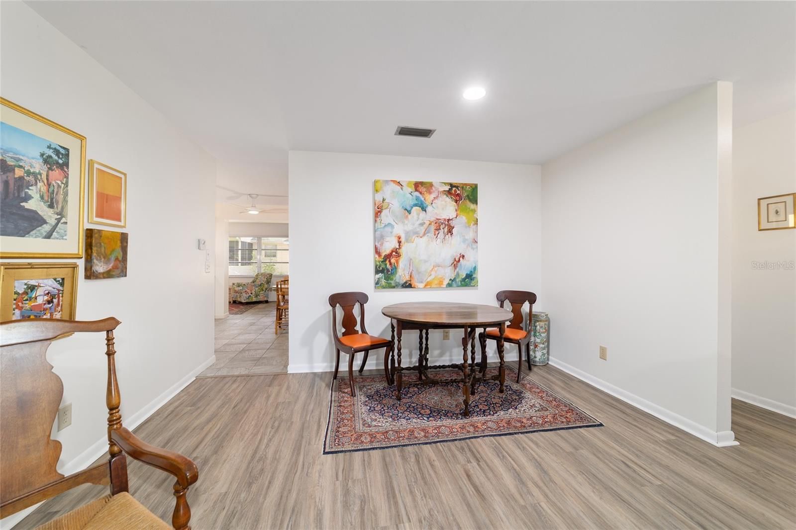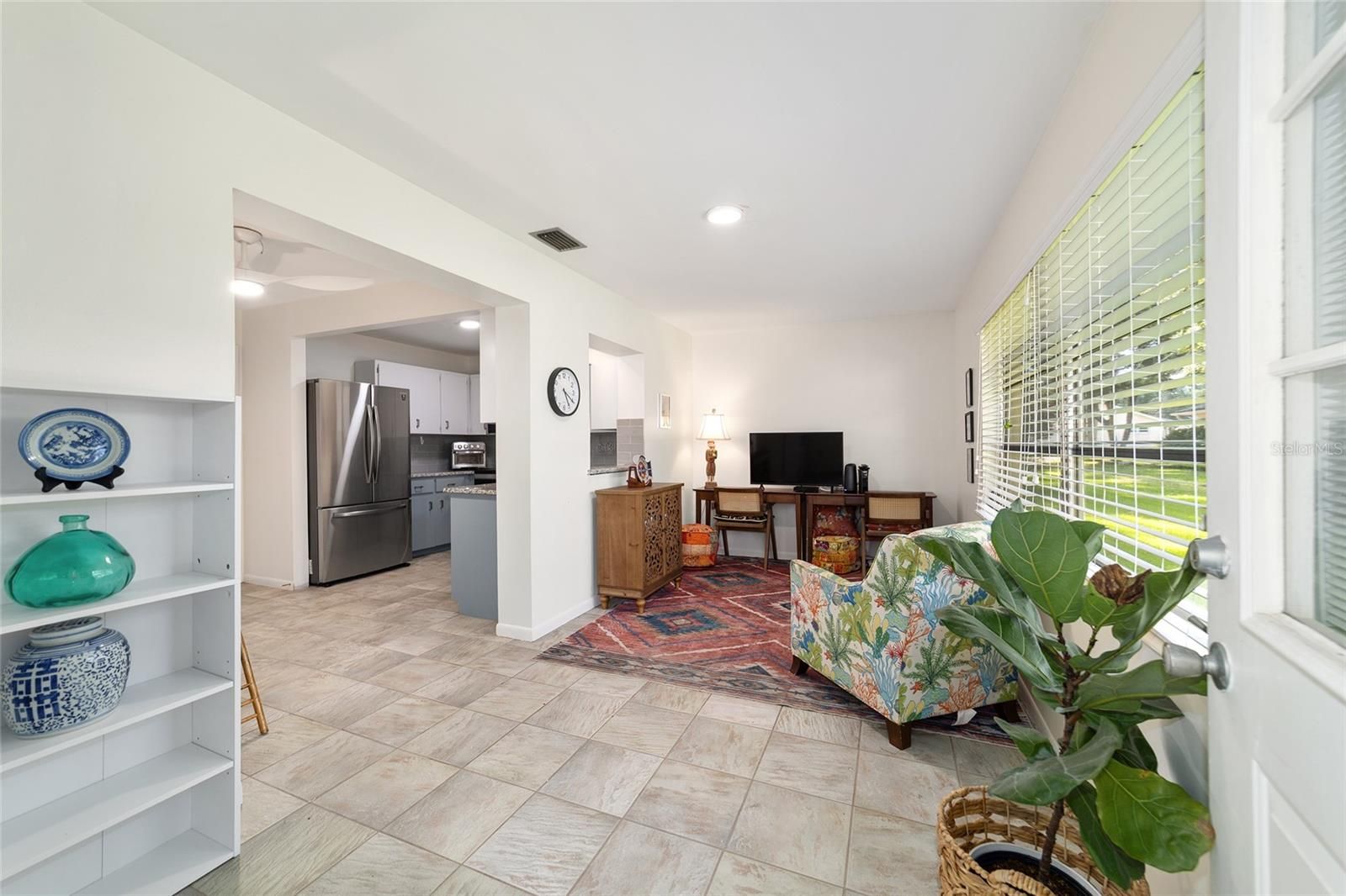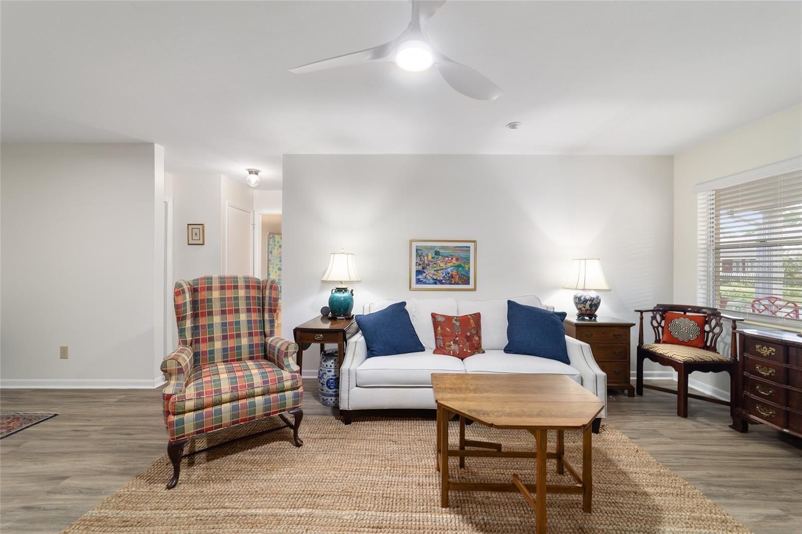 This Philadelphian is move-in ready with lots of updates. With 2 bedrooms, 2 bathrooms, and oversized 1 car garage, this home features luxury vinyl plank and tile throughout for a carpet free home, NO POPCORN ceilings, and newer lighting. The kitchen has granite counters, subway tile backsplash, stainless steel appliances, and a large pantry with a stylish barn door. The large main bedroom has a walk-in closet and a renovated ensuite bathroom with new vanity, new toilet, and new shower and enclosure. The secondary bedroom can also accommodate a king size bed, perfect for guests and the secondary bathroom has a new vanity with granite counter. The covered patio is the perfect outdoor spot with a desirable northern exposure. For buyer convenience, the golf cart and furniture is available. On Top of the World is Ocala's premier 55+ luxury, golf community with a wealth of amenities and golf cart access to dining, shopping, entertainment, healthcare, and beauty.
