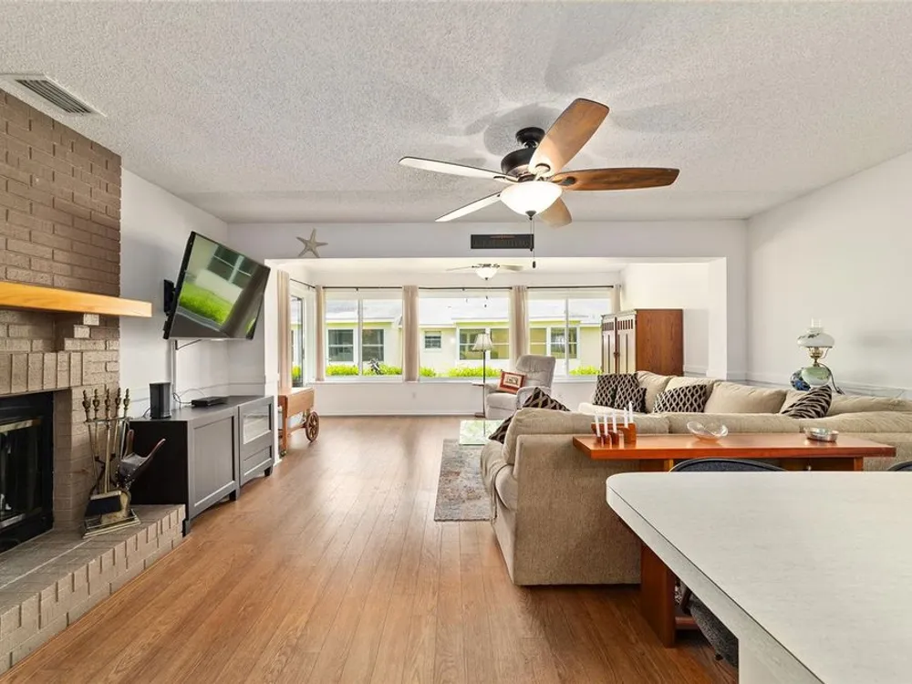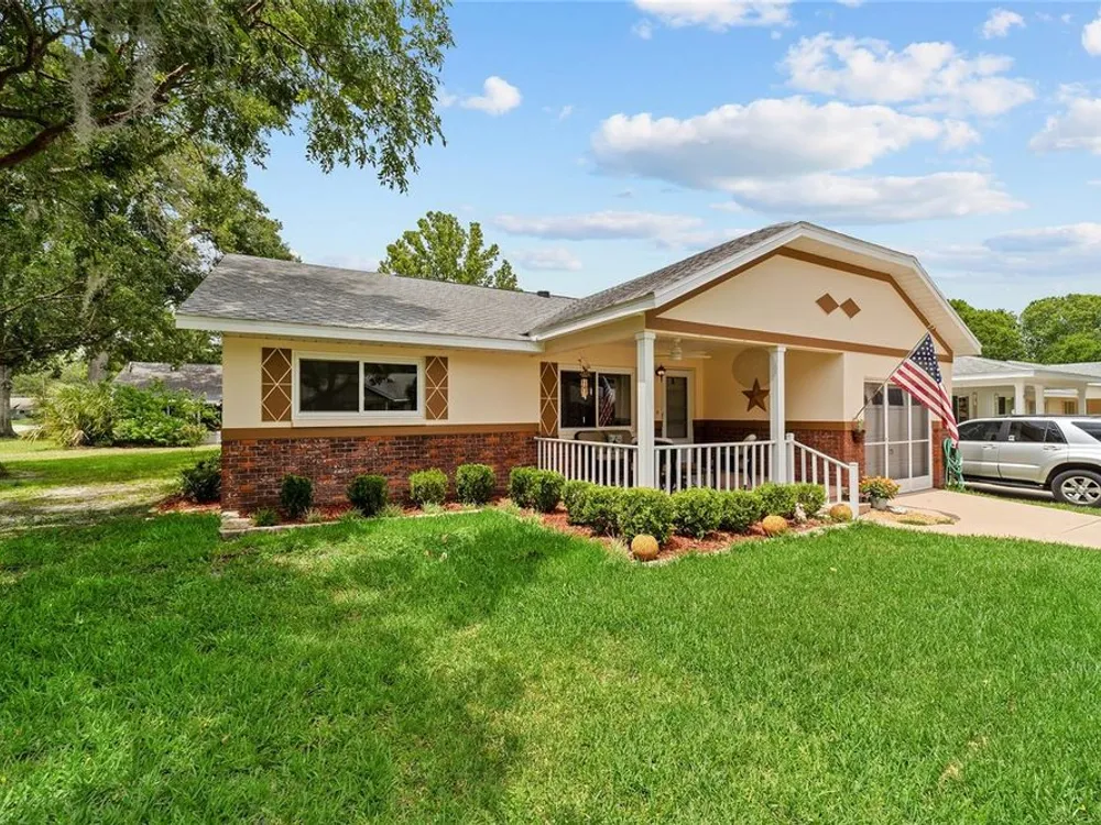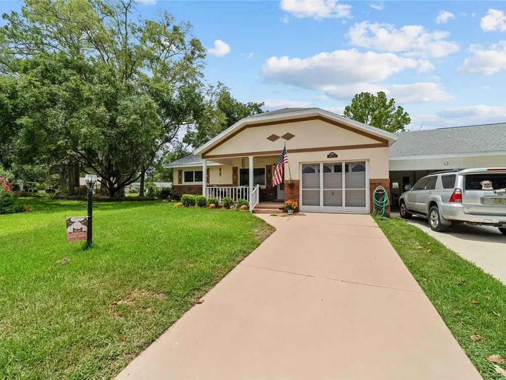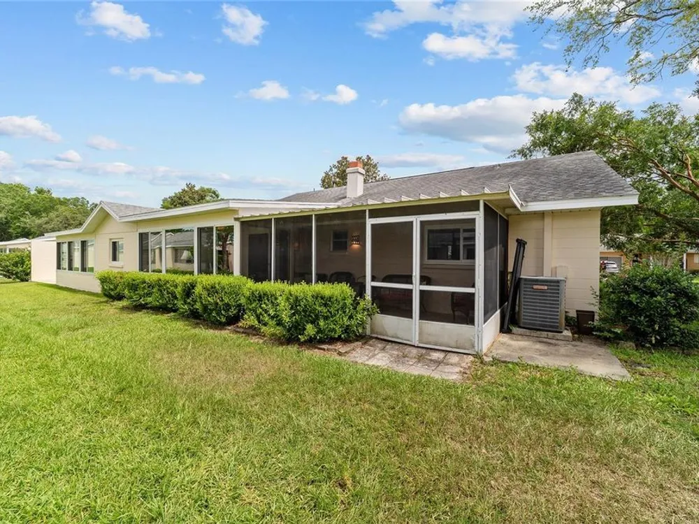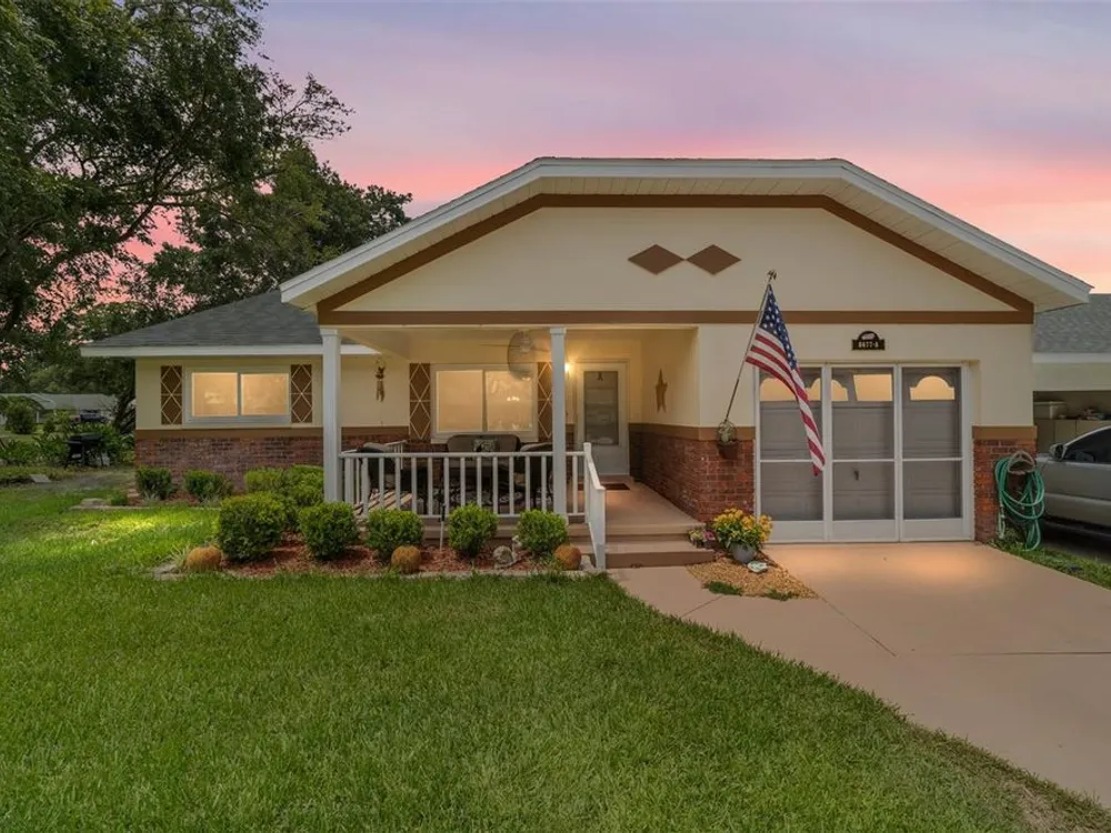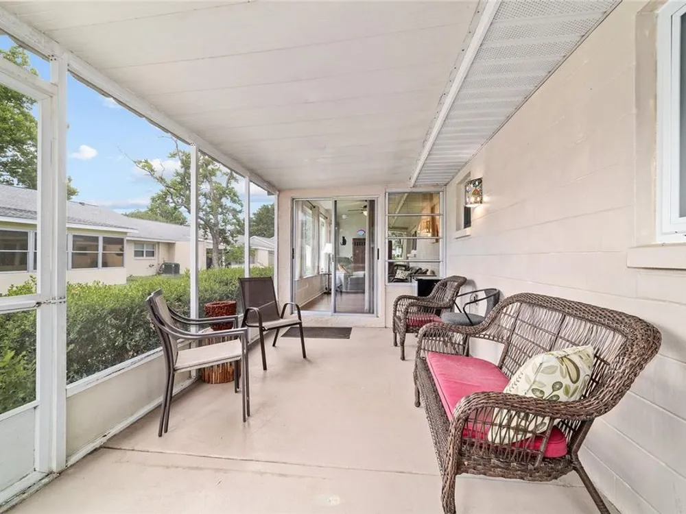 Now Offered at $169,900 - Rare End-Unit Newport Villa – Park-Like Corner Lot Here’s your chance to own an expanded Newport end-unit villa in a peaceful, park-like setting within the sought-after 55+ community of On Top of the World. Enjoy your morning coffee on the generous covered front porch while taking in the serene surroundings. Inside, the open Living and Dining areas feel bright and spacious, featuring wood-look laminate flooring throughout and ceramic tile in the bathrooms—no carpet! The Kitchen is light-filled and functional, with a wide snack bar, stylish backsplash, hanging island lights, newer appliances, and plank flooring. Relax or entertain in the oversized Great Room, complete with a wood-burning fireplace, while sliding doors open to a screened patio and convenient covered golf cart parking. This home has been carefully maintained and updated, including new windows (2024), new garage door (2025), roof (2016), AC (2010), attic fan (2015), and a solar tube that adds natural light. A home warranty is also included for added peace of mind. The Master Bedroom offers a walk-in closet and step-in shower, while the Guest Bedroom is generously sized with a deep closet, highlighting the thoughtful layout of this villa. Residents enjoy access to clubhouses, pools, fitness centers, tennis and pickleball courts, hobby studios, dog parks, and golf courses(fee based), all easily reachable by golf cart along with shopping, dining, and medical offices. This rare end-unit won’t last at $169,900—schedule your showing today!