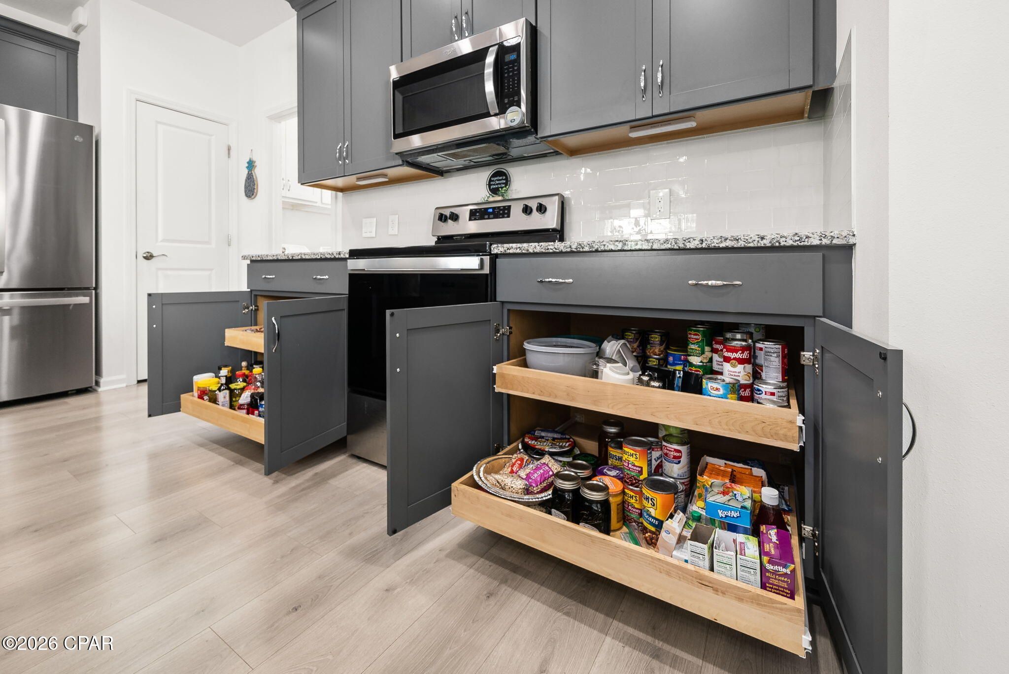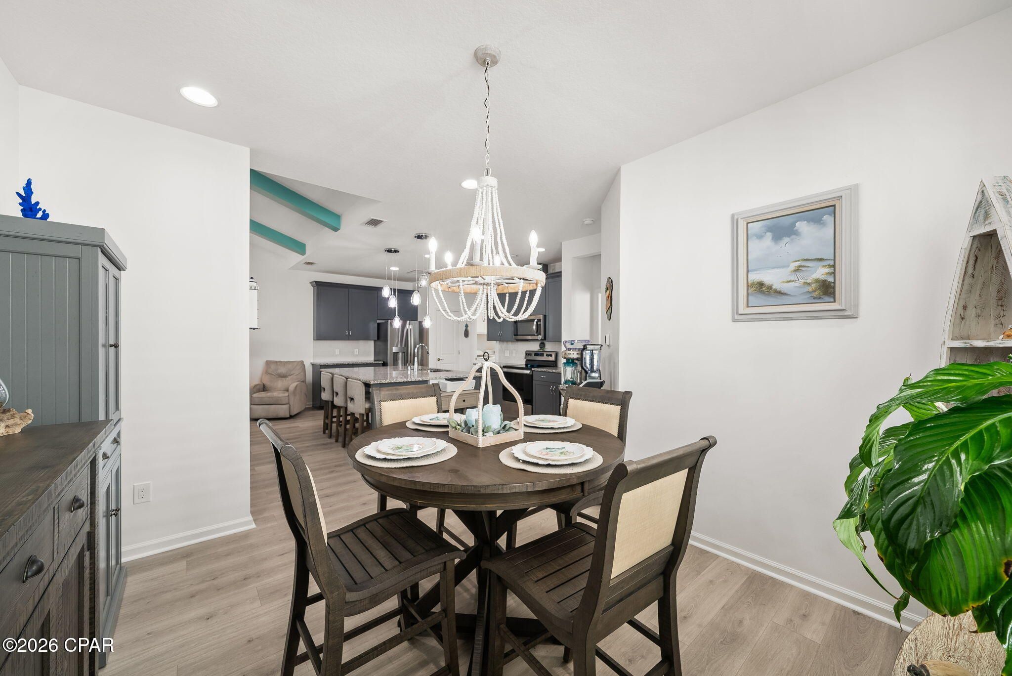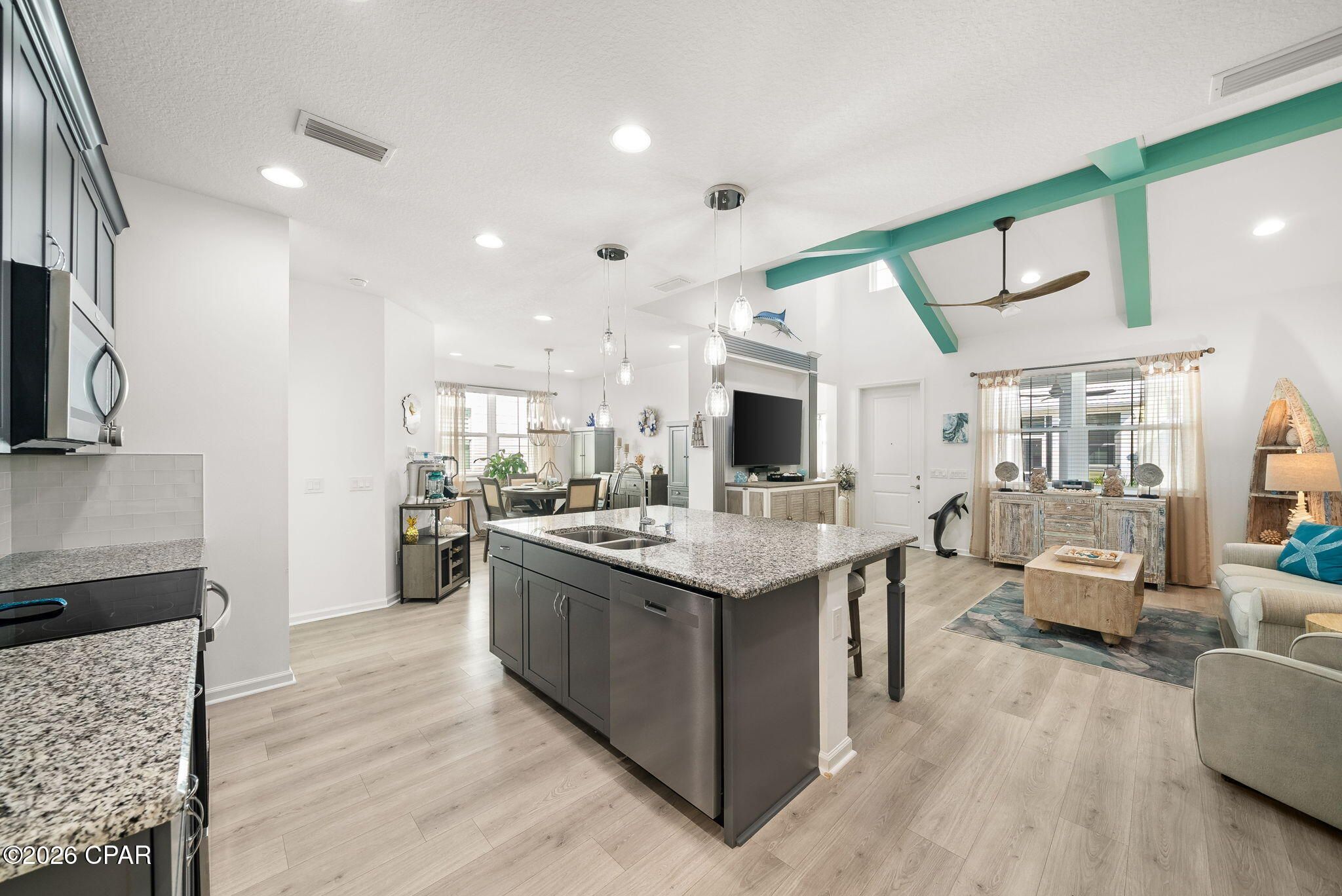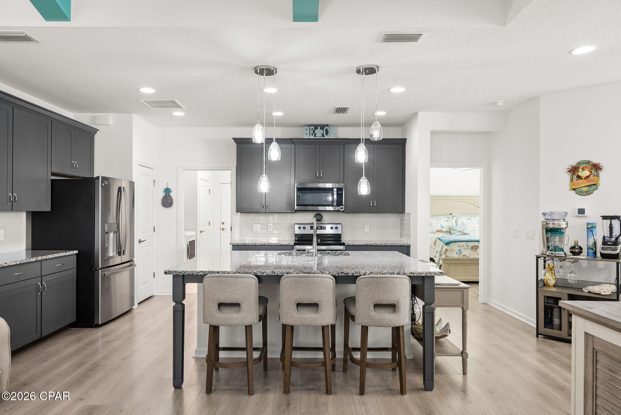 Fins Up! Dive into the ''no worries'' lifestyle with this stunning Camellia cottage in the highly sought-after Phase 4A of Latitude Margaritaville Watersound. Walking distance to the town center, dog park and the retail; this home is packed with upgrades, making it the perfect retreat for those ready to live on ''island time.'' Home Highlights: Chef's Island Kitchen: Features an extended kitchen island with Level 1 Luna Pearl granite , custom Level 3 white tile backsplash , and sleek 42'' Grey Hound cabinetry with crown molding. Upgraded Living Spaces: Bright and airy with LED recessed lighting throughout the main living areas and a convenient pocket door added to the Master Bath for a streamlined flow. Enjoy the perfect blend of style and function with a built-in TV focal wall, finished with decorative fluted columns and a custom mantel-style header. The neutral tones perfectly complement the vibrant coastal teal ceiling beams and driftwood-inspired flooring. Stylish Master Suite: Relax in a master bath featuring Level 3 Calacatta Empire floor tile and elegant granite countertops. Thoughtful Additions: Laundry Room: Custom cabinets added to the ceiling for maximum storage and GE Profile Washer and Dryer. Garage: Professional epoxy flooring for a clean, durable finish, plus a utility sink and full insulation package plus garage door insulation! From the whole-house gutters to the stainless steel preferred appliance package, every detail has been handled. Just bring your flip-flops and start living the dream! INCLUDED with the purchase of this home is the refrigerator in the kitchen (4 year remaining warranty), the refrigerator in the garage, the washer & dryer, the commercial ice maker in the garage, the ice chest in the garage and the great room TV with Bose Sound Bar. All other furnishings are for sale. See the documents section for items not for sale and full list of upgrades!
