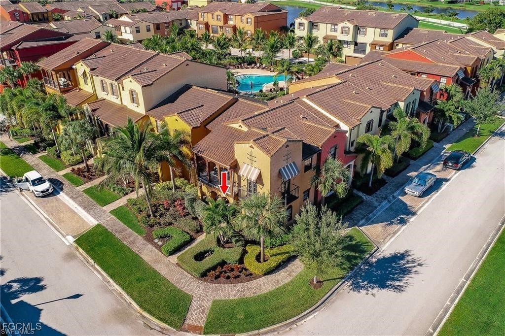 Location, location, San Fernando flat located on a quad with water views! This absolutely adorable light, bright corner unit is sure to impress. One of only 2 floorplans in Paseo multi families with NO STAIRS AT ALL! White cabinets, Arabesco granite, tile flooring, stainless appliances. Quads feature semi private pool and park area right outside your back door. Also, Large outdoor patio area to enjoy warm Florida sunshine. PASEO VOTED COMMUNITY OF THE YEAR 9 YEARS IN A ROW!! Come relax by the RESORT STYLE POOL or enjoy a beverage at the TIKI BAR. Watch a game at the PUB or enjoy brunch at the BISTRO. Grab a friend and watch a movie in the cinema or work out in the FULLY EQUIPPED GYM. New lighted bike path will connect you to Lee County bike trail system. Enjoy a game of doubles on the 6 har tru TENNIS COURTS or join in the fun at the PICKLE BALL COURTS!! Come enjoy the Paseo Lifestyle.