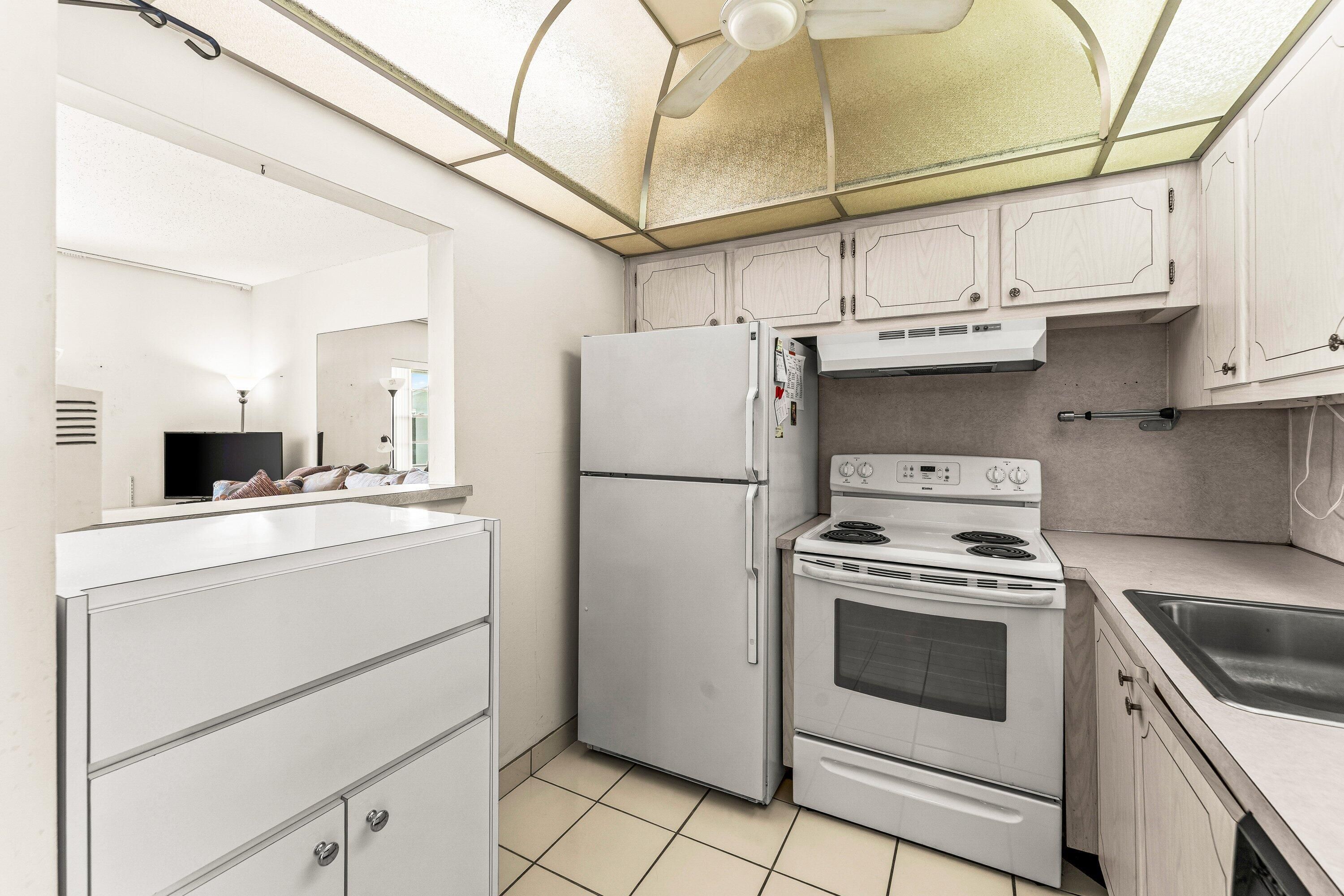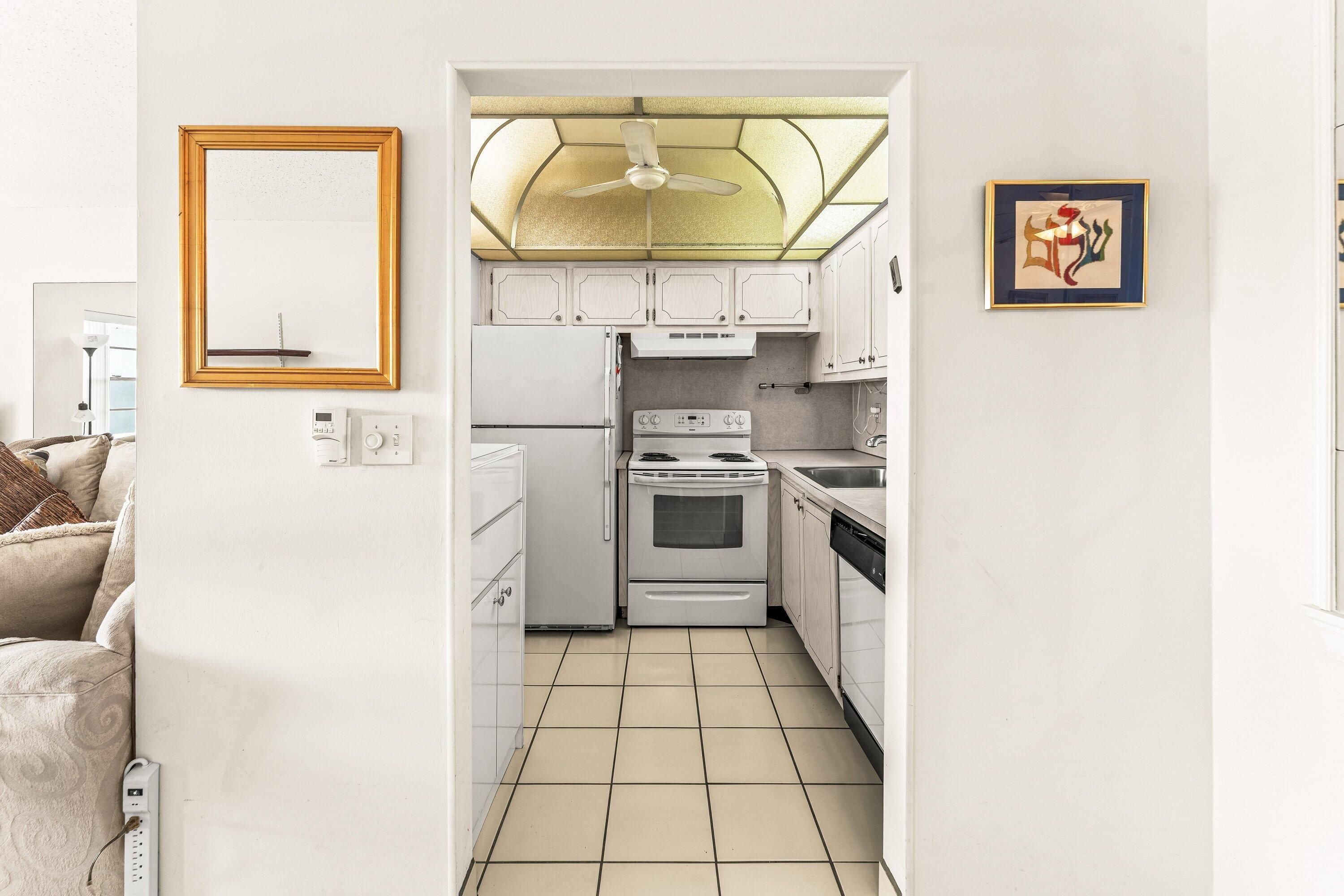 Welcome home to this charming 1-bedroom, 1.5-bath second-floor condo located in the highly sought-after Century Village community, just one minute from the main gate for quick and easy access in and out of the neighborhood.Step inside to a bright and spacious living area where the living and dining rooms flow effortlessly together, featuring modern laminate flooring and abundant natural light that creates a warm, inviting atmosphere perfect for relaxing or entertaining.The well-maintained kitchen features solid wood cabinetry, durable laminate countertops, a GE refrigerator and dishwasher, and a large pass-through window ideal for hosting guests and keeping conversations flowing.The generously sized bedroom offers two walk-in closets and large sliding glass doors that open