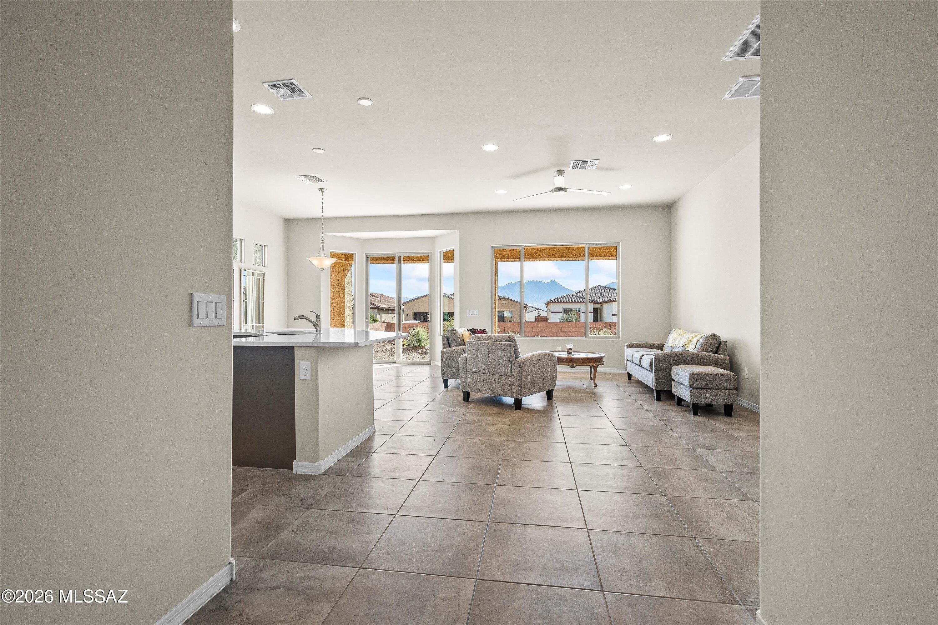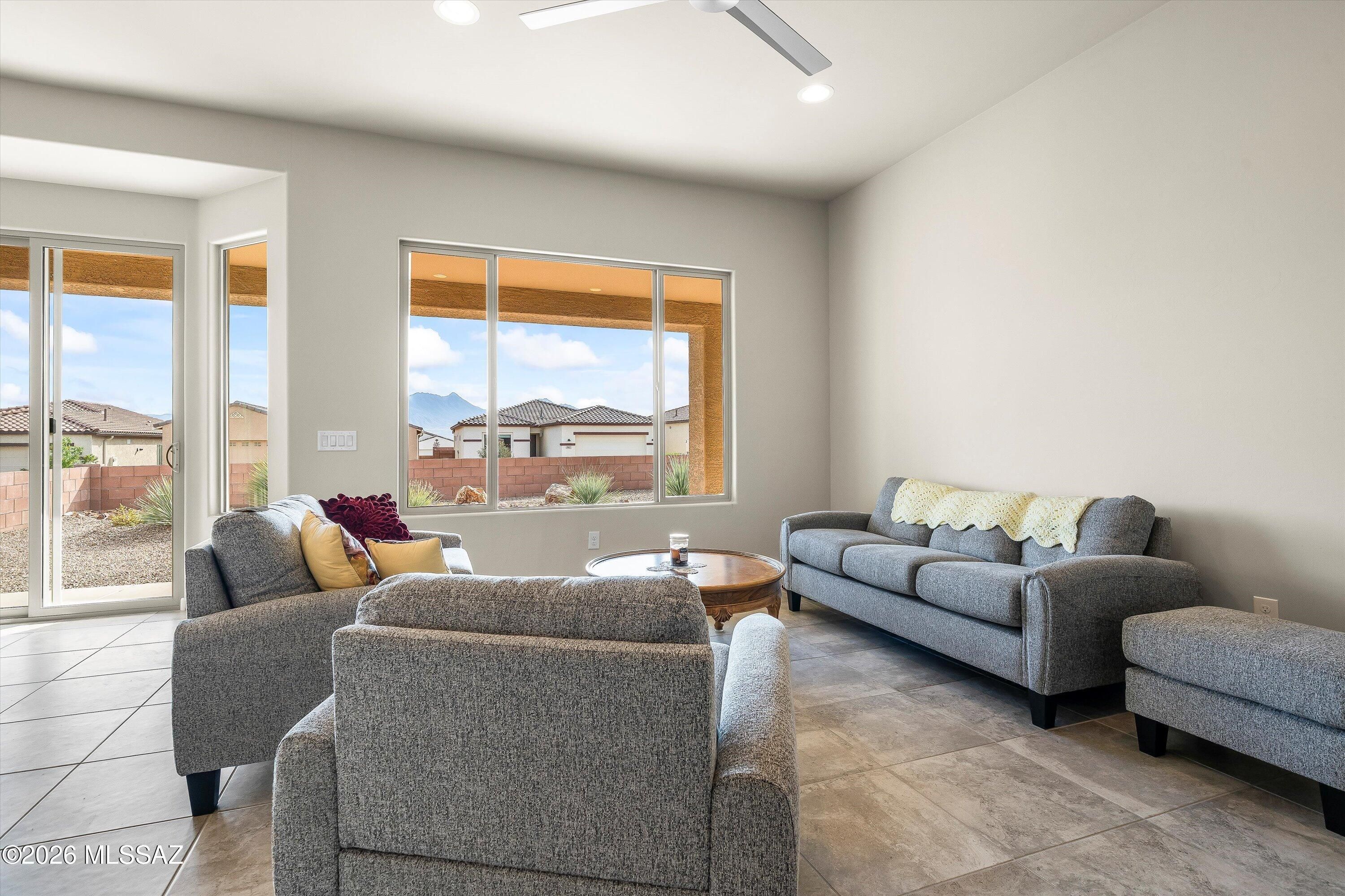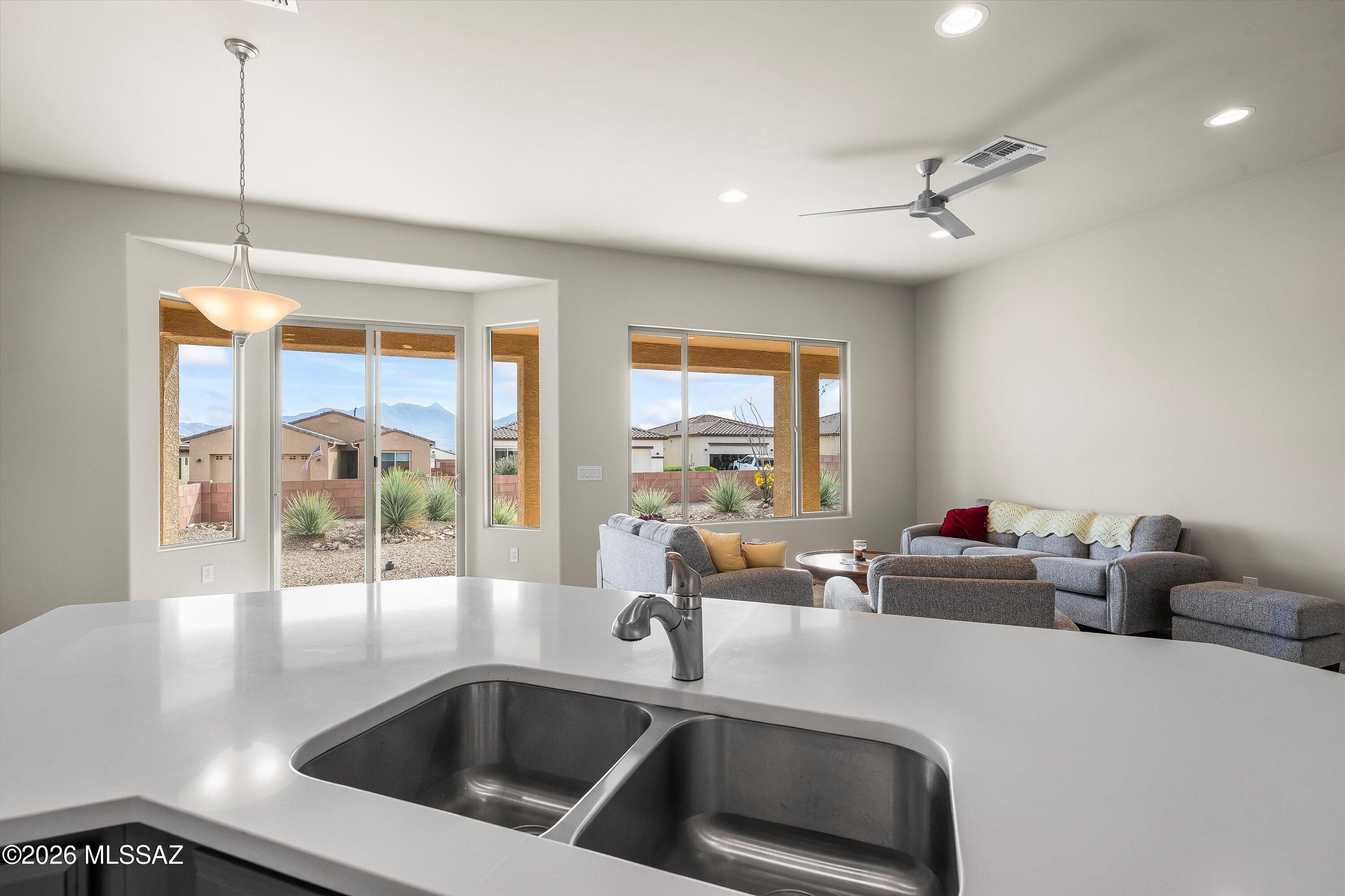 Seller will accept, or counter offers between $399,000 and $440,000. Owner/Agent - This home has prime orientation with the backyard facing beautiful Santa Rita Mountains. Includes rear yard fence line backs to common area. Open floor plan with no wasted space. Includes large pantry and kitchen island, quartz countertops, cabinets with soft close doors and a full length rear patio. One can appreciate the special evening shade, looking at the mountains. Huge walk-in closest and dual vanities in the owners beautiful suite. All cabinets, countertops and flooring have been upgraded for this very special designer inventory home. Garage length has been extended by 4 feet. 2 Bedrooms with 2 full Bathrooms, plus one den/office/spare room.