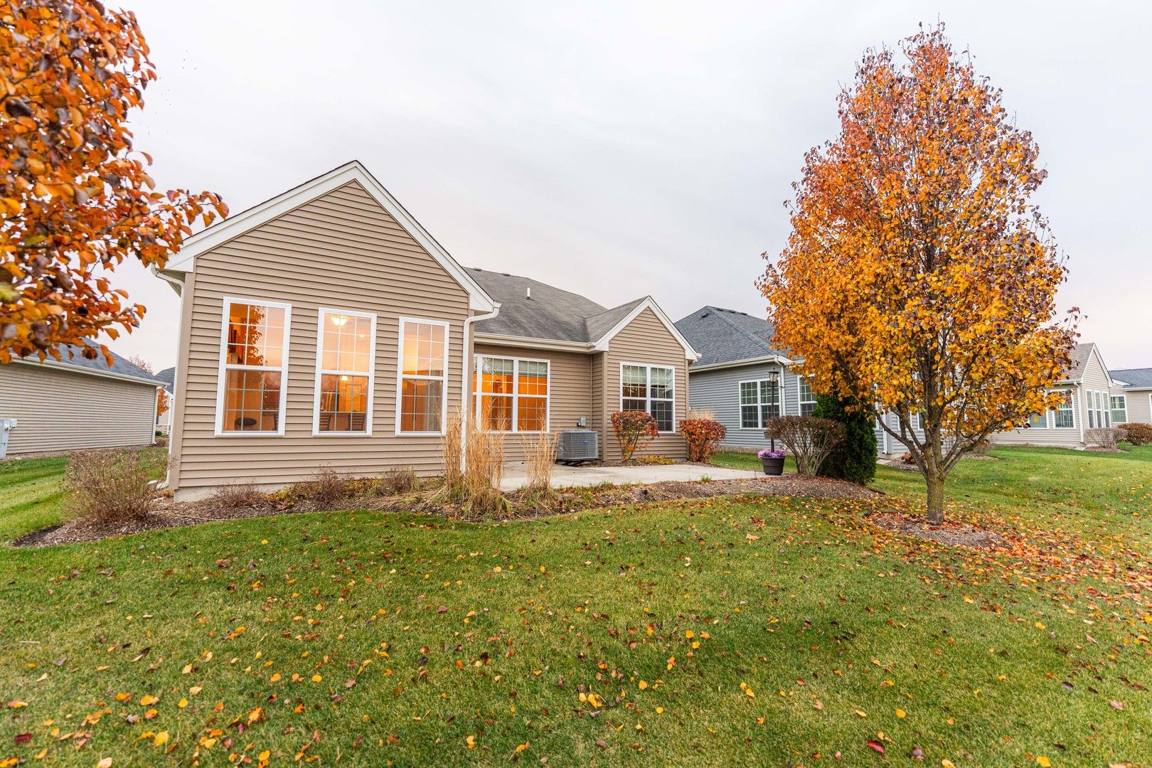 NEW YEAR! NEW HOME!! Quick close is available. NO MORE SHOVELING! NO MORE MOWING LAWNS! TIME TO ENJOY RETIREMENT! If you like the idea of low maintenance living, but like the freedom of a single family home, this place is for you! Welcome to the 55 and up community of Carillon. This very popular Monte Carlo model has 2 car heated garage, 2 bedrooms and an office as well as A LARGE SUN ROOM! The kitchen features vaulted ceilings, granite counters, and glass backsplash. You have a dining area AS WELL as an eating area in the kitchen, making it a great set up for entertaining! Need some quiet time? Curl up with a book in the sunroom and enjoy all of the bright light streaming in. Enjoy a relaxing soak in the walk-in tub by Ella Bubbles (installed 2023). The living room and office feature motorized blinds which can be controlled with a remote or your phone. The Aprilaire Humidifer was installed in 2024. Carpet installed 2025. If you are an outdoor person, you can enjoy grilling with a gas grill hook up in the back on your beautiful extended patio. This lot is very private for the area! Mature landscaping and trees make this a relaxing retreat. The community features a 3 hole golf course (exclusively available for residents and their guests), indoor and outdoor swimming pools, work out room, billiards, community room (with loads of activities), tennis/pickleball courts and more! If you enjoy walks, there are sidewalks throughout the community and approximately 2 miles of walking/biking paths around the community ponds. Snow removal and lawn care are included as well in your monthly assessment, allowing you do just move in and relax! Welcome home!