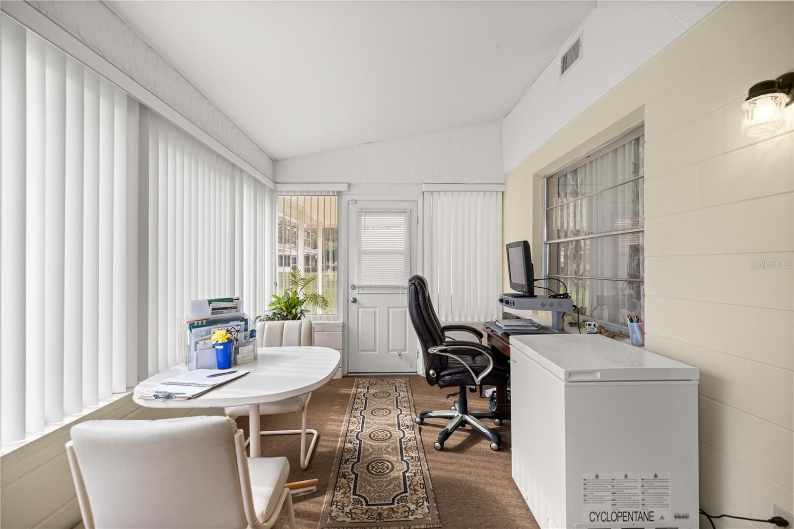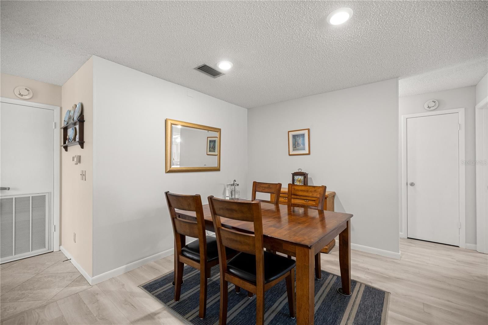 Look no further—step inside this beautifully maintained two-bedroom, two-bath villa with a two-car garage, located in the highly sought-after Premier 55+ community of On Top of the World. This home truly reflects pride of ownership. Gorgeous new luxury vinyl plank flooring throughout the living, dining, and bedroom areas creates a bright, airy, and welcoming atmosphere. The open-concept living space flows seamlessly into the kitchen, which features a large cooking island, stunning stone countertops, and a crisp white backsplash—perfect for both everyday living and entertaining. The guest bathroom is tastefully appointed with a stone-topped vanity and clean white tile surround with tub. The spacious primary suite offers a large walk-in closet and an en-suite bathroom complete with a walk-in shower. Enjoy relaxing on the cozy front porch or unwind in the enclosed Florida room at the rear, featuring all-new windows. Outside, the covered patio is ideal for barbecuing and extends further to accommodate all your outdoor cooking and entertaining needs. Additional highlights include a newer roof and appliances that have all been replaced since 2020, offering peace of mind for years to come. Schedule your showing today to begin your next chapter in this fun filled active community!!