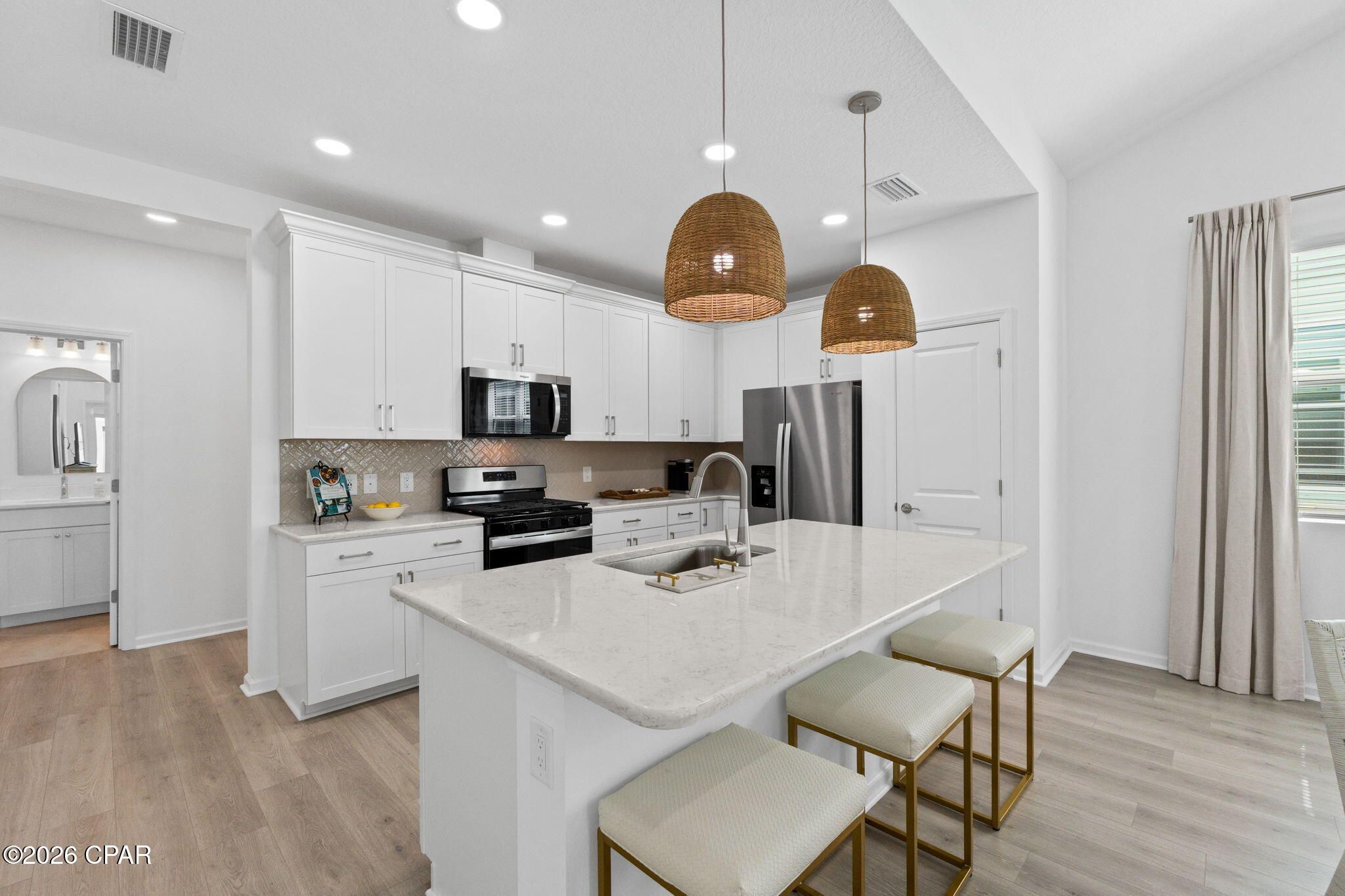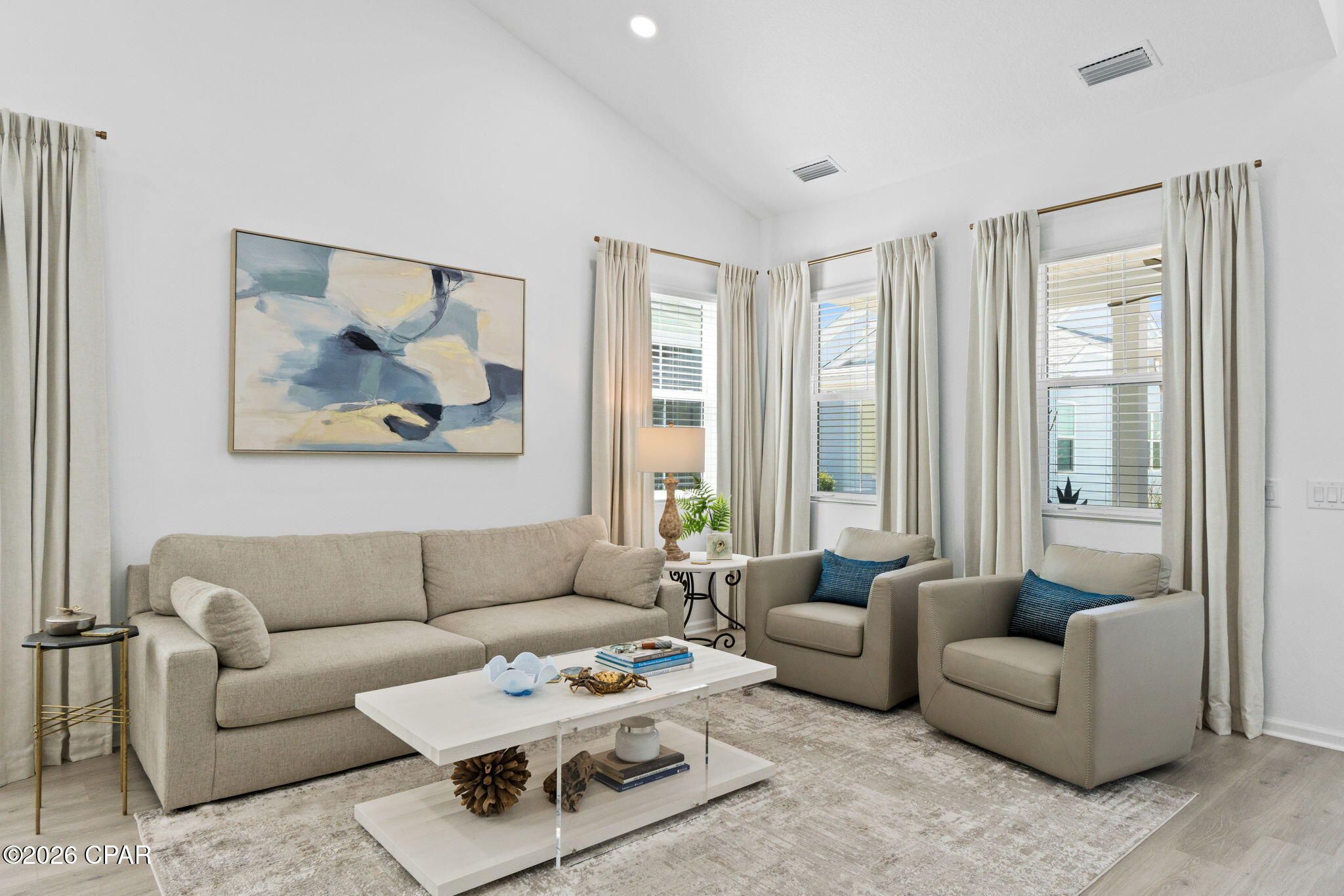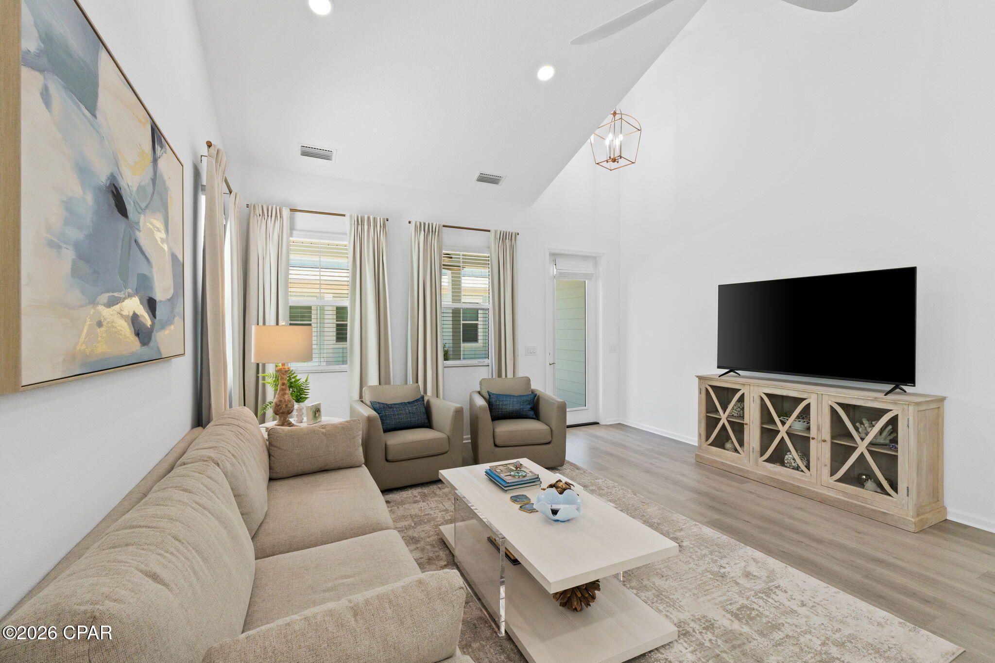 Welcome to Latitude Margaritaville Watersound, where every day feels like a vacation! This gorgeous, FULLY FURNISHED (with a few exclusions), Mango Cottage offers beautiful pond views from the covered front porch and is located in the highly desirable Phase 6BC, one of the community's most charming and picturesque areas. This coastal cottage is highly upgraded and move-in ready. Inside, you'll find an open and inviting layout featuring Revwood by Mohawk flooring, designer lighting and fans, and thoughtful custom touches throughout. The chef-inspired kitchen showcases upgraded cabinetry, quartz countertops, designer tile backsplash, gas range, spacious island, and abundant storage, making it perfect for entertaining or everyday living. Open concept living, family room with soaring cathedral ceiling, lots of windows for a bright inviting space. Primary suite features a spa like bath with dual vanities and large walk-in closet, secondary bedroom with an adjacent bath. The home also features a private den/flex space with sleeper sofa, ideal for guests, an office, or additional living space. Both bathrooms have been enhanced with custom mirrors and stylish finishes, adding to the home's polished coastal feel. Step outside to your covered porch with tranquil pond views, the perfect place to enjoy morning coffee or evening sunsets. Phase 6BC is known for its welcoming atmosphere and its own special gathering spot, ''Flip Flop Square,'' where residents come together for live music, cookouts, and neighborhood gatherings. The area is surrounded by beautiful ponds and scenic walking paths, creating a peaceful coastal setting. Enjoy added peace of mind with a 2-10 structural warranty from the original build date. The Cottages HOA provides exterior maintenance which includes scheduled roof replacement, exterior painting, landscaping, and irrigation, making for easy, low-maintenance living. Residents of Latitude Margaritaville Watersound enjoy an unparalleled resort-style lifestyle with world-class amenities including: • The vibrant Town Center with the Paradise Pool and License to Chill Bar & Grill • Latitude Bar & Chill Restaurant • Fins Up Fitness Center • Pickleball, tennis, and bocce ball courts • Indoor lap pool and wellness facilities • Concerts, events, and daily activities at the Bandshell • Miles of walking, biking, and golf-cart friendly paths • Dog parks, arts & crafts studio, and woodworking shop The community is ideally located near the intracoastal waterway and the future marina, with planned shopping, dining, and a new medical campus/hospital nearby, while still being just minutes from the sugar-white beaches of the Emerald Coast. This beautifully furnished Mango Cottage is a rare opportunity to own a turnkey home in one of the most sought-after phases of Latitude Margaritaville Watersound. Come experience the lifestyle that makes this community so special.