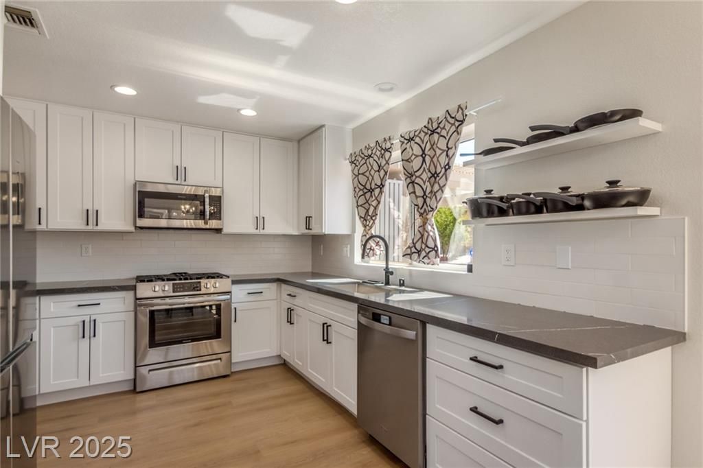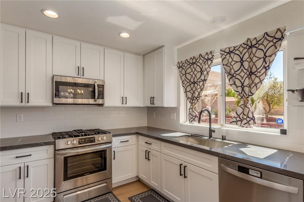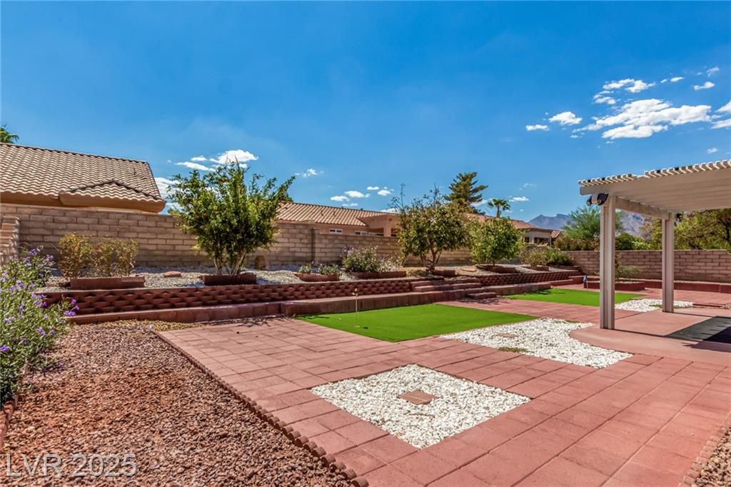 This fully remodeled, single-story gem in Las Vegas’s premier 55+ community is move-in ready & packed with modern upgrades. The home comes furnished, & the furniture has never been used! Discover luxury vinyl plank flooring, a chef-inspired kitchen with shaker cabinets, granite countertops, & stainless steel appliances. The dream backyard featuring a covered patio, mature fruit trees (pomegranate, orange, and lemon), dual-putting greens, & a BBQ area. Additional highlights include an oversized two-car garage with a golf cart ramp, a new water conditioner, and a newer washer, dryer, and water heater. Leased Sun Run solar panels at just $138/month cover 98% of electricity costs, delivering terrific energy efficiency and savings. Located in Sun City Summerlin, this vibrant 55+ community offers an unparalleled lifestyle with access to 4 clubhouses, pools, spas, golf courses, pickleball courts, & social clubs. +++Seller will finance at 1% below bank market rates! +++