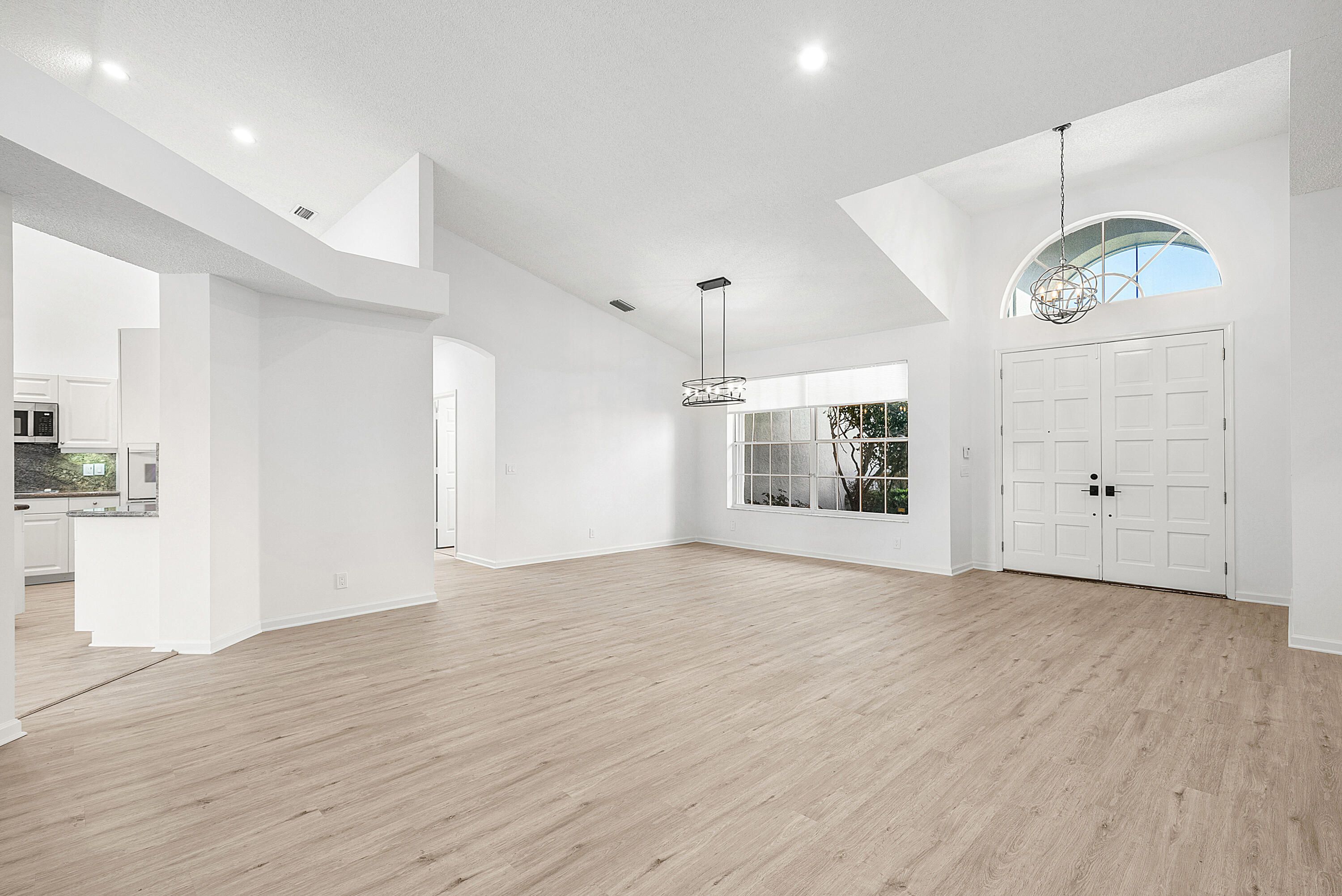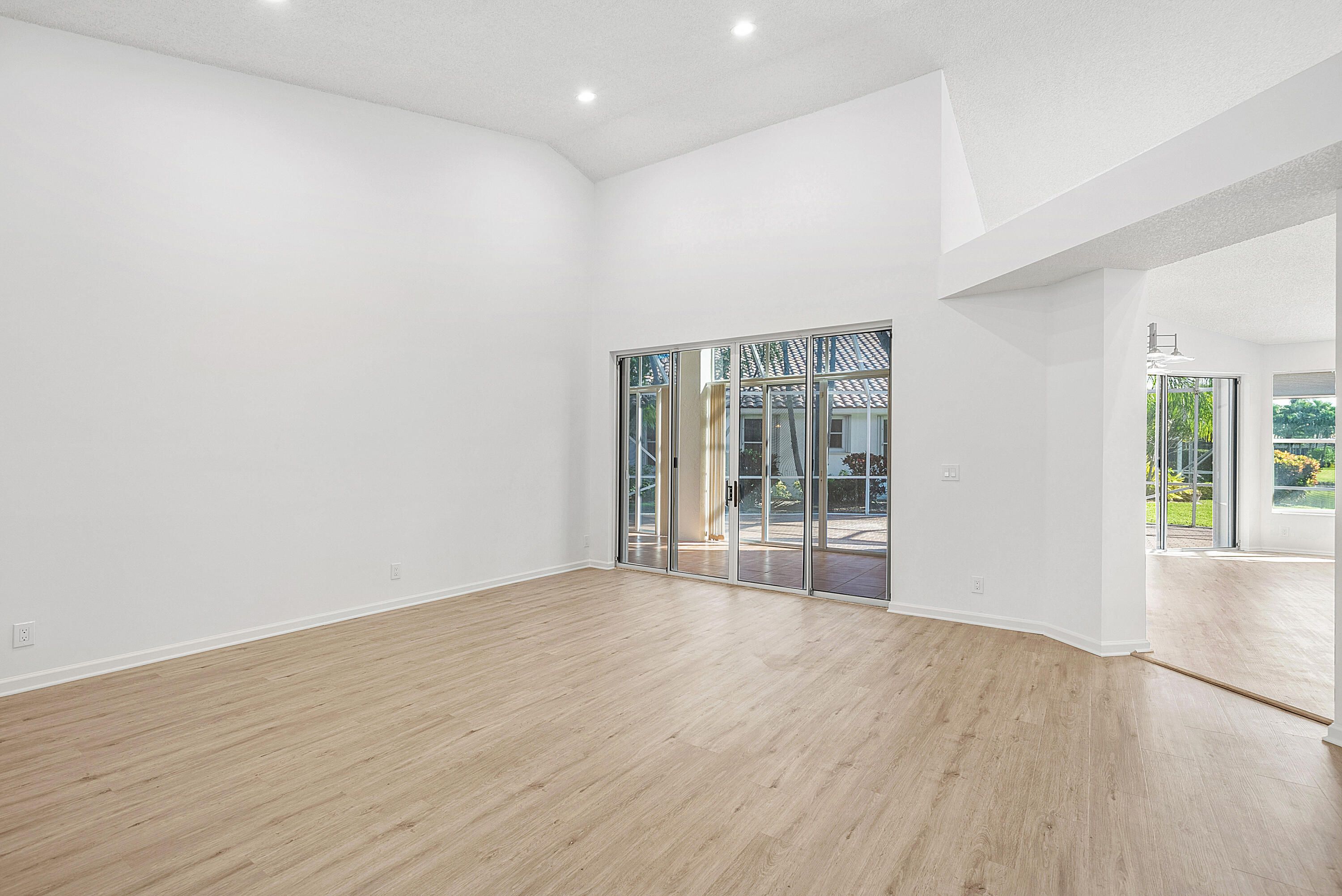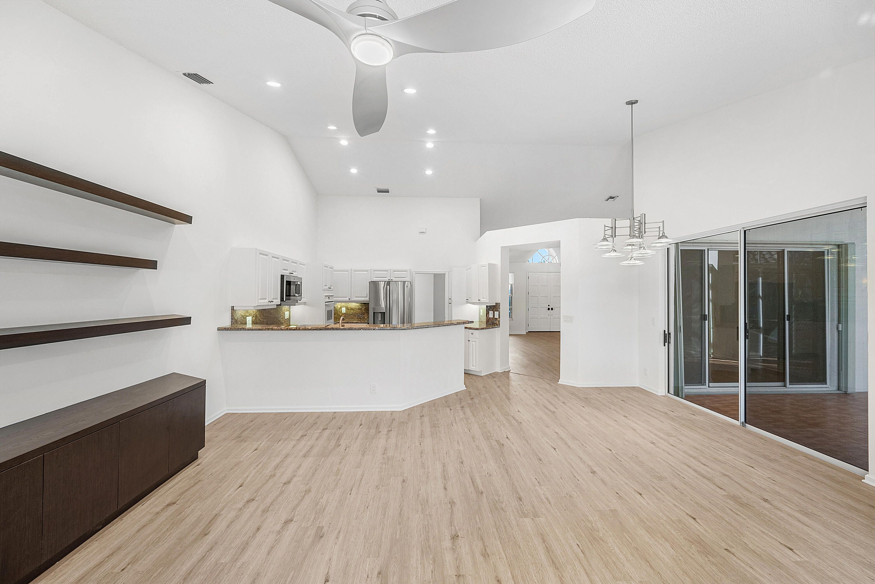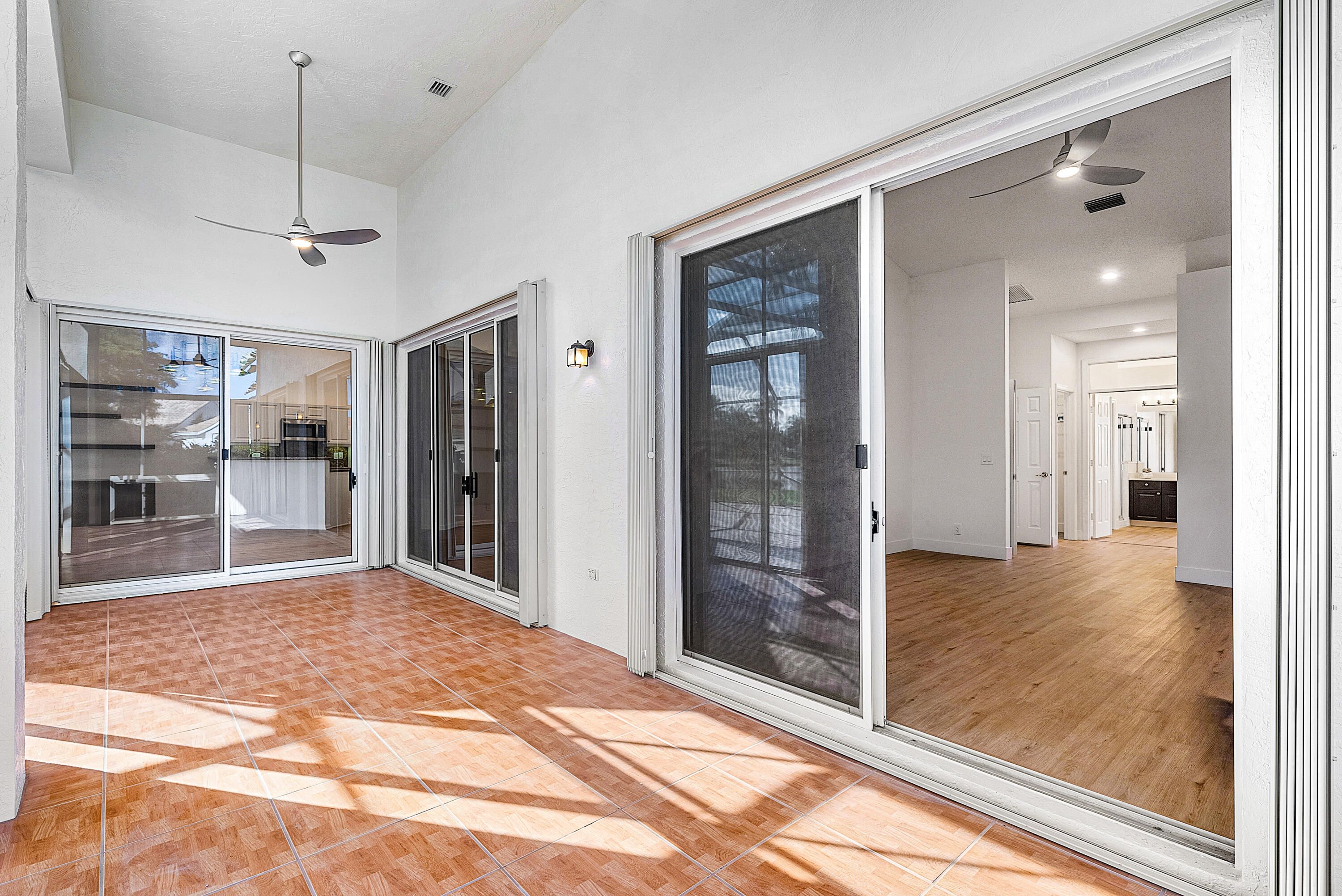 Beautifully maintained 3BR/3BA + Florida room home on a spacious corner lot in the prestigious Aberdeen Golf & Country Club, located in Sterling Lakes, an all ages enclave of only 41 homes. Features include volume/vaulted ceilings, new engineered wood floors (no carpet), fresh interior paint, and abundant natural light. Contemporary kitchen with granite countertops, white shaker cabinets, and new refrigerator/microwave. Primary suite offers walk-in closets, dual vanities, soaking tub, and separate shower. All showers have new flooring. Enjoy lake views from the expansive screened-in patio. Additional highlights: hurricane shutters, impact windows in Florida room, new light fixtures/fans, 2021 tile roof, and newer HVAC systems. Move-in ready and impeccably maintained.