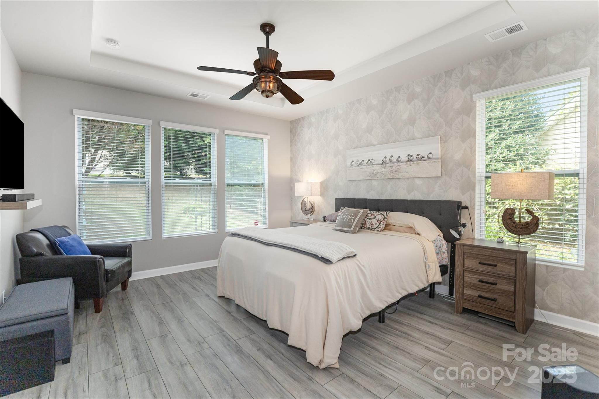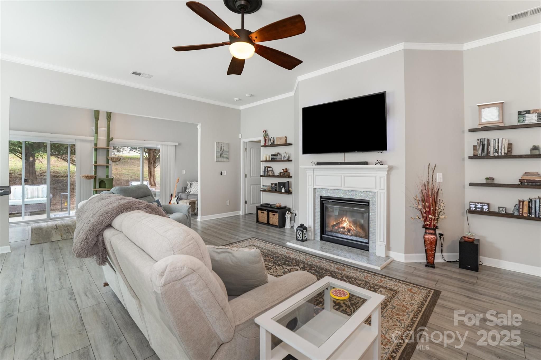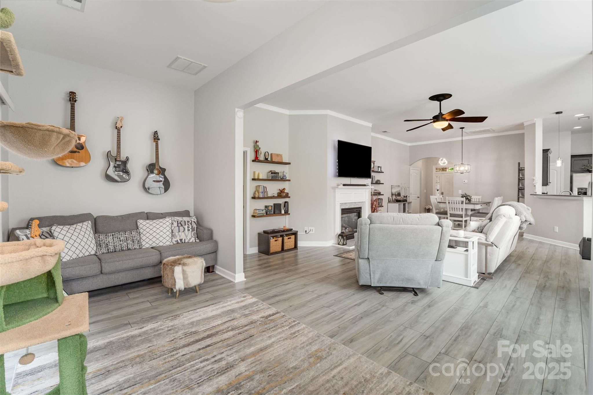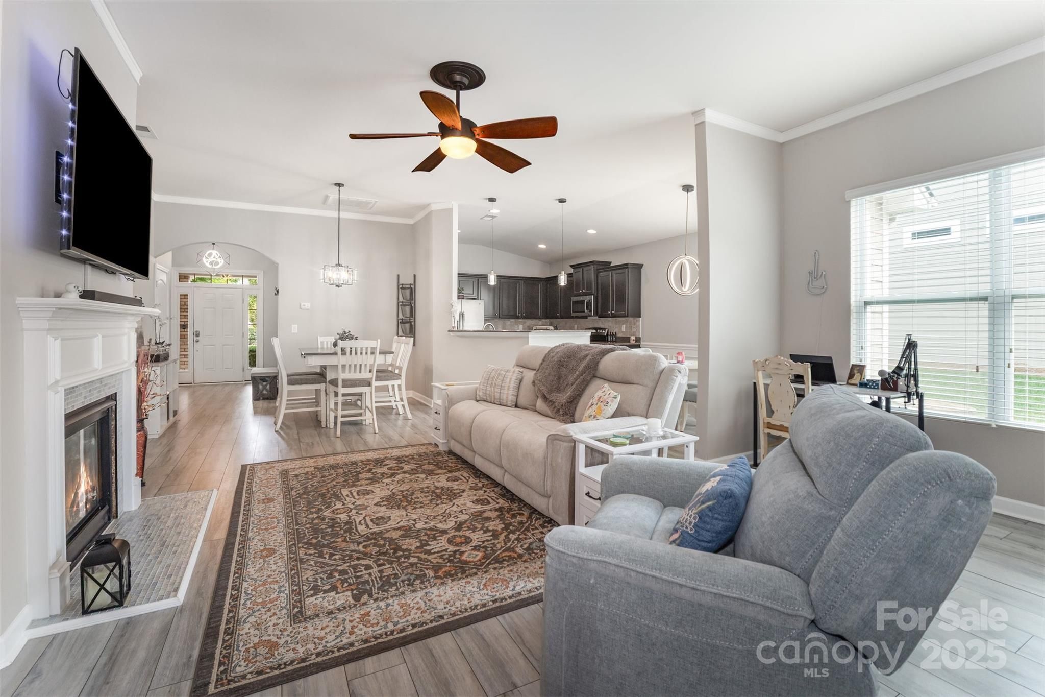 Welcome to this beautifully maintained ranch-style home in The Vineyards on Lake Wylie. The entry opens to a sunlit, open-concept interior designed for easy one-level living. The kitchen features abundant cabinetry, pantry, stainless steel appliances, breakfast bar, and recent upgrades including a new microwave and garbage disposal. The great room includes a gas log fireplace and floating shelves for sleek, modern storage. Sunlit nooks offer flexible spaces for reading, working, or relaxing. Renovations completed two years ago include updated flooring, fresh interior paint, and accent wallpaper in the primary and one guest bedroom for a stylish touch. Two guest bedrooms are located at the front of the home, while the private primary suite at the rear offers a walk-in closet and en-suite bath with dual vanities, soaking tub, and standing shower. Just two minutes from Lake Wylie, enjoy lake access and resort-style amenities including pools, clubhouse, fitness center, boat ramp, tennis courts, trails, dog park, and more. HOA covers lawn care, cable/internet, and trash services. With over 2467 sq ft in the home and 1828 of heated living space, this home is designed for comfort and quality living. Ask about possible up to $2,500 Lender Credit