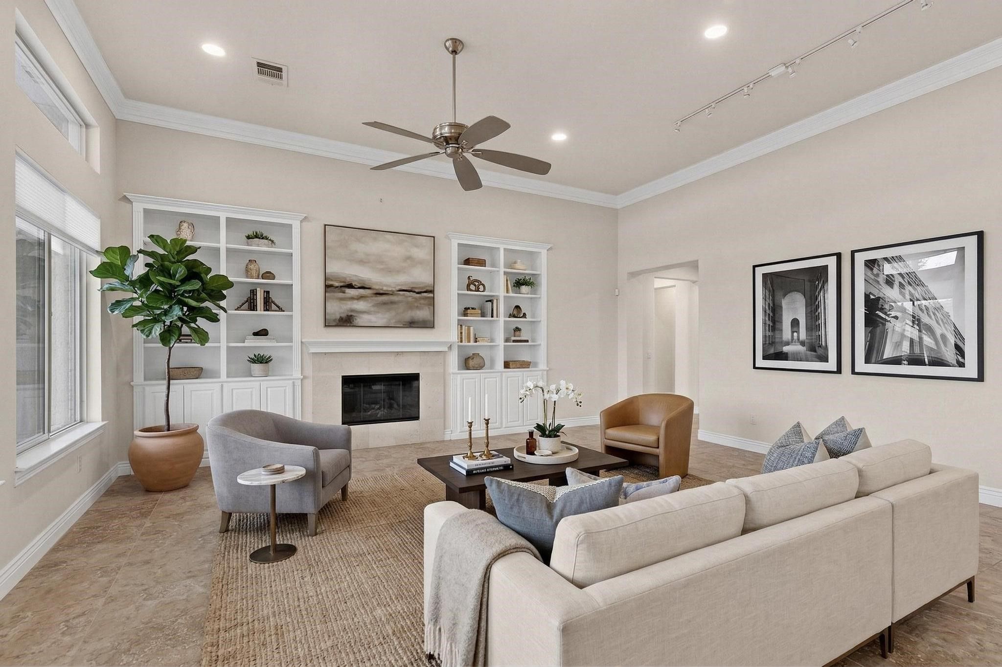 Ready to create your dream golf course retreat? This stucco and stone Navarro backs to the 3rd hole of the North Course and sits just across from the walking path—an unbeatable location. A private courtyard with decorative gate and mature shrubs welcomes you in. Inside, you’ll find tile flooring, crown molding, abundant natural light, and a spacious living room with built-ins, gas fireplace, and golf course views. The kitchen features painted white cabinets, granite countertops, gas cooktop, convection microwave, breakfast nook, and both a butler’s pantry and walk-in pantry. The primary suite offers a boxed bay window, coffee niche, and golf course views, with an ensuite bath including dual sinks, soaking tub, roll-in shower, and large walk-in closet. A private guest suite with courtyard access and a flexible office or den add to the appeal. Enjoy the expanded covered patio with pergola, landscaping, water feature, and fire table—ready for your personal touch. With a little TLC and vision, this home has incredible potential to become a stunning golf course showplace!