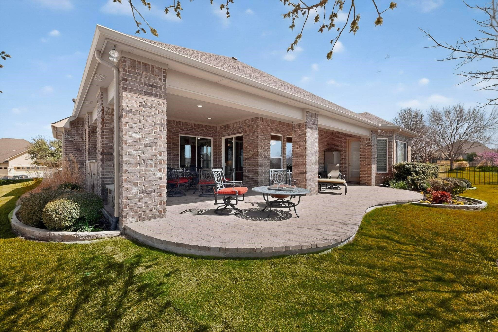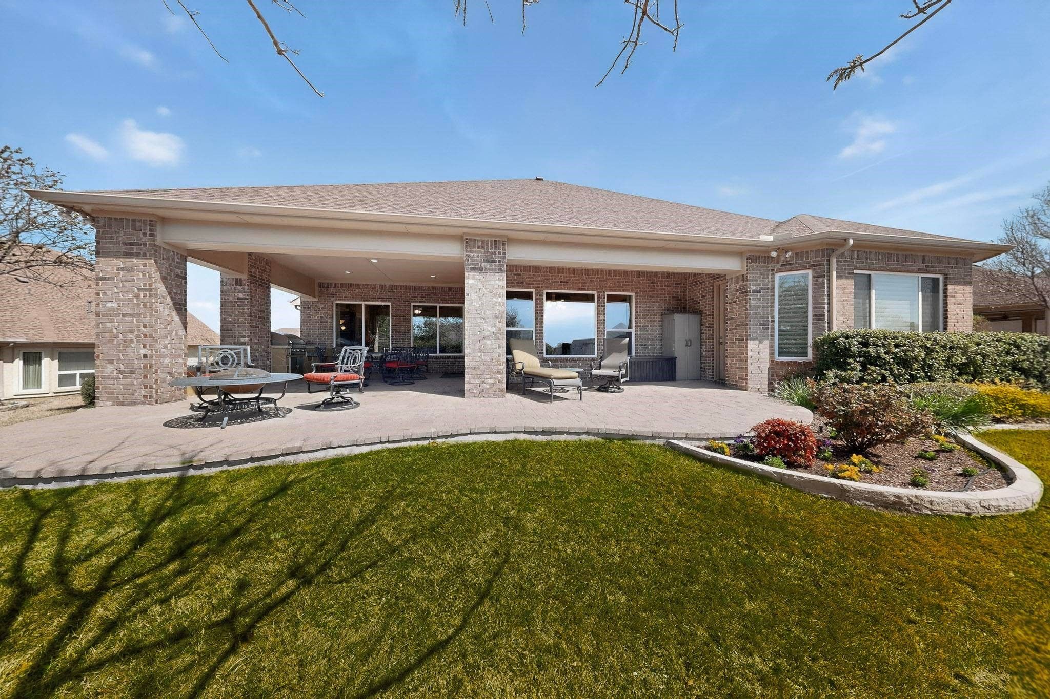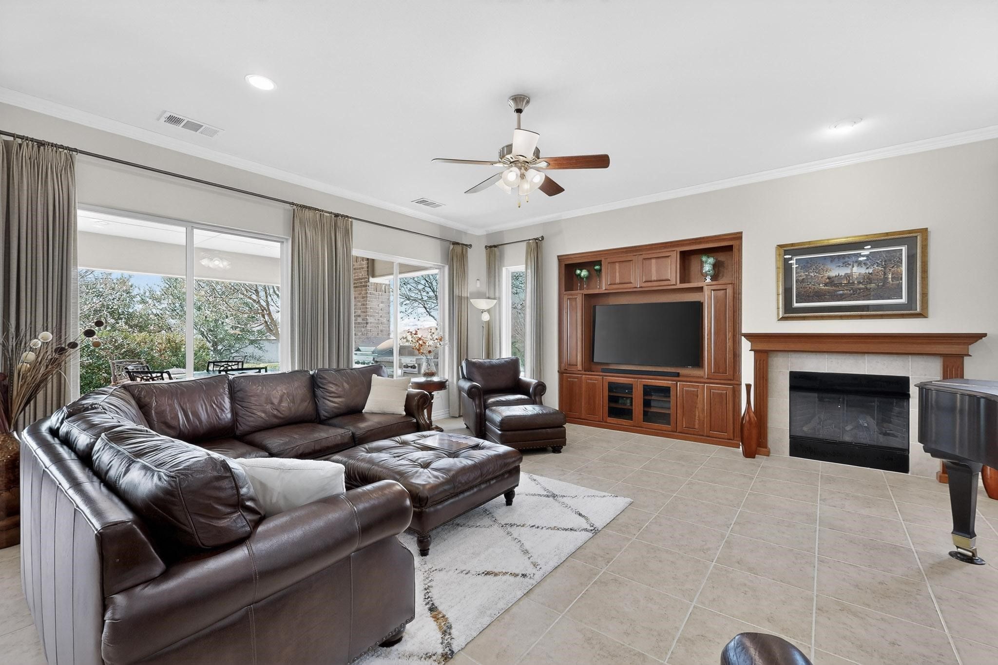 You will be impressed with this meticulously well-maintained home. The all-brick Cabrillo model checks all the boxes. The extended garage is 26 x 24, has cabinets and daylight windows on the doors. The interior is bright and neutral. Enter into a wide foyer with crown molding. The kitchen features cherry cabinets, a large island with seating, under-cabinet lighting, soft-close and dovetailed drawers, a tiled backsplash, roll-out shelves, and hidden trash and recycling bins. The dining area has large windows that overlook the patio and landscape, crown molding and an alcove for a piece of furniture. The spacious living room has a heatilator reveal gas fireplace, crown molding, a fan and a built-in media center with a TV. There are 2 primary suites. The first has a bay window, a custom closet, crown molding, fan, and a furniture nook. The bath features a soaking tub, large rain glass window, spacious counter space, and shower. The second primary has a fan, plantation shutters, a tub-shower combo, a medicine cabinet, and a transom window. The office has French doors, plantation shutters and crown molding. This home has an amazing flex room. It has built-in cabinets, counter space, and a workstation, and is still large enough for a Murphy bed with room to spare. The paver patio is extended. A built-in grill. Privacy shrubs. The roof was replaced in 2018 with hail resistance class 4 Armour shingles. Water heater 2019. Smart thermostats 2022. The coil on the main AC. was replaced in 2019. The attic has storage. Variable speed fan was added to the HVAC unit. Washer, dryer, and both fridges stay with the home.