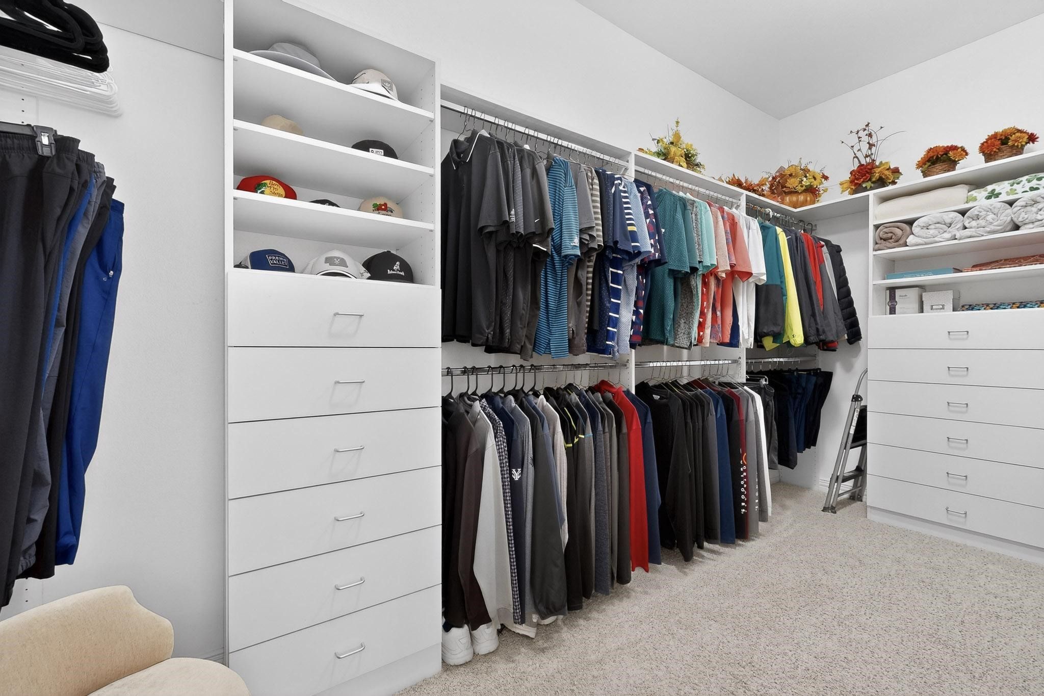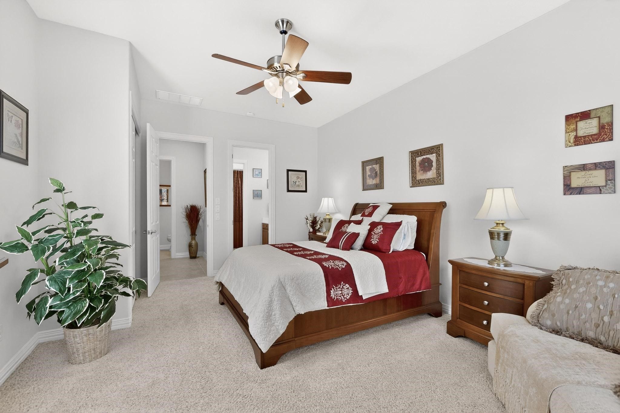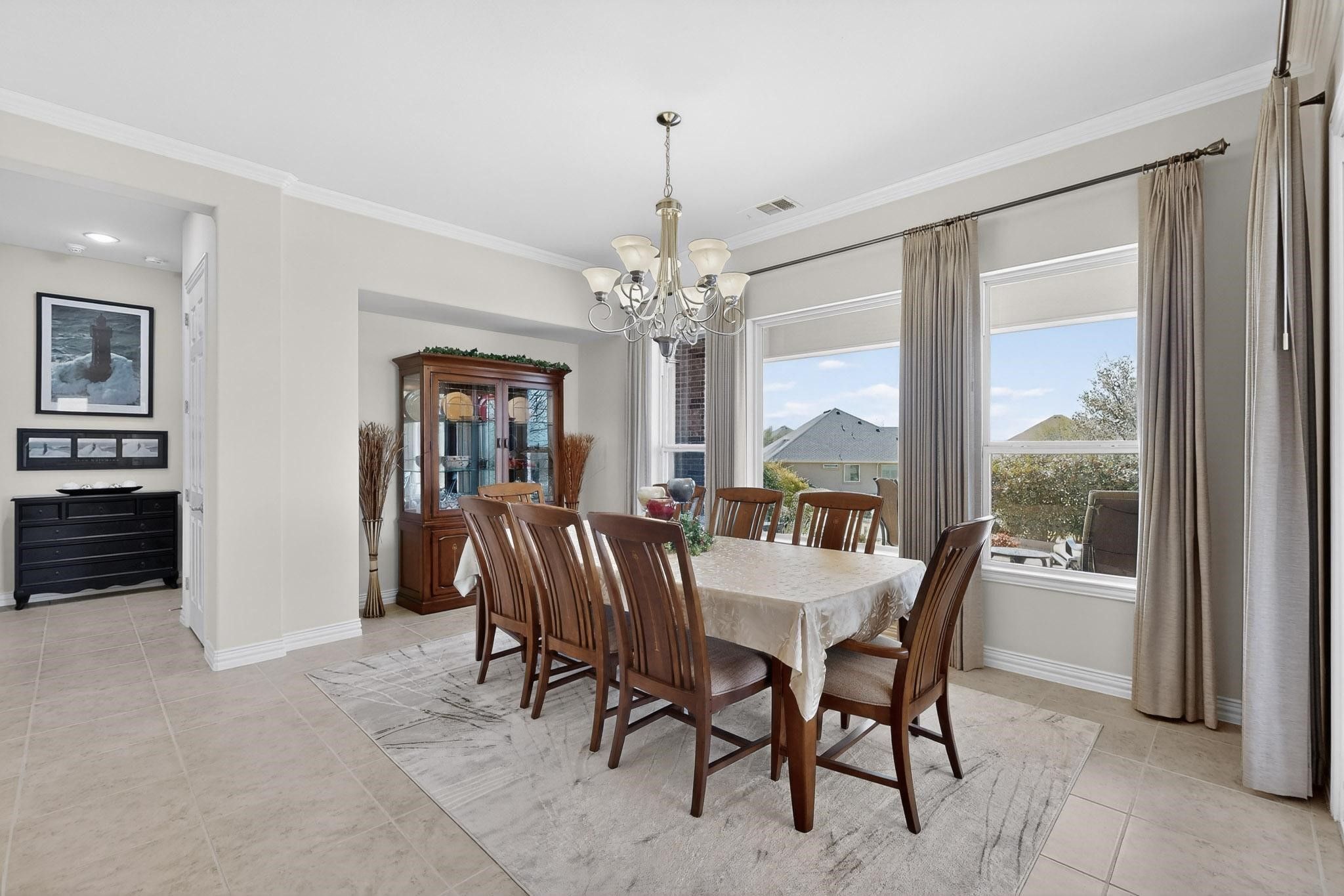 You will be impressed with this meticulously well-maintained home. The all-brick Cabrillo model checks all the boxes. The extended garage is 26 x 24, has cabinets and daylight windows on the doors. The interior is bright and neutral. Enter into a wide foyer with crown molding. The kitchen features cherry cabinets, a large island with seating, under-cabinet lighting, soft-close and dovetailed drawers, a tiled backsplash, roll-out shelves, and hidden trash and recycling bins. The dining area has large windows that overlook the patio and landscape, crown molding and an alcove for a piece of furniture. The spacious living room has a heatilator reveal gas fireplace, crown molding, a fan and a built-in media center with a TV. There are 2 primary suites. The first has a bay window, a custom closet, crown molding, fan, and a furniture nook. The bath features a soaking tub, large rain glass window, spacious counter space, and shower. The second primary has a fan, plantation shutters, a tub-shower combo, a medicine cabinet, and a transom window. The office has French doors, plantation shutters and crown molding. This home has an amazing flex room. It has built-in cabinets, counter space, and a workstation, and is still large enough for a Murphy bed with room to spare. The paver patio is extended. A built-in grill. Privacy shrubs. The roof was replaced in 2018 with hail resistance class 4 Armour shingles. Water heater 2019. Smart thermostats 2022. The coil on the main AC. was replaced in 2019. The attic has storage. Variable speed fan was added to the HVAC unit. Washer, dryer, and both fridges stay with the home.
