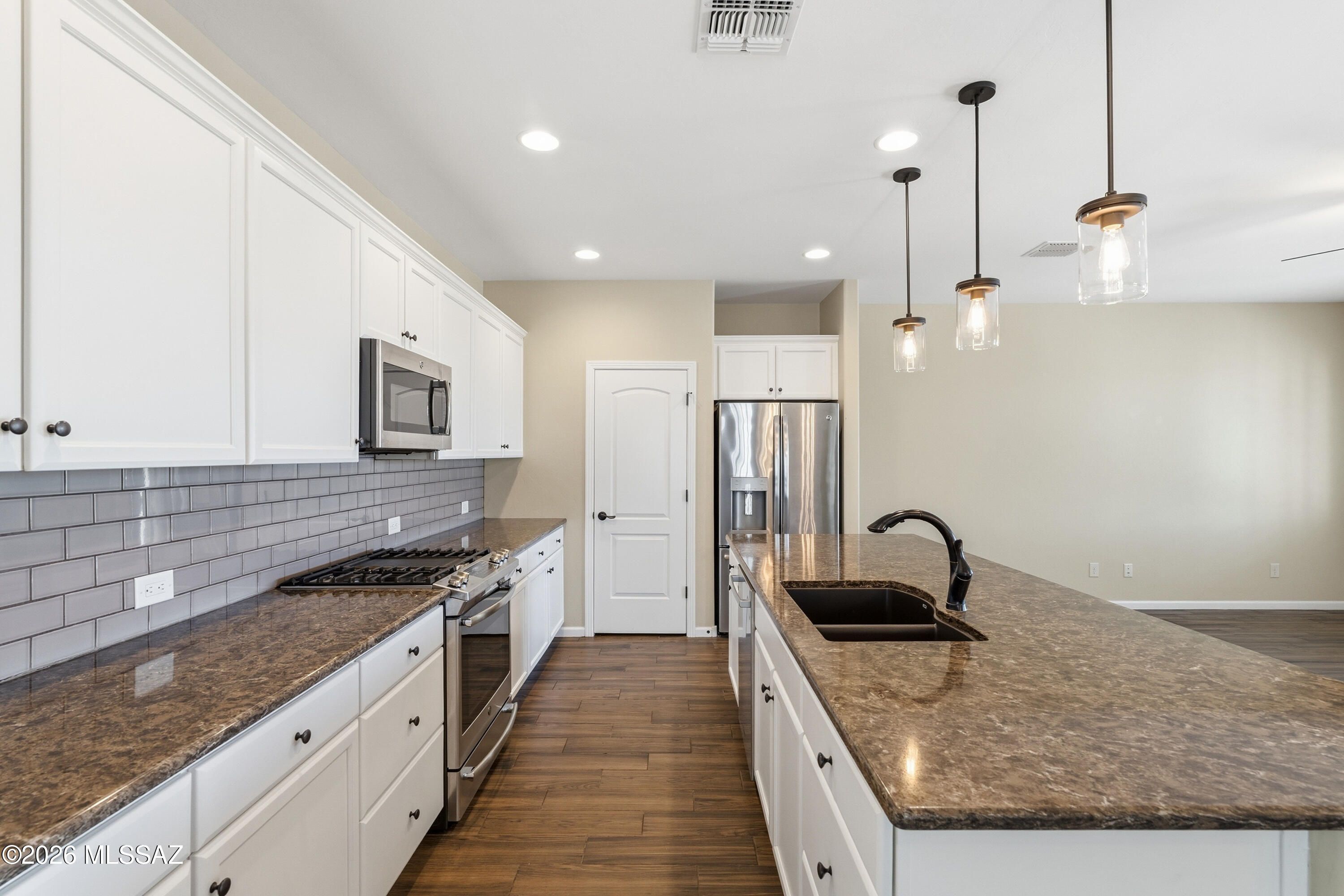 This beautifully maintained Primrose Villa in Quail Creek is ideally situated on desirable Broken Hills Drive, offering panoramic desert and mountain views and low maintenance resort style living. With 1,447 sq. ft., this home features 2 BR, 2 BA, plus a versatile Den in a popular split-bedroom floor plan designed for comfort and privacy. The spacious great room provides open-concept living and dining with abundant natural light and seamless access to the rear patio, perfect for enjoying the stunning views. The upgraded kitchen is both stylish and functional, showcasing granite countertops, upgraded white cabinetry, tile backsplash, stainless steel appliances, a slide-in gas range, composite sink, pantry closet, and center island with breakfast bar and pendant lighting.