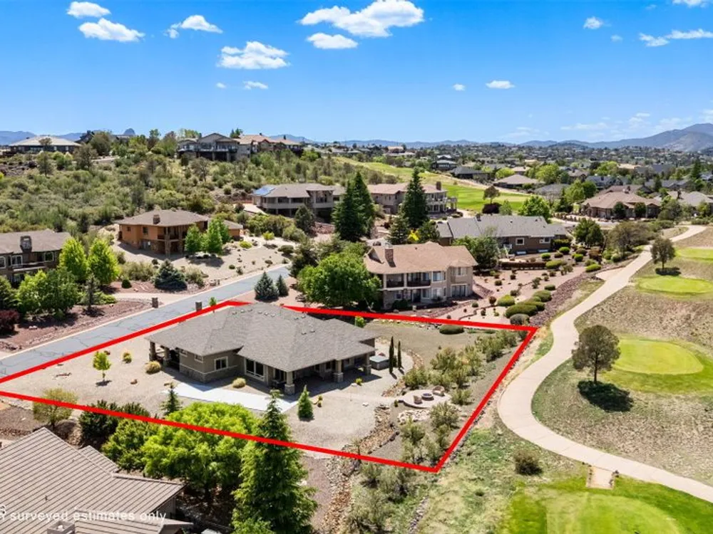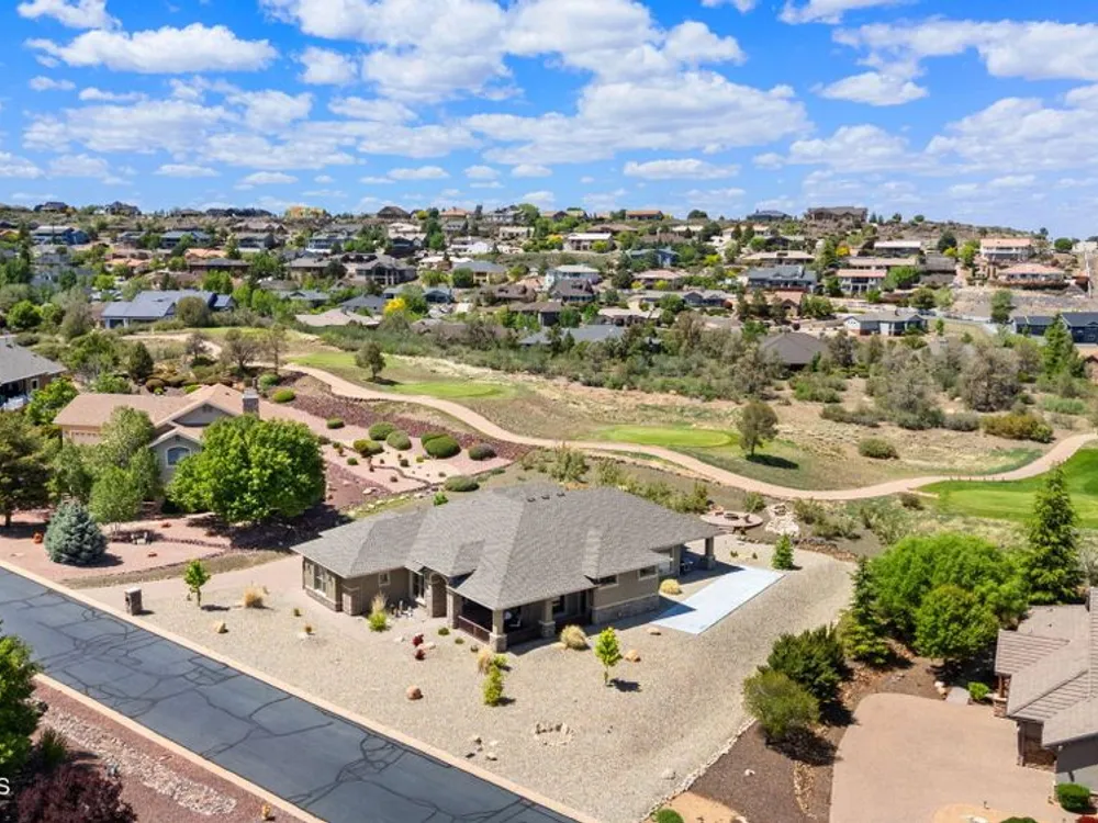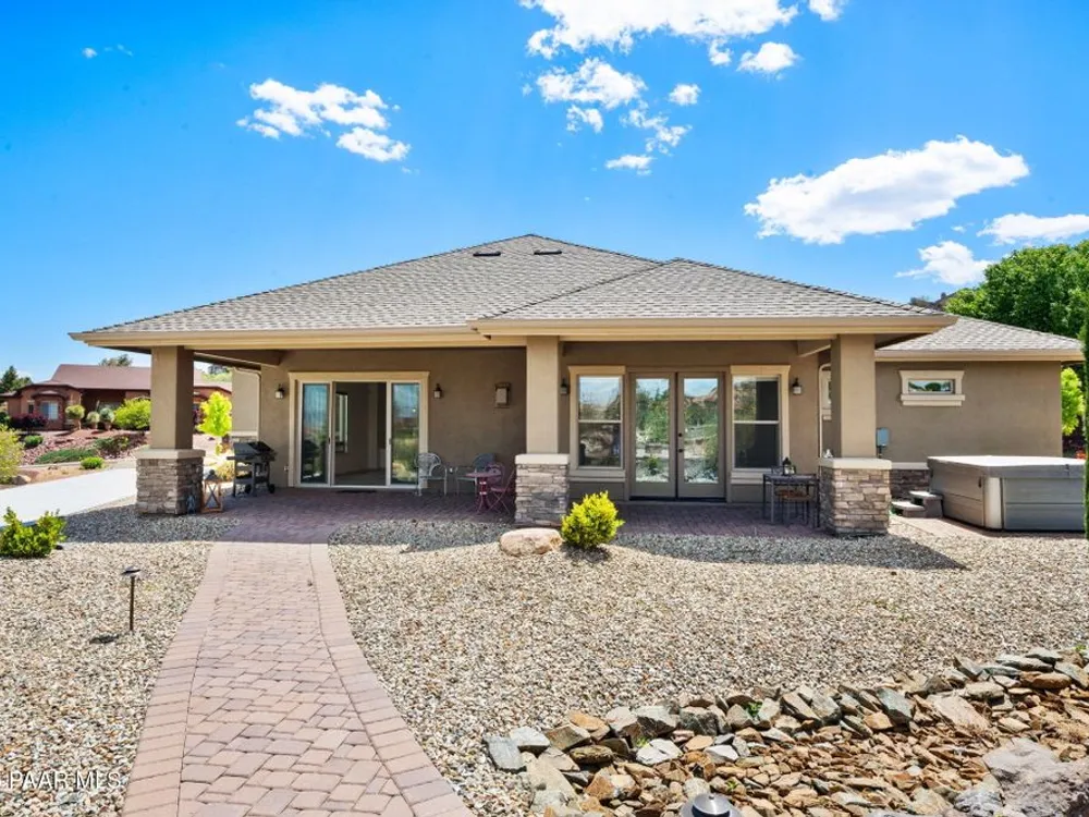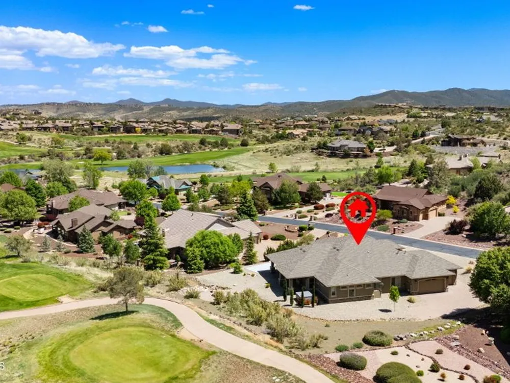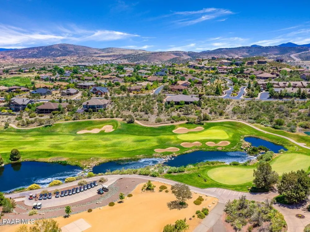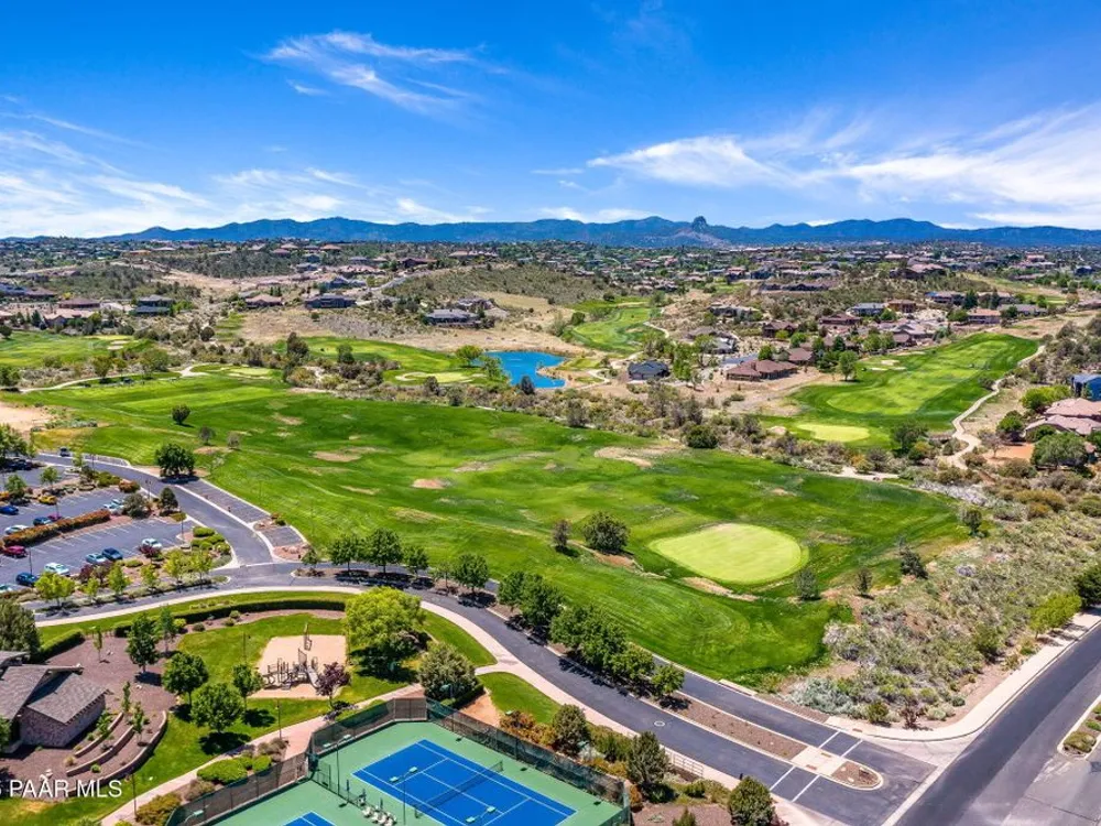 One level home on .59 private acres bordering the 6th hole of the golf course with jaw-dropping views of the San Francisco Peaks and Granite Dells in The Estates, Prescott Lakes' prestigious gated community. Built in 2021 by luxury builder, Carrington Homes, this 3,163 square foot custom home welcomes you with a covered front paver patio with views of the distant mountains. The foyer leads to open concept living with a fresh white kitchen with quartzite counters and walk-in pantry, a casual dining area with views, large formal dining area, large den or 4th bedroom and an expansive living room with rock-faced fireplace and sliders opening to a backyard paradise with fire pit, spa and a concrete pad for shuffleboard, al fresco dining area or raised garden beds. The huge primary suite has sliders to the rear patio and a dreamy bath with dual vanities, a soaking tub, a large walk-in shower and two walk-in closets. The second bedroom has an ensuite bath and the third bedroom has a full bath in the hallway. Neutral paint and luxury vinyl flooring throughout. Enjoy the vibrant Prescott Lakes lifestyle with a top-flight Hale Irwin Signature Golf course, restaurant, pickleball, tennis, walking and biking trails, fitness facility, indoor & outdoor pools, steam & massage rooms. Walk or ride your golf cart to the club and other community amenities. Near Basis charter and Prescott Unified public schools, Willow & Watson Lakes, Dignity Health's east and west campuses, VA campus and historic downtown Prescott's vibrant shops, restaurants and special events. There are 3 HOA fees for The Estates: $93.60 per quarter, Master Plan $90 per quarter and Athletic Club of $161.40 per month. Buyer customarily pays the Initiation Fee ( 1/2 of 1% of total sales price) to Prescott Lakes Athletic Club.