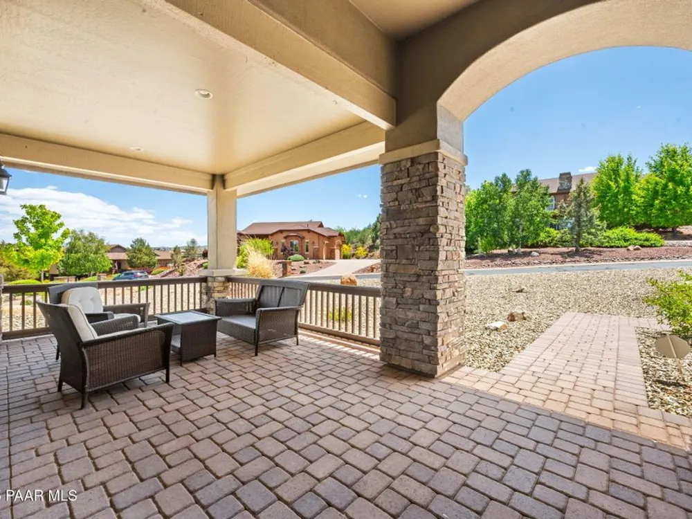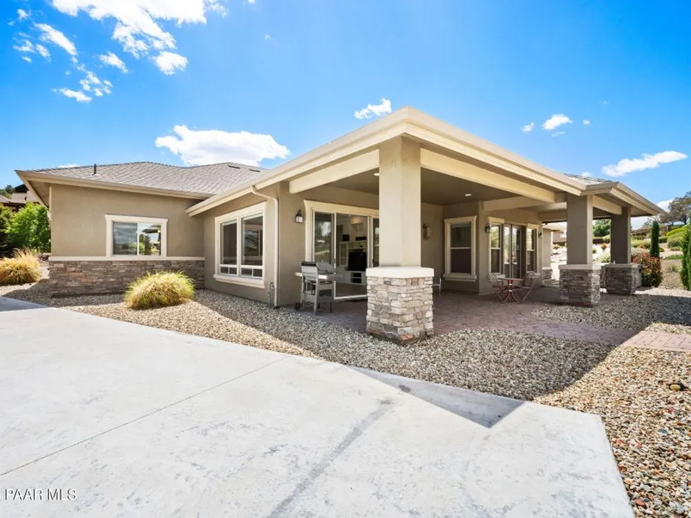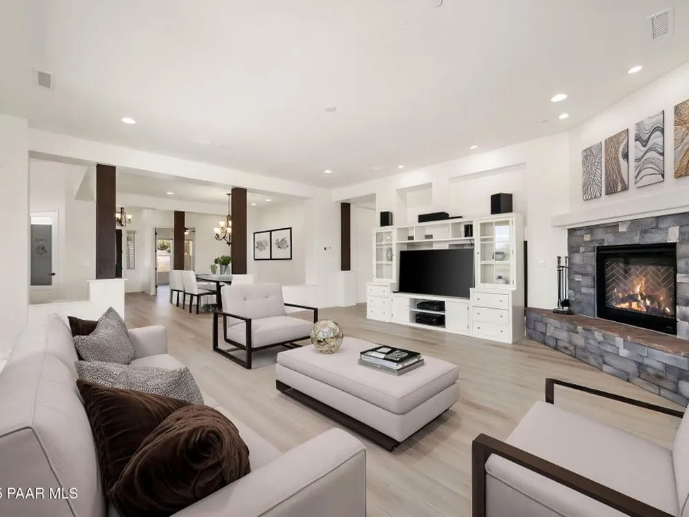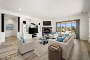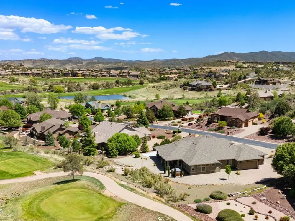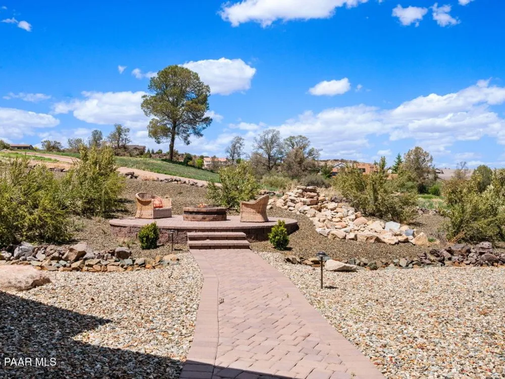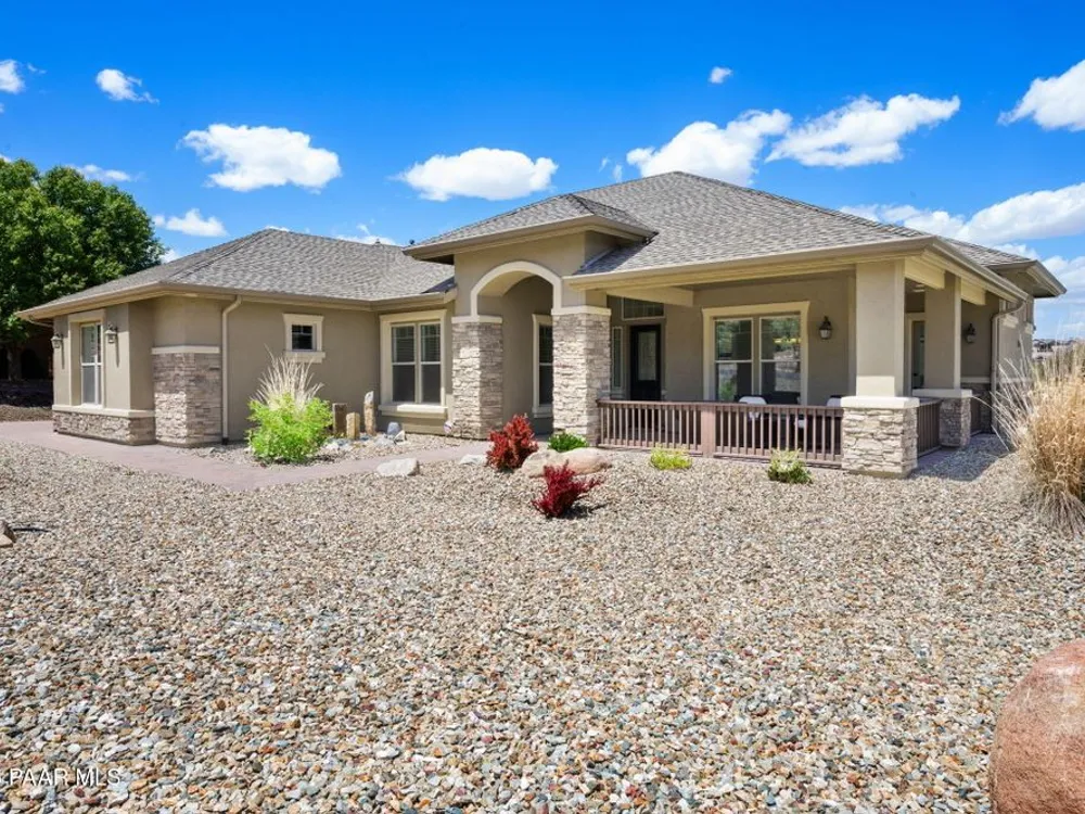 One level home on .59 private acres bordering the 6th hole of the golf course with jaw-dropping views of the San Francisco Peaks and Granite Dells in The Estates, Prescott Lakes' prestigious gated community. Built in 2021 by luxury builder, Carrington Homes, this 3,163 square foot custom home welcomes you with a covered front paver patio with views of the distant mountains. The foyer leads to open concept living with a fresh white kitchen with quartzite counters and walk-in pantry, a casual dining area with views, large formal dining area, large den or 4th bedroom and an expansive living room with rock-faced fireplace and sliders opening to a backyard paradise with fire pit, spa and a concrete pad for shuffleboard, al fresco dining area or raised garden beds. The huge primary suite has sliders to the rear patio and a dreamy bath with dual vanities, a soaking tub, a large walk-in shower and two walk-in closets. The second bedroom has an ensuite bath and the third bedroom has a full bath in the hallway. Neutral paint and luxury vinyl flooring throughout. Enjoy the vibrant Prescott Lakes lifestyle with a top-flight Hale Irwin Signature Golf course, restaurant, pickleball, tennis, walking and biking trails, fitness facility, indoor & outdoor pools, steam & massage rooms. Walk or ride your golf cart to the club and other community amenities. Near Basis charter and Prescott Unified public schools, Willow & Watson Lakes, Dignity Health's east and west campuses, VA campus and historic downtown Prescott's vibrant shops, restaurants and special events. There are 3 HOA fees for The Estates: $93.60 per quarter, Master Plan $90 per quarter and Athletic Club of $161.40 per month. Buyer customarily pays the Initiation Fee ( 1/2 of 1% of total sales price) to Prescott Lakes Athletic Club.