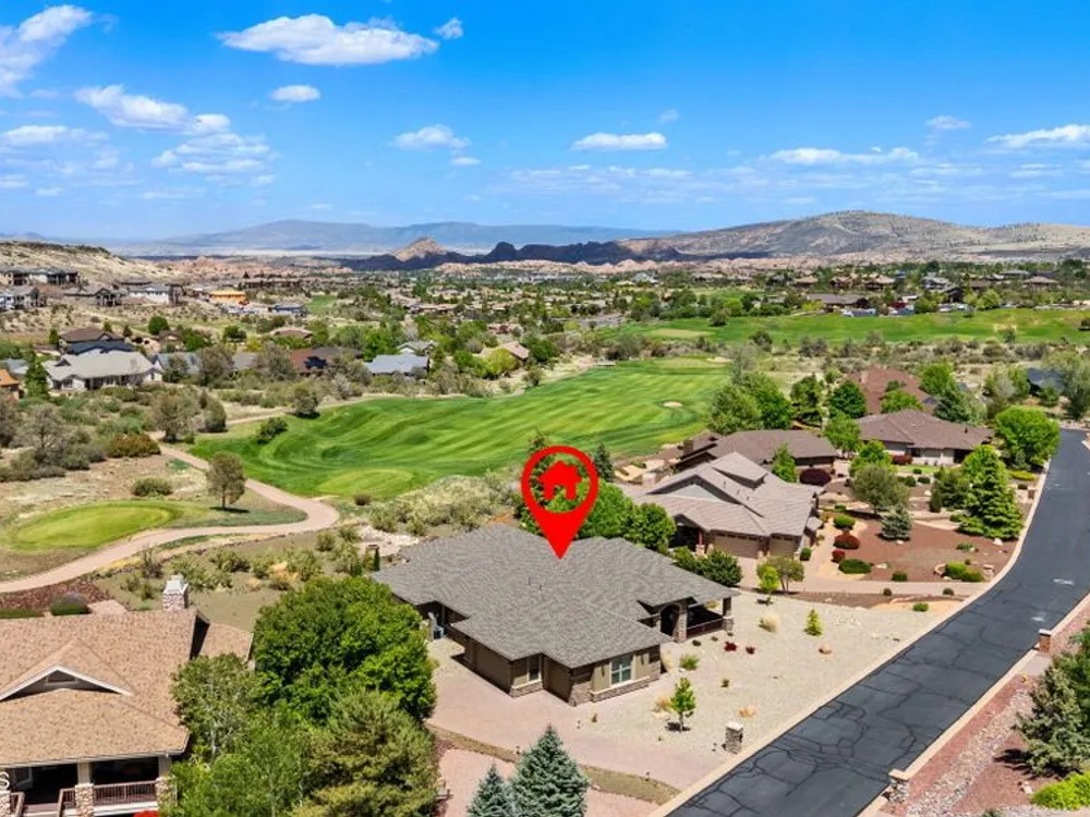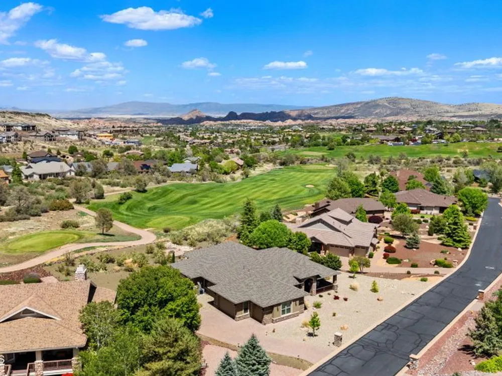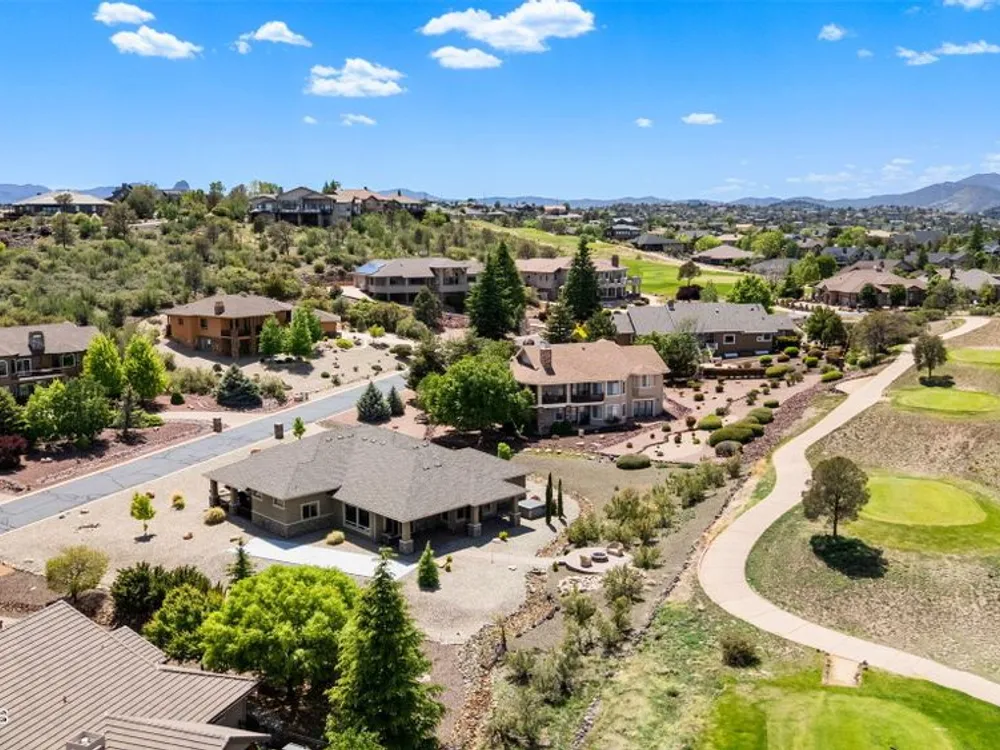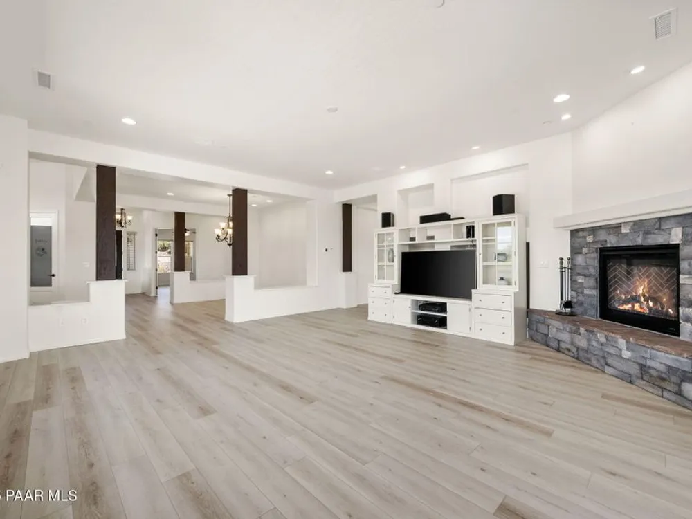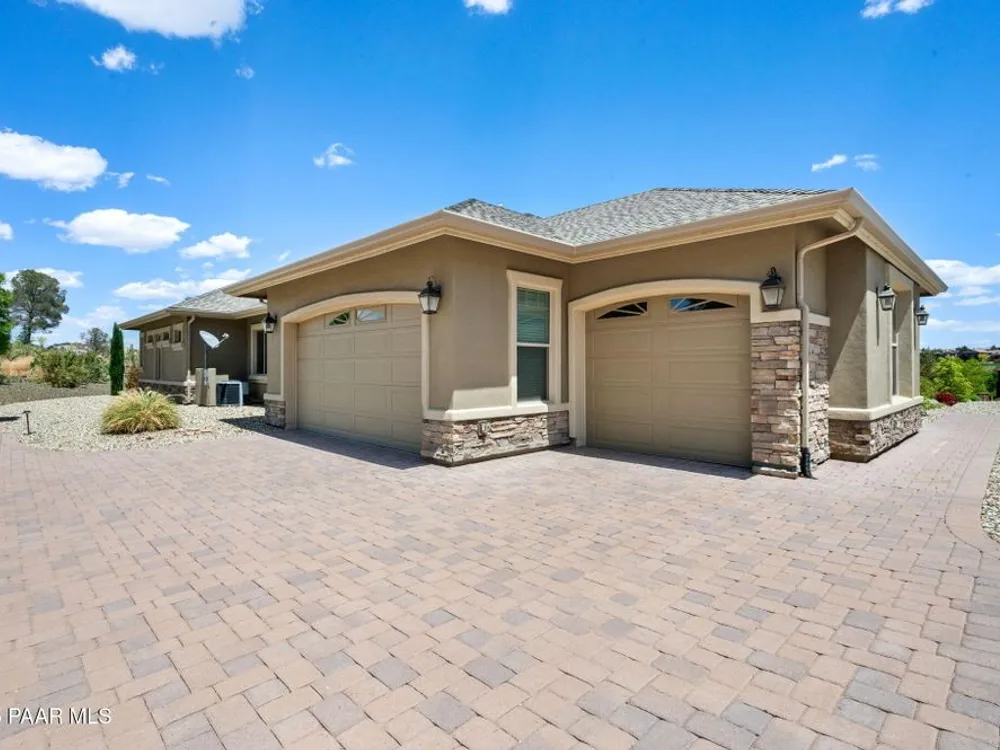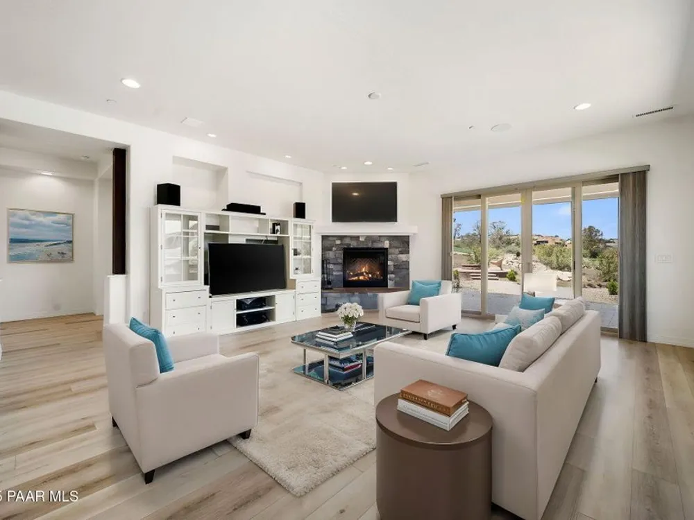 One level home on .59 private acres bordering the 6th hole of the golf course with jaw-dropping views of the San Francisco Peaks and Granite Dells in The Estates, Prescott Lakes' prestigious gated community. Built in 2021 by luxury builder, Carrington Homes, this 3,163 square foot custom home welcomes you with a covered front paver patio with views of the distant mountains. The foyer leads to open concept living with a fresh white kitchen with quartzite counters and walk-in pantry, a casual dining area with views, large formal dining area, large den or 4th bedroom and an expansive living room with rock-faced fireplace and sliders opening to a backyard paradise with fire pit, spa and a concrete pad for shuffleboard, al fresco dining area or raised garden beds. The huge primary suite has sliders to the rear patio and a dreamy bath with dual vanities, a soaking tub, a large walk-in shower and two walk-in closets. The second bedroom has an ensuite bath and the third bedroom has a full bath in the hallway. Neutral paint and luxury vinyl flooring throughout. Enjoy the vibrant Prescott Lakes lifestyle with a top-flight Hale Irwin Signature Golf course, restaurant, pickleball, tennis, walking and biking trails, fitness facility, indoor & outdoor pools, steam & massage rooms. Walk or ride your golf cart to the club and other community amenities. Near Basis charter and Prescott Unified public schools, Willow & Watson Lakes, Dignity Health's east and west campuses, VA campus and historic downtown Prescott's vibrant shops, restaurants and special events. There are 3 HOA fees for The Estates: $93.60 per quarter, Master Plan $90 per quarter and Athletic Club of $161.40 per month. Buyer customarily pays the Initiation Fee ( 1/2 of 1% of total sales price) to Prescott Lakes Athletic Club.
