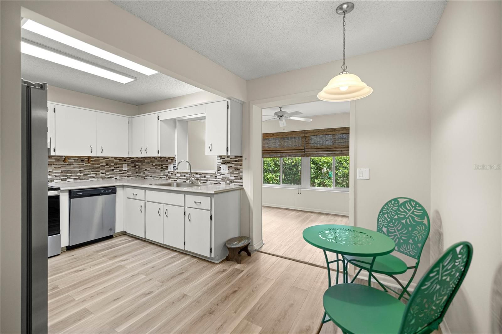 Welcome to this beautifully updated Philadelphian end unit villa, perfectly situated on a spacious corner lot in the sought after 55+ community of On Top of the World. This 2 bedroom, 2 bath home offers low maintenance living with thoughtful updates throughout and an oversized garage that provides ample space for your vehicle, storage needs, or even a golf cart. Step inside to find luxury vinyl plank flooring installed in 2022 that runs seamlessly throughout the home with no carpet anywhere. The remodeled primary bathroom features a sleek walk in shower, floor to ceiling tilework, and a modern vanity. The guest bath includes a full tub with tiled walls, new fixtures, and updated lighting. The second bedroom offers flexibility, making it ideal for hosting guests or setting up a functional home office. The bright and functional kitchen is equipped with brand new stainless steel appliances (2023–2024), convenient pull out drawers, a pantry, and refreshed lighting that ties it all together. You’ll love relaxing in the enclosed lanai, which is heated and cooled and features energy efficient sliding windows (2016) for year round comfort. Major mechanical updates include a 2022 HVAC system, 2021 roof, 2018 water heater, and Leaf Guard gutters with a transferable lifetime warranty. Additional updates include a new garage door, new storm-protected doors installed at the front and back, a new front porch fan, and a solar front lamp (2023), adding both style and practicality to this well cared for home. With so many upgrades, too many to list, you’ll want to check out the attached document for the full list. This home combines comfort, functionality, and peace of mind in one of Florida’s premier active adult communities.