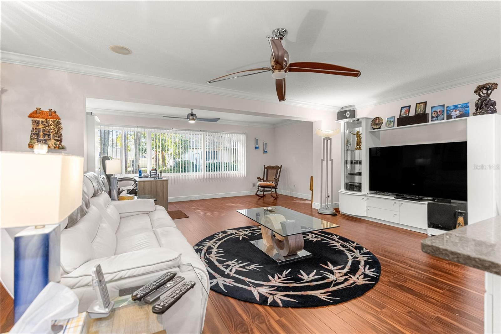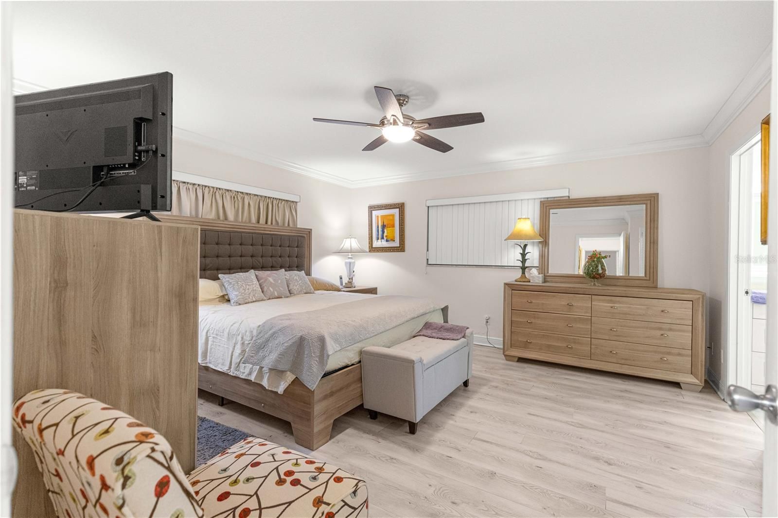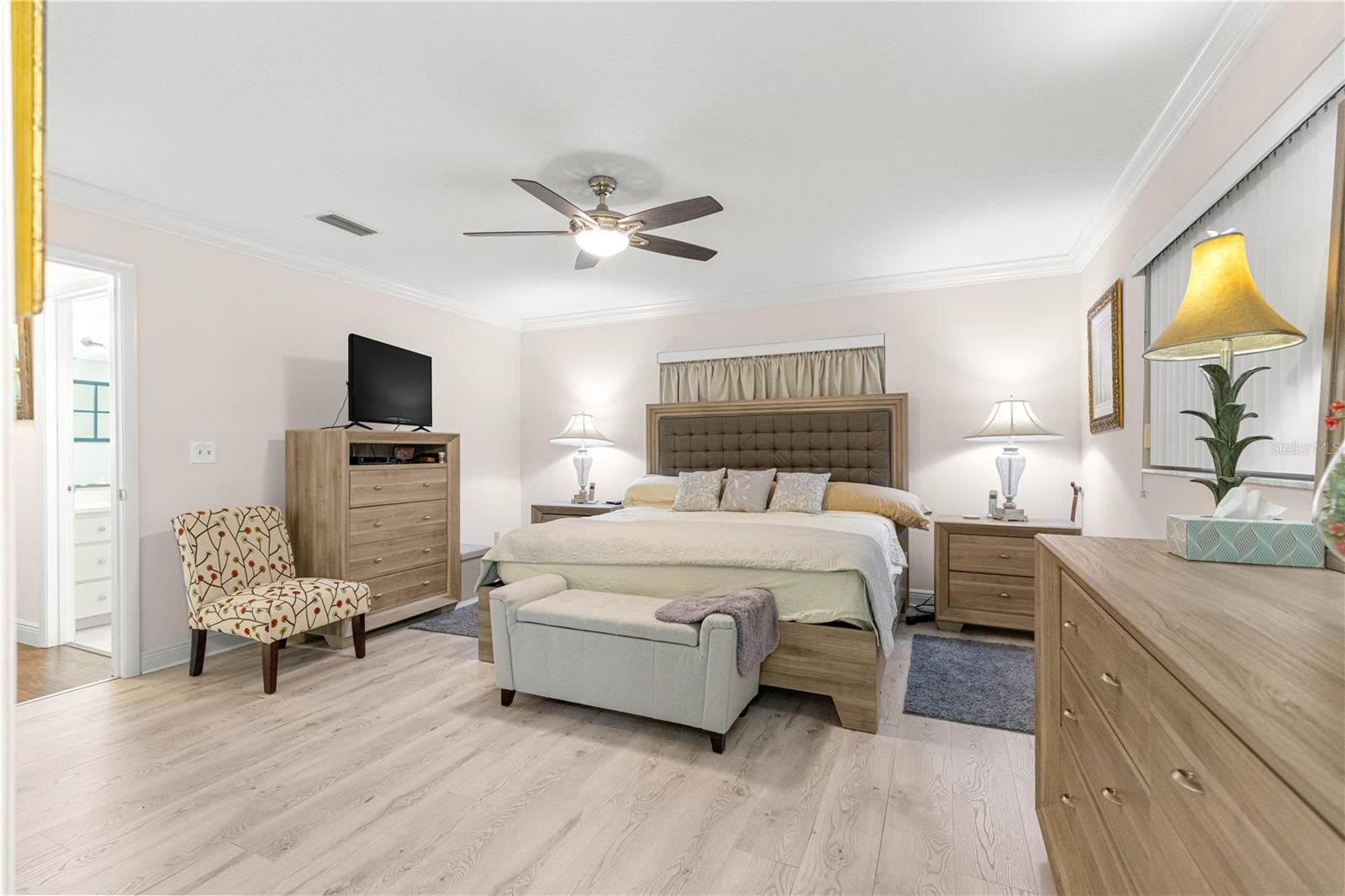 - Ceiling Fan(s), Crown Molding, Eat-in Kitchen, Main Level Primary, Stone Counters, Thermostat, Walk-In Closet(s)