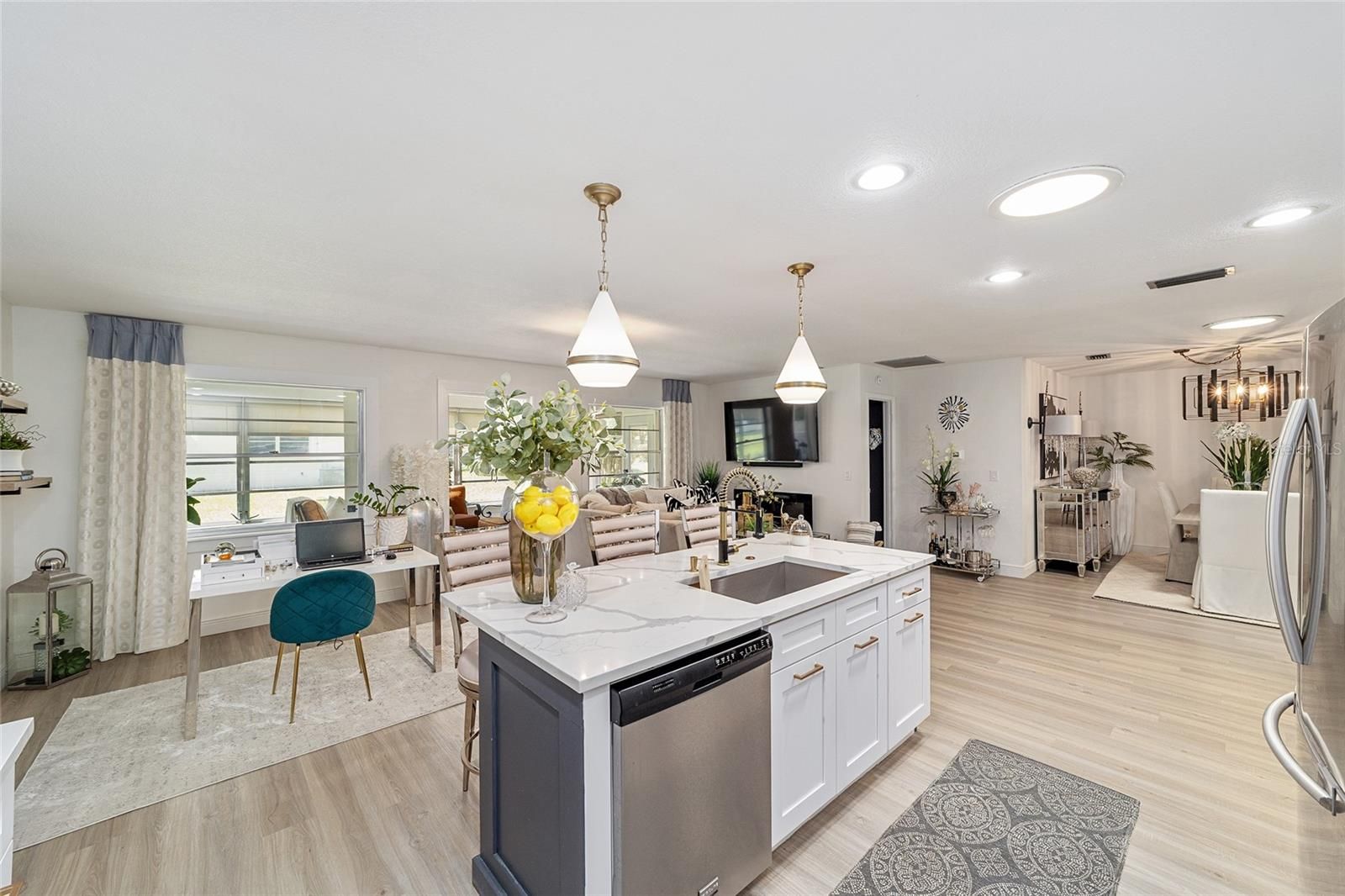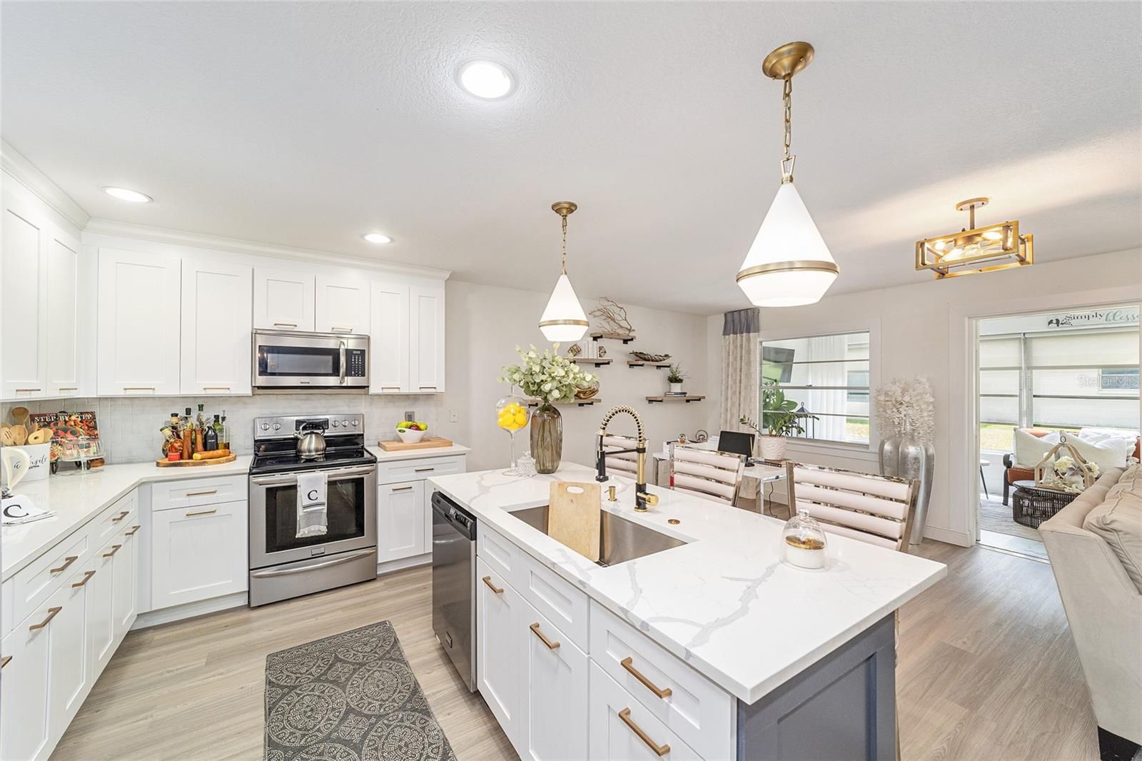 Welcome to this beautifully appointed Bostonian model 2-bedroom, 2-bathroom home in the sought-after Friendship Village neighborhood of On Top Of The World. This magazine worthy residence blends timeless charm with modern updates to create a welcoming and functional space you’ll love coming home to. Major upgrades include a new roof (2018), solar panels (2023) for energy efficiency, luxury vinyl plank flooring, and updates throughout. The popular Bostonian floor plan offers a bright, open-concept layout that flows effortlessly through the living, dining, and kitchen areas—perfect for entertaining or relaxing. A spacious enclosed Florida room provides versatile bonus space for morning coffee, quiet reading, or hosting guests. The beautifully appointed kitchen is both stylish and functional, featuring quartz countertops, a brick backsplash, updated cabinetry, luxury pendant lighting, and a Miseno pull-down faucet. The serene primary suite offers a peaceful retreat with a walk-in closet and a spa-like walk-in shower. Both bedrooms are bright and generously sized, with thoughtful touches throughout. A tranquil screened porch invites you to relax and enjoy Florida’s beautiful weather in comfort and privacy. As part of the active 55+ community of On Top Of The World, you’ll have access to an incredible array of amenities including three swimming pools, dog parks, mini golf, pickleball courts, a basketball court, Veterans Park, a hobby building for arts and crafts, fitness centers, walking trails, and numerous social clubs. Whether you’re looking to stay active, meet new friends, or simply enjoy peaceful surroundings, this home and community offer it all. Don’t miss your opportunity to own this move-in ready, thoughtfully updated gem—schedule your private showing today!