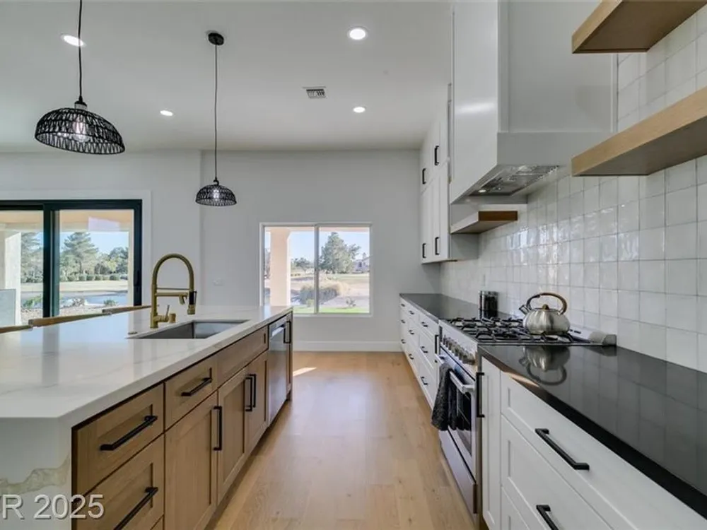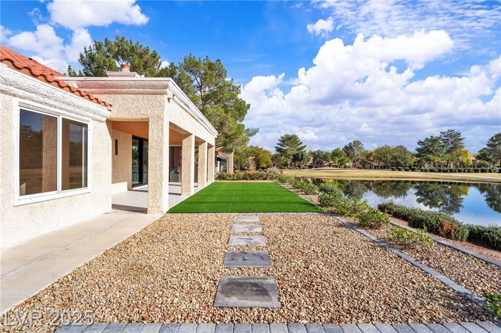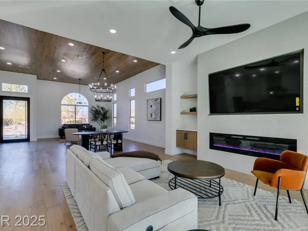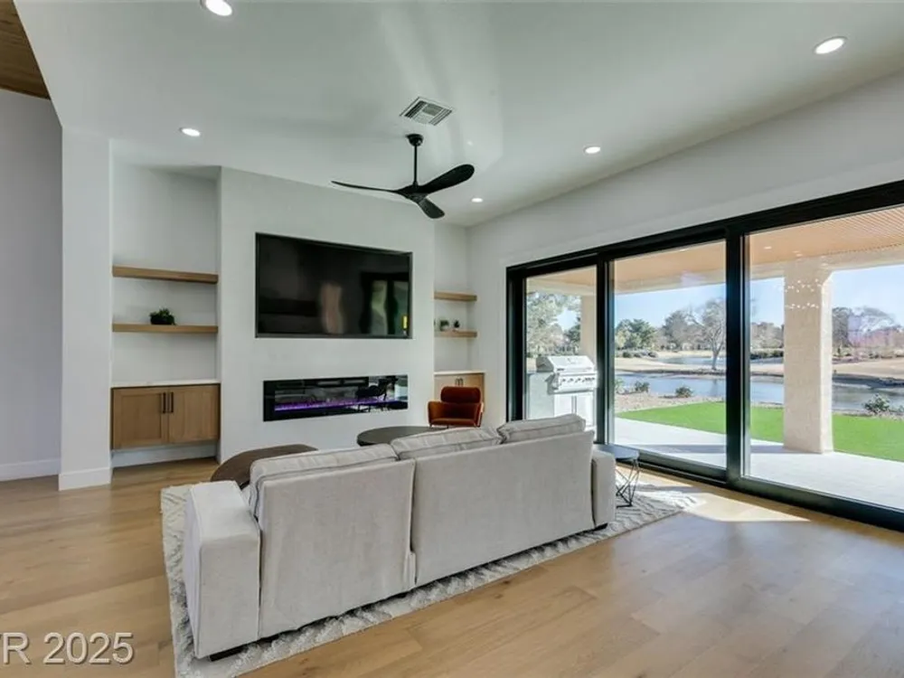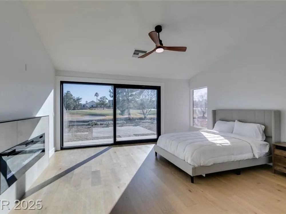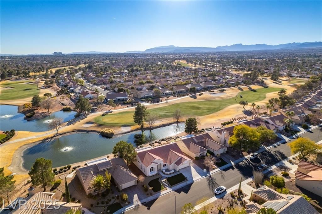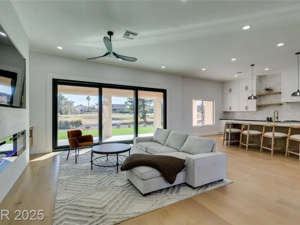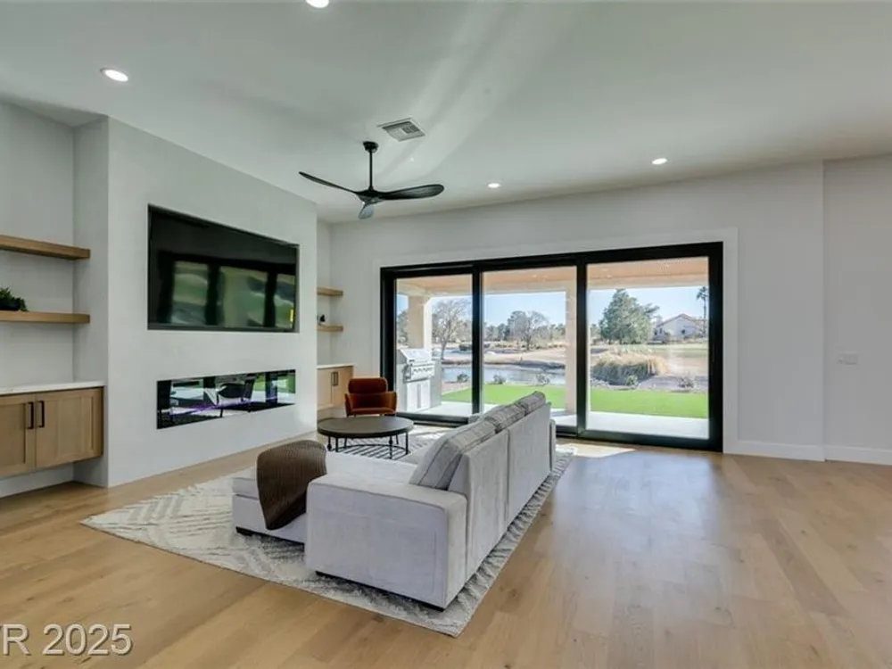 Step into your gorgeous 3 bedroom 2 bath Hacienda with Stellar golf course & lake/water views nestled on the putting green of the golf course in Sun City Summerlin. This spacious residence features high-end finishes, modern amenities throughout, including luxury flooring, high ceilings, 15ft Custom slider patio door that flood the space with natural light. The kitchen features stacked-tile backsplash with high-end stainless steel appliances & designer hood. Large waterfall island in the heart of the home, which acts as a beautiful centerpiece with an adjoining dining & roomy family room has custom built fireplace makes it ideal for gatherings. Primary bedroom offers a peaceful oasis with custom built electric fireplace, walk-in closet & spa-like master bathroom. Backyard has golf course views, covered patio synthetic grass. Nestled in a vibrant 55+ community is your gateway to a dynamic lifestyle, complete with community amenities & nearby trendy eateries and cultural hotspots.