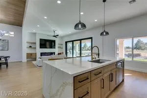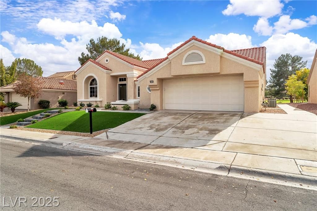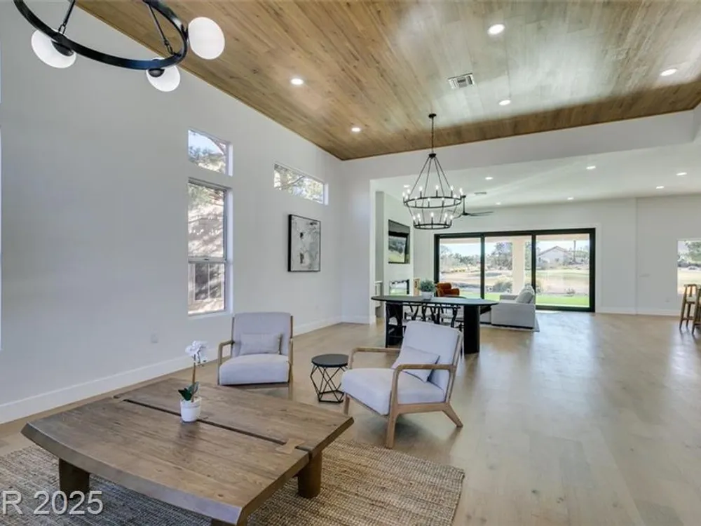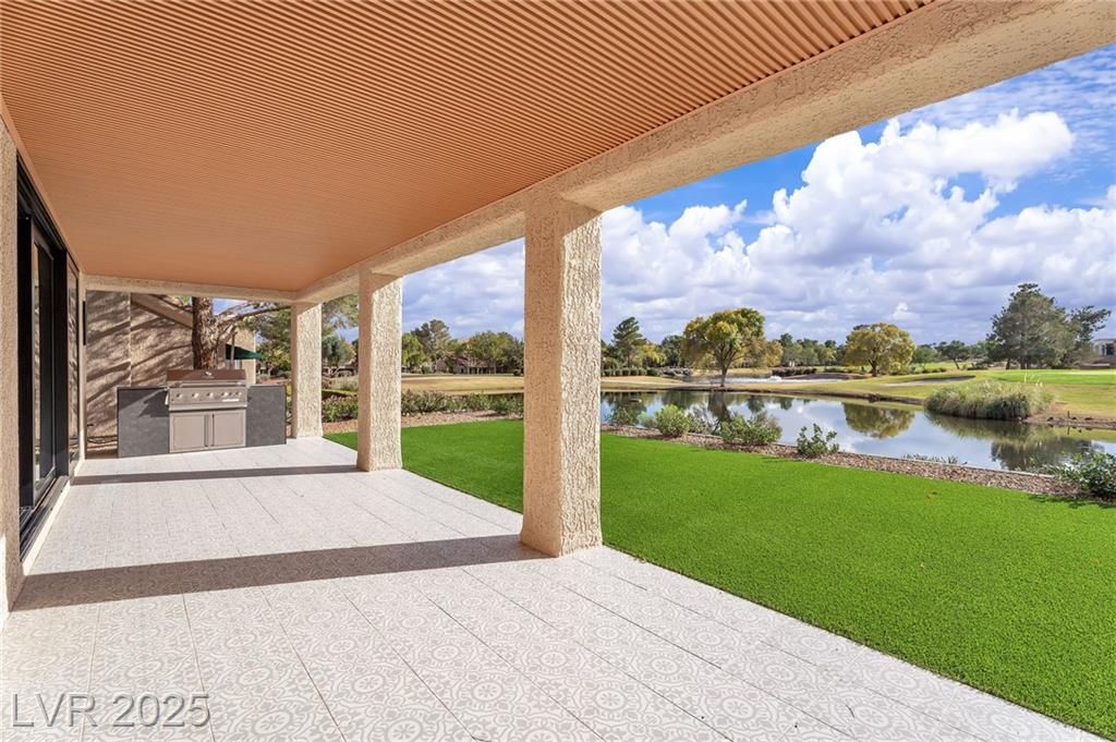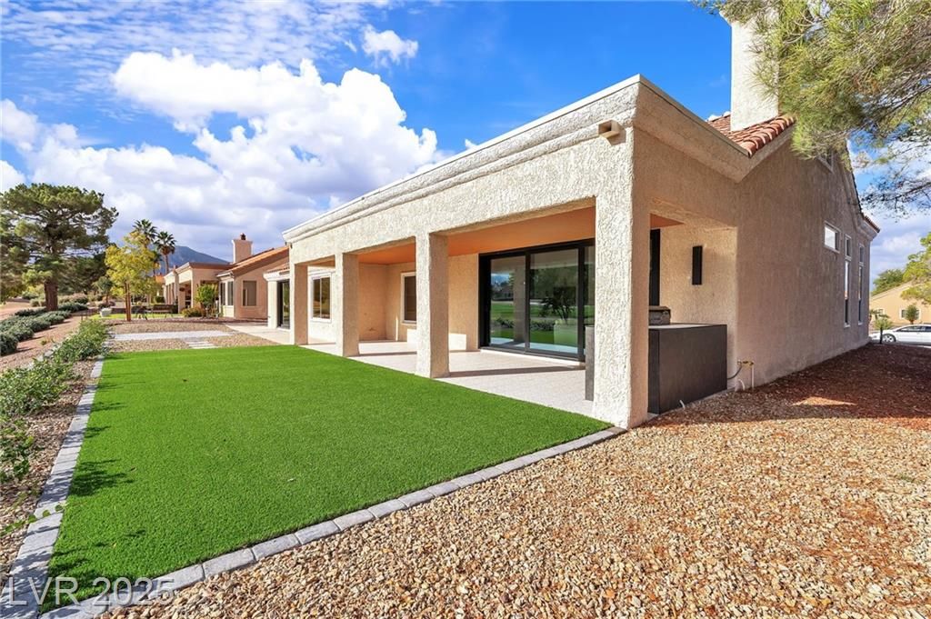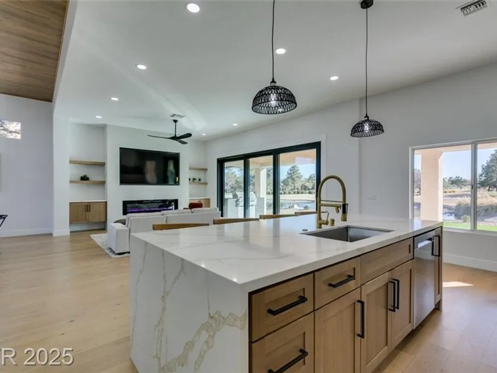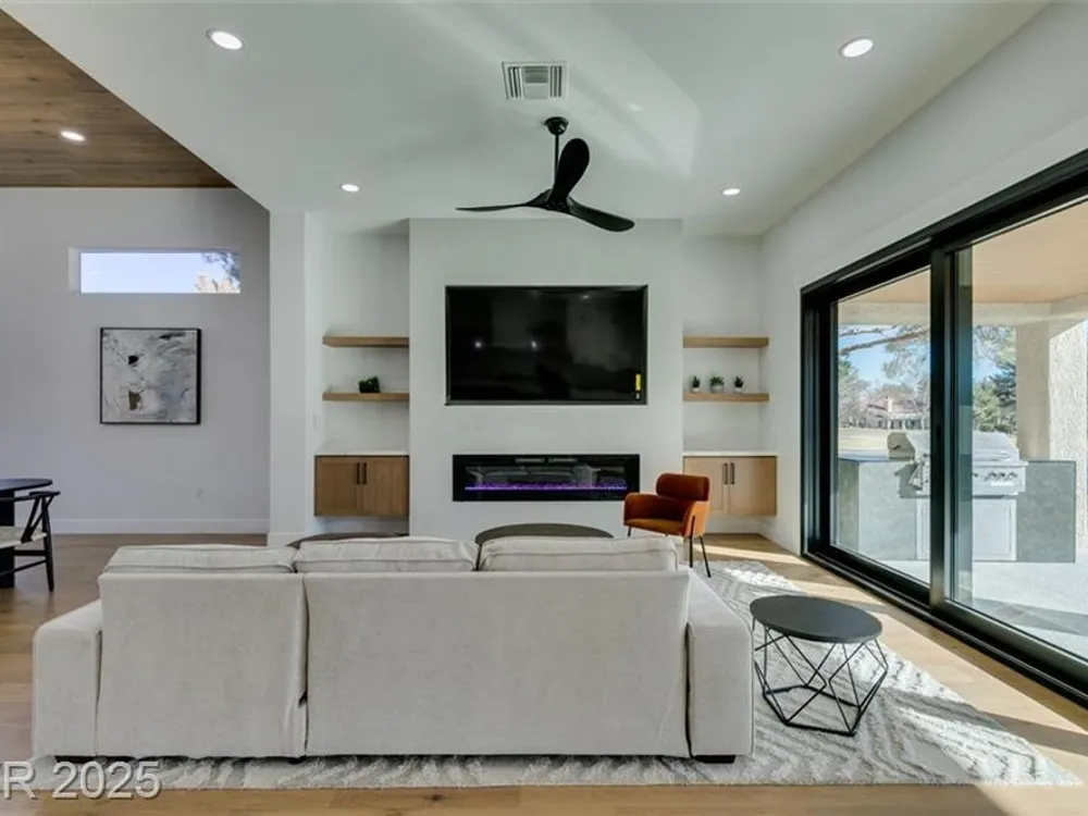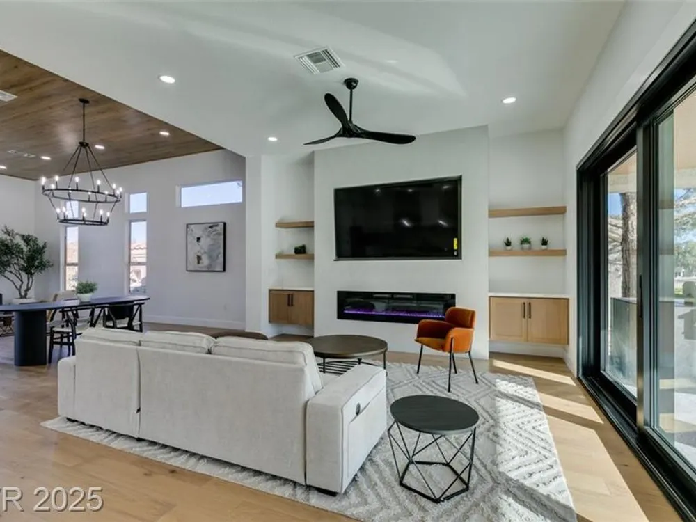 Step into your gorgeous 3 bedroom 2 bath Hacienda with Stellar golf course & lake/water views nestled on the putting green of the golf course in Sun City Summerlin. This spacious residence features high-end finishes, modern amenities throughout, including luxury flooring, high ceilings, 15ft Custom slider patio door that flood the space with natural light. The kitchen features stacked-tile backsplash with high-end stainless steel appliances & designer hood. Large waterfall island in the heart of the home, which acts as a beautiful centerpiece with an adjoining dining & roomy family room has custom built fireplace makes it ideal for gatherings. Primary bedroom offers a peaceful oasis with custom built electric fireplace, walk-in closet & spa-like master bathroom. Backyard has golf course views, covered patio synthetic grass. Nestled in a vibrant 55+ community is your gateway to a dynamic lifestyle, complete with community amenities & nearby trendy eateries and cultural hotspots.