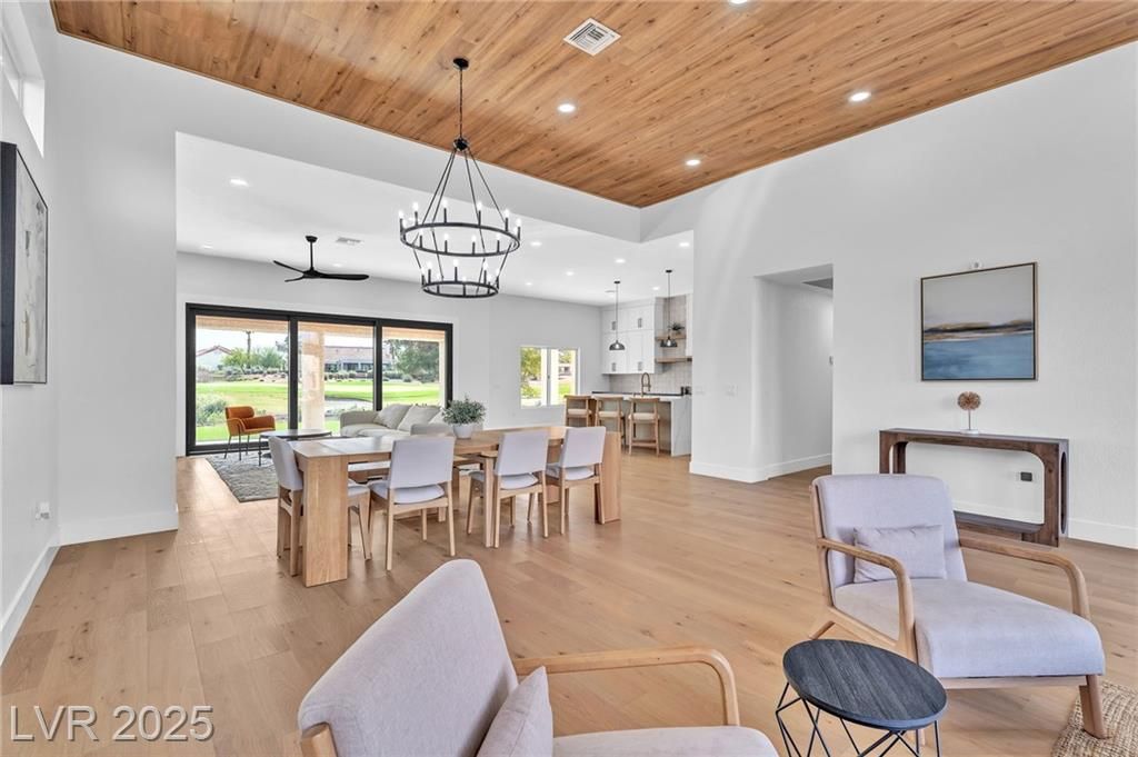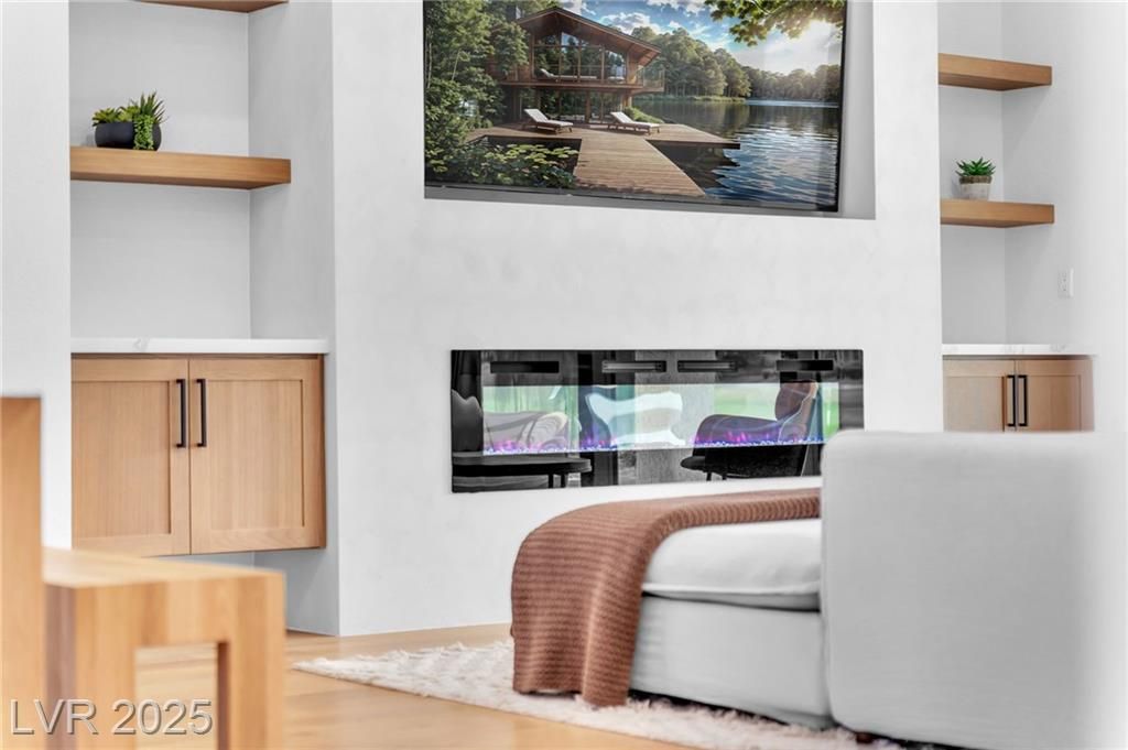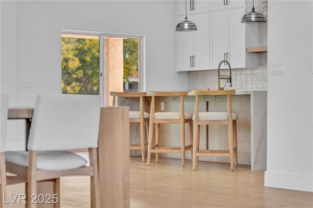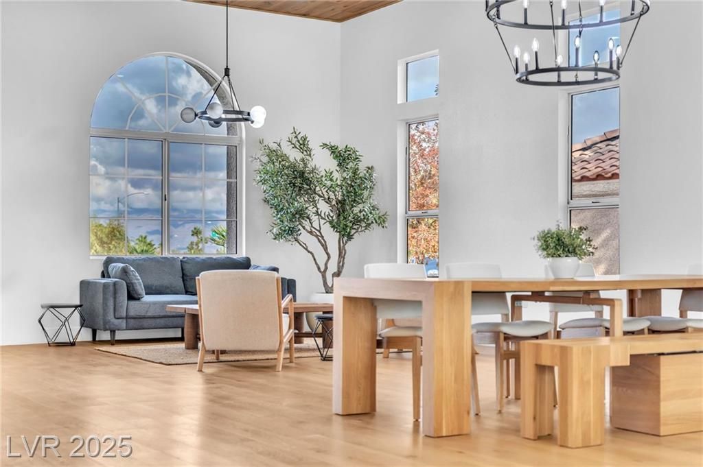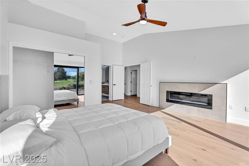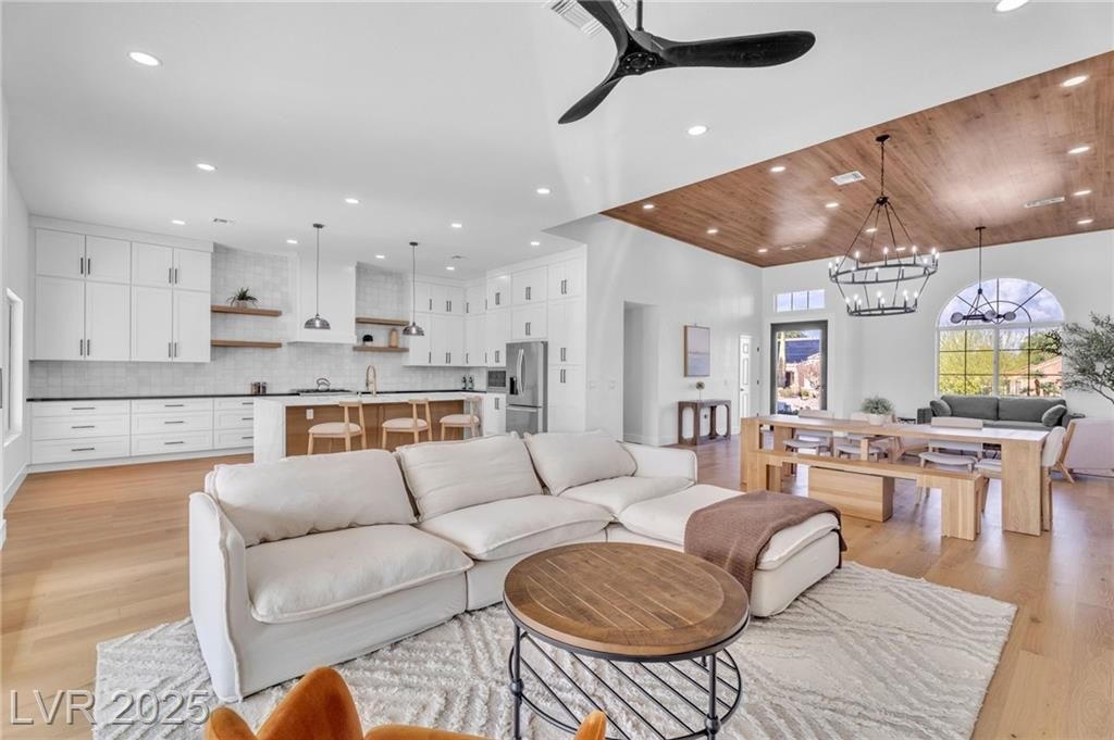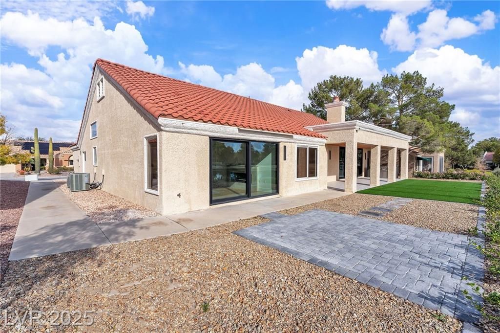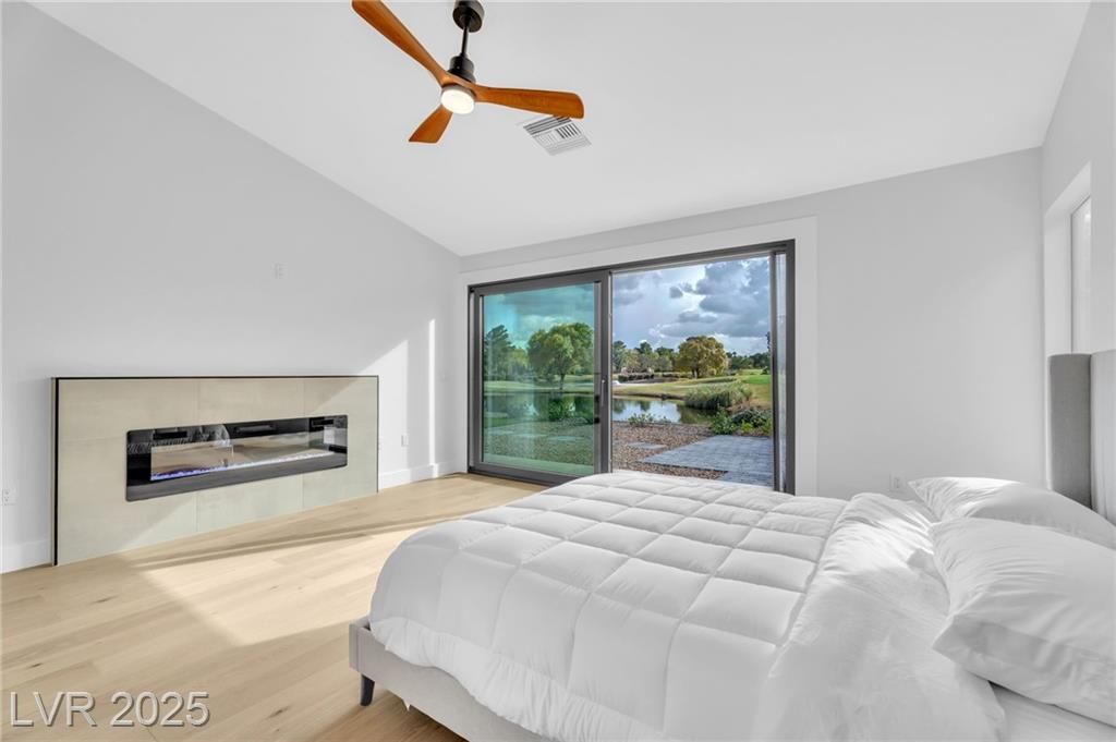 Step into your gorgeous 3 bedroom 2 bath Hacienda with Stellar golf course & lake/water views nestled on the putting green of the golf course in Sun City Summerlin. This spacious residence features high-end finishes, modern amenities throughout, including luxury flooring, high ceilings, 15ft Custom slider patio door that flood the space with natural light. The kitchen features stacked-tile backsplash with high-end stainless steel appliances & designer hood. Large waterfall island in the heart of the home, which acts as a beautiful centerpiece with an adjoining dining & roomy family room has custom built fireplace makes it ideal for gatherings. Primary bedroom offers a peaceful oasis with custom built electric fireplace, walk-in closet & spa-like master bathroom. Backyard has golf course views, covered patio synthetic grass. Nestled in a vibrant 55+ community is your gateway to a dynamic lifestyle, complete with community amenities & nearby trendy eateries and cultural hotspots.