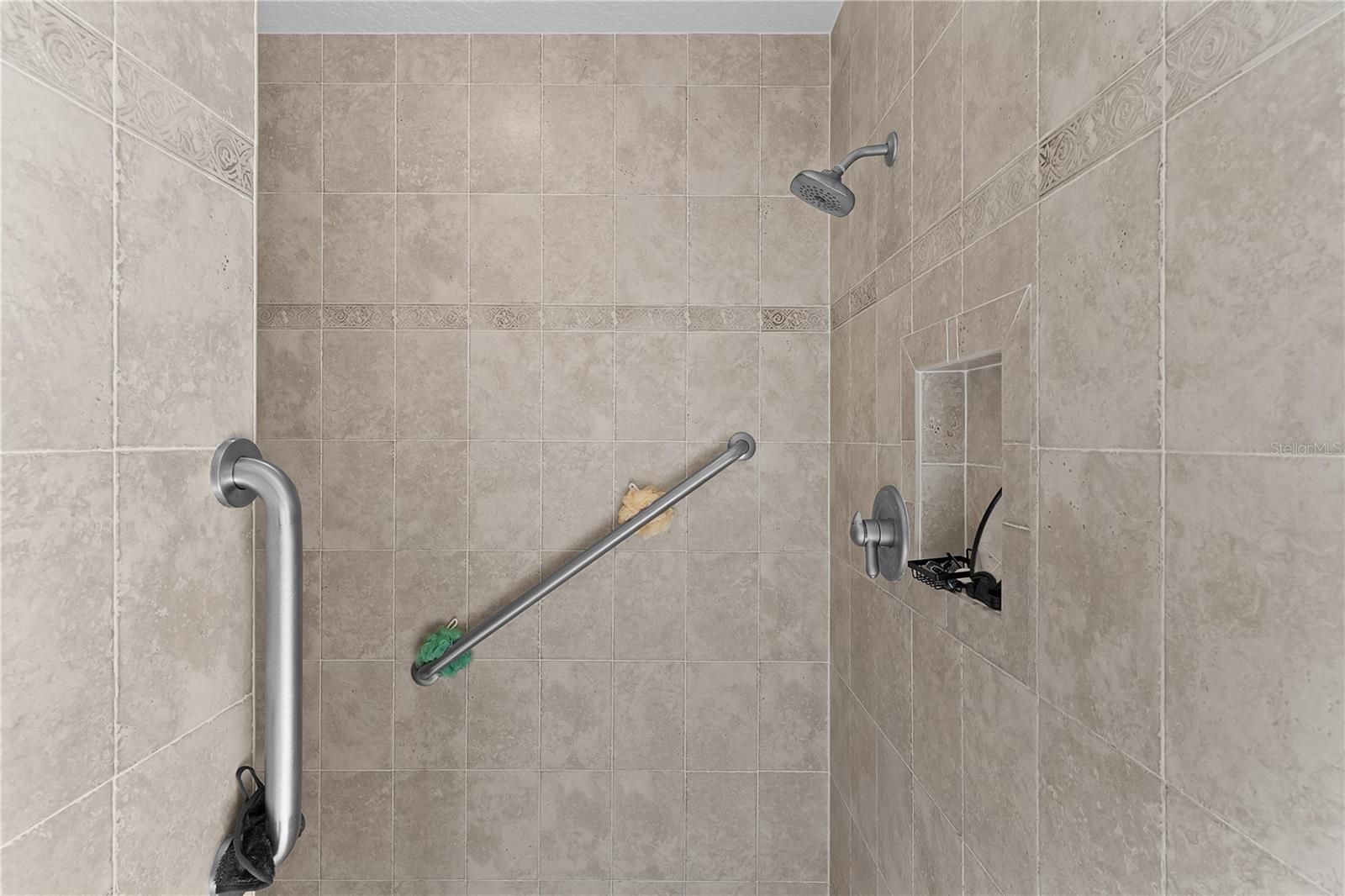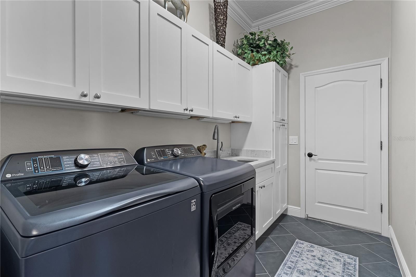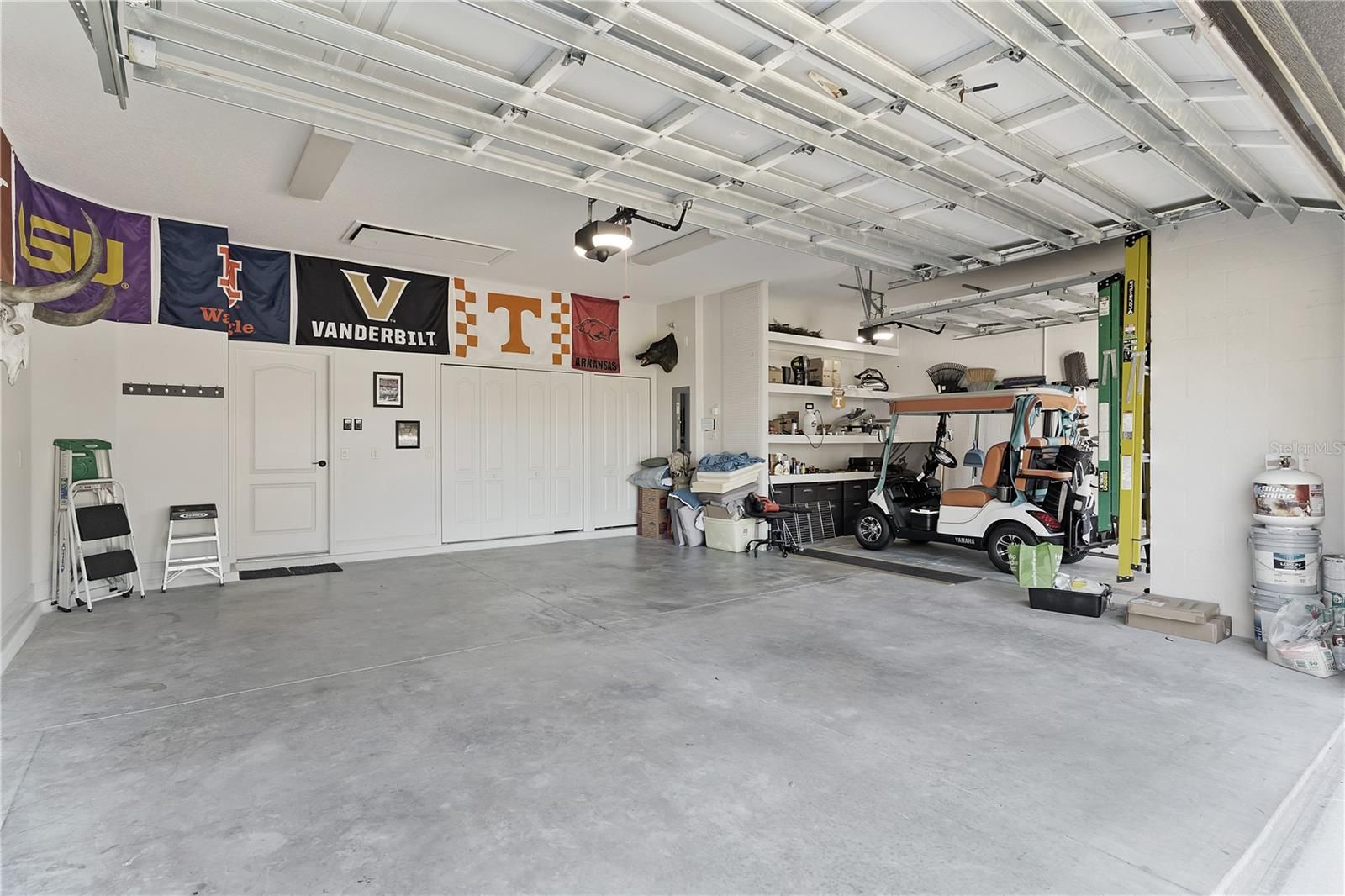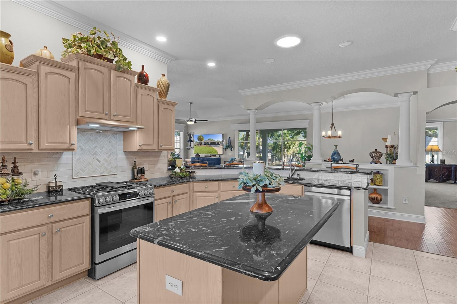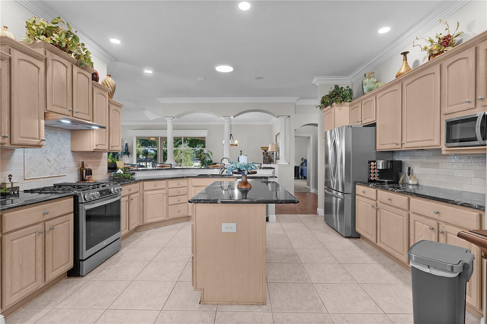 Stunning PREMIER Williamsburg Model in Royal Oak Village of Springdale offering elegance, quality craftsmanship, and peaceful surroundings. 3 Bed/2 Bath includes a 2 car + golf cart garage. This beautiful home welcomes you with newly painted exterior and spectacular exterior accent lightening. Upon entering, you are immediately drawn to the attractive backyard views from beyond the 12' X 8' triple stacking living room doors with new remote hidden shades. 10' ceilings accentuated by custom crown molding throughout the entire home. Solar tubes in kitchen and laundry room brighten your living space. All windows are framed with beautiful custom decorative casing trim work – exceptionally stunning craftsmanship throughout! Luxury plank flooring in central rooms with ceramic tile in wet areas. Huge kitchen- features under cabinet lighting, large dinette breakfast area and newer tile backsplash. Granite countertops throughout. Large primary bedroom suite, two large walk-in closets with built-in closet organizers. Primary bathroom with zero entry tiled roman shower and large garden tub. Enjoy stepping out through adjoining primary bedroom 8' French doors onto your stunning 34' X 11' lanai with new screening. The lanai is the home's true showpiece with tranquil backyard views and soaring custom tongue/groove 10' ceiling with 2 palm ceiling fans. The split floor plan offers 2 guest rooms with guest bath at the front of the home. Large guest bedroom has private ensuite bath and walk-in closet making it a lovely room for company. Additional guest bedroom/den is filled with an abundance of natural light and has room to add closet. Garage has 10’ tall ceilings with custom storage shelving and freshly painted with potential for expansion. Enjoy the elevate setting and the opportunity to enjoy this lovely home in a quite setting. Updates include: Roof- 2023, HVAC 2023, newer appliances, irrigation system 2024, HIK Security, Ring cameras 2024, and Wi-Fi garage door openers. BOND PAID! Call for your private showing! More photos coming.