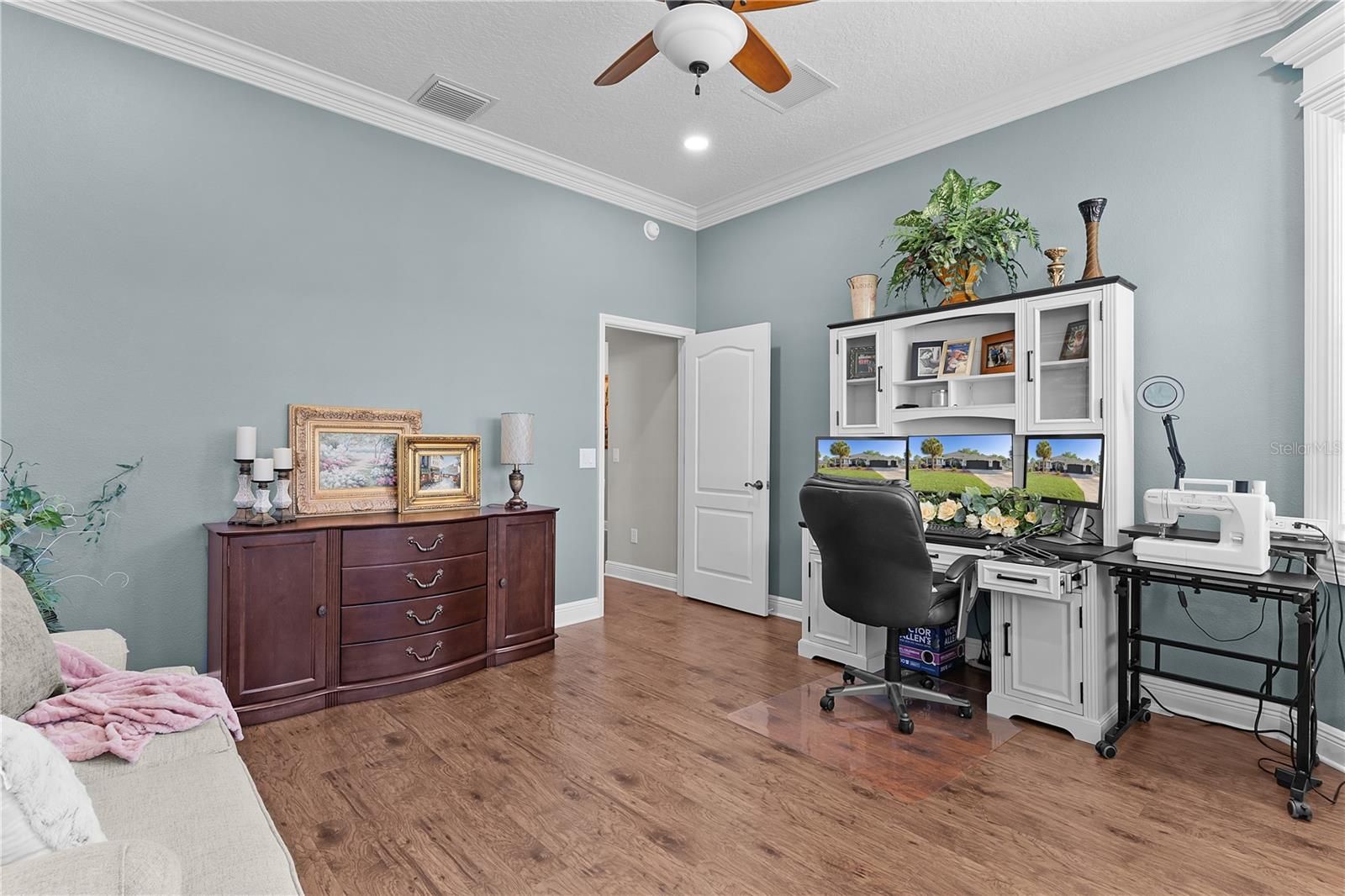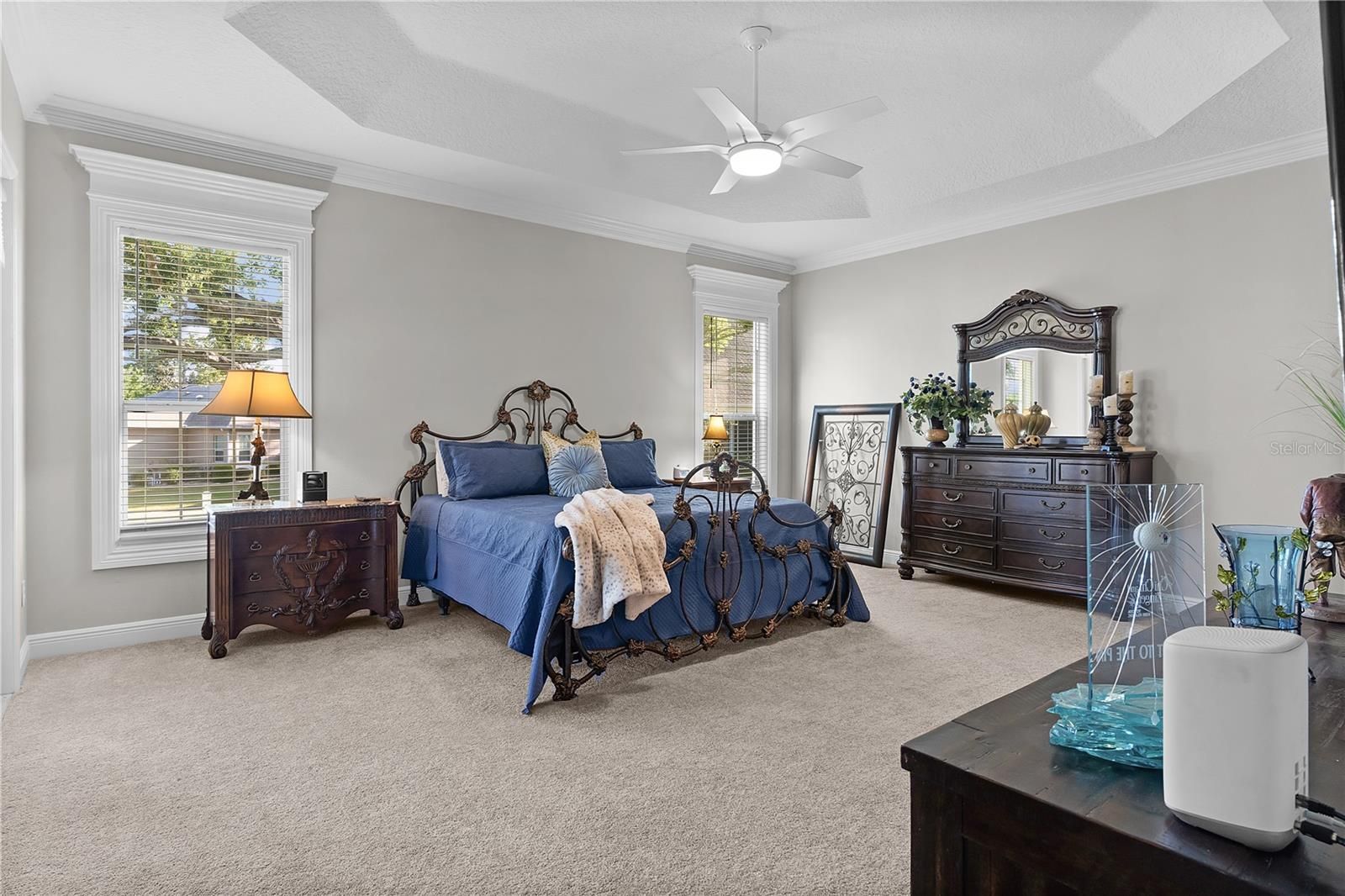 - Ceiling Fan(s), Crown Molding, Eat-in Kitchen, High Ceilings, Living/Dining Room, Open Floorplan, Main Level Primary, Solid Surface Counters, Split Bedrooms, Thermostat, Tray Ceiling(s), Walk-In Closet(s), Window Treatments