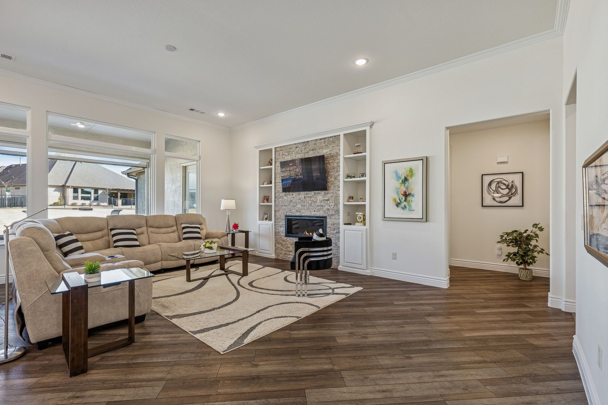Welcome to 8717 Basanite, a beautifully appointed home in the highly sought-after Robson Ranch community, where resort-style living meets modern comfort. Thoughtfully designed and filled with upscale finishes, this home offers both style and functionality for everyday living and entertaining. The light and bright eat-in kitchen features stainless steel appliances, a gas range, and a huge walk-in pantry, making it as practical as it is inviting. Modern touches continue throughout the home, including Hunter-Douglas electronic shades that add convenience and a clean, contemporary feel. The well-planned layout includes a spare bedroom with an ensuite bath, ideal for guests. Step outside to enjoy the outdoor living space, complete with a built-in grill and electronic shades, creating the perfect setting for relaxing evenings, entertaining friends, or enjoying year-round comfort. Located in Robson Ranch, a premier 55+ active adult, gated community, residents enjoy an unparalleled lifestyle with amenities including championship golf, fitness and aquatic centers, pickleball and tennis courts, walking trails, and a vibrant calendar of social clubs and activities. This exceptional community offers the perfect blend of leisure, connection, and low-maintenance living. 8717 Basanite is more than a home — it’s your opportunity to embrace the Robson Ranch lifestyle in comfort and style.