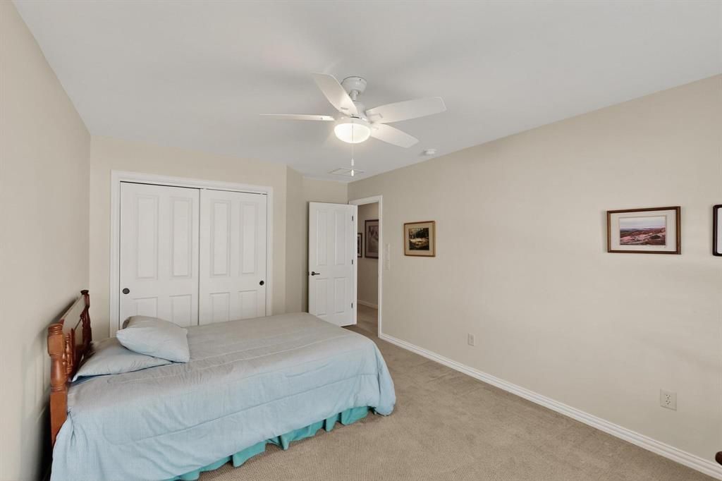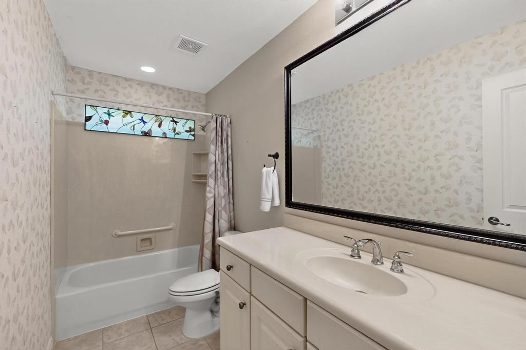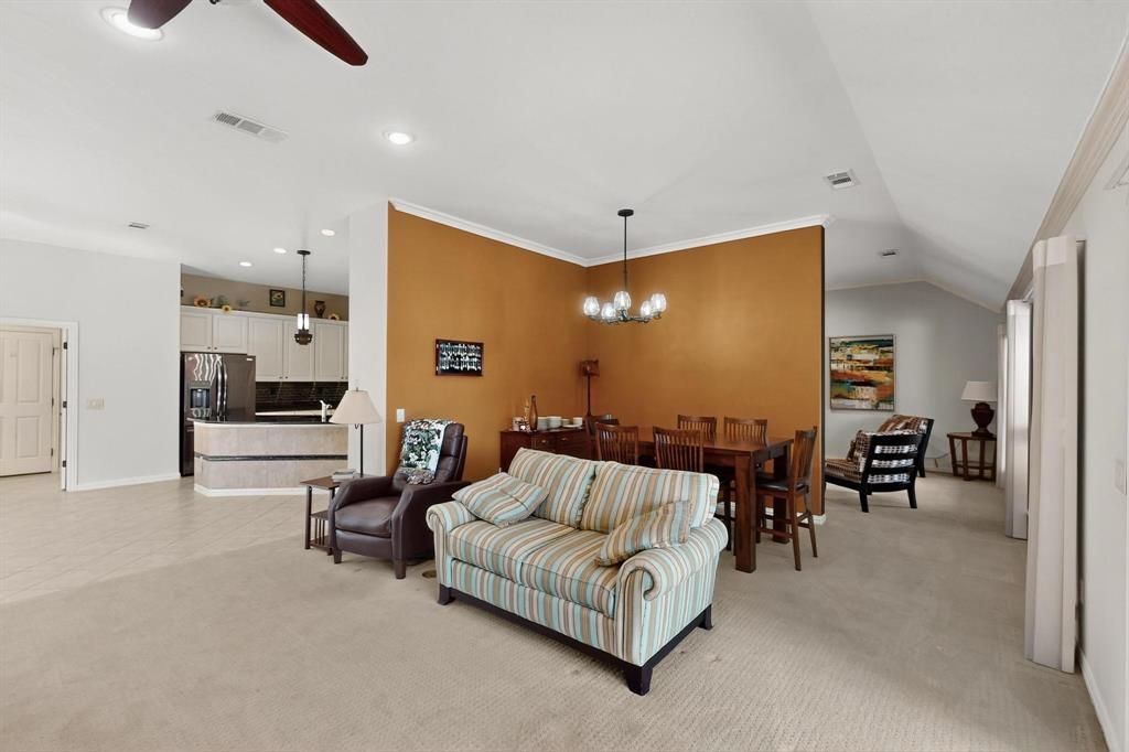 Charming 3-bedroom Trova with extended golf cart garage and greenbelt views. This home welcomes you with a paver walkway lined with a stone bench. Step inside to a light-filled formal living room that opens directly to the enclosed, screened-in patio—ideal for relaxing while overlooking the expansive greenbelt and oversized lot. The bright kitchen features crisp white cabinetry, granite countertops, a decorative chandelier, and a refrigerator that conveys. Enjoy casual meals in the sunny breakfast nook with bay windows, built-in seating, and extra storage.Adjacent to the kitchen, the spacious family room offers flexibility for a second dining area and opens to a generously sized stamped concrete patio—perfect for entertaining or enjoying the peaceful outdoor setting.The primary suite is a true retreat with a tray ceiling, bay window showcasing greenbelt views, and private access to the enclosed patio. The en suite bath includes dual vanities with a center vanity, shower with grab bar, and a large walk-in closet.Two additional bedrooms are located at the front of the home, each with plantation shutters and sliding door closets, conveniently served by a full hall bathroom.A dedicated office with built-in cabinetry and desk offers a quiet space to work or create. The laundry room includes a sink, upper cabinets, and room for side-by-side appliances. The extended golf cart garage adds valuable storage and utility.Best of all, it is in close proximity to the amenities, including two state of the art sports centers, tennis, pickleball and nearly complete bocce court. Explore your creative side at the creative arts center, and engage in the community at the Clubhouse.