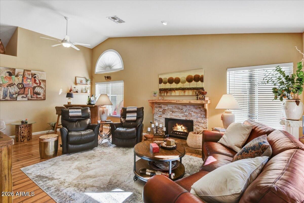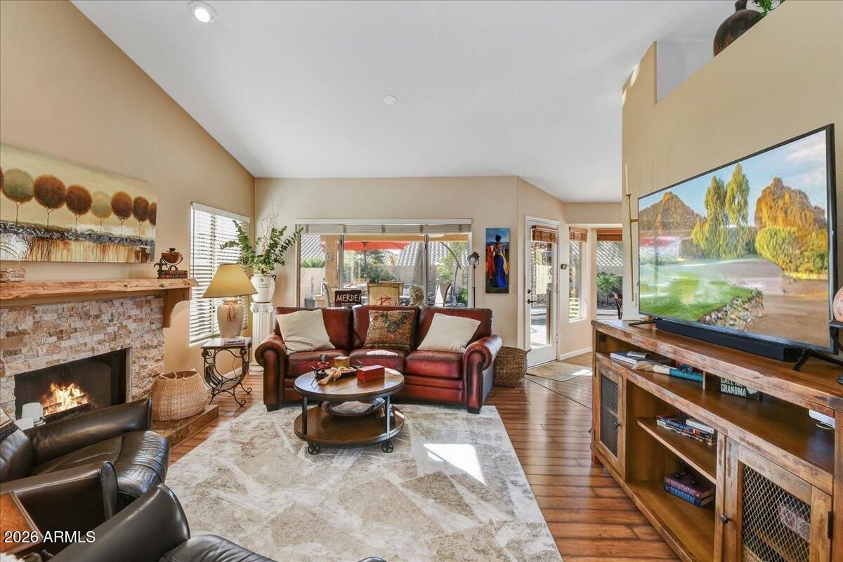 WARM & INVITING from the moment you walk in. Tastefully decorated, Lots of natural light, 3 bedroom, 2 bathroom w/one outfitted for flexible office/hobby room. Vaulted ceilings, wood look laminate flooring, Wood shutters, updated lighting. Eat in Kitchen w/bay window, Granite countertops, Newer fridge & touchless faucet, Cozy Family room w/gas fireplace creates ambiance & is a perfect gathering spot, Dining room can be expanded to be part of the family room. Primary bedroom has sliding doors to outdoor Paradise! Enjoy the custom tiled shower, double sinks, decorative mirrors & lighting other bedrooms split w/beautifully updated bathroom. Truly ONE OF A KIND retreat Featuring Professionally landscaped yard, DESIGNED for the ULTIMATE ENTERTAINING EXPERIENCE! N/S exposure, Heated POOL Custom Built-in bar w/beverage fridge, Oversized, Covered Patio, Expansive use of pavers for MULTIPLE Conversation areas, Mature Palm trees & plants, 4-person above ground hot tub. PERFECT for RELAXING, Entertaining or ENJOYING Arizona's Beautiful weather!!! For EASE of moving this can be a wonderful TURN KEY Opportunity Fully furnished (quality furniture & household items) available outside of escrow (minus some personal & decorative items/artwork)