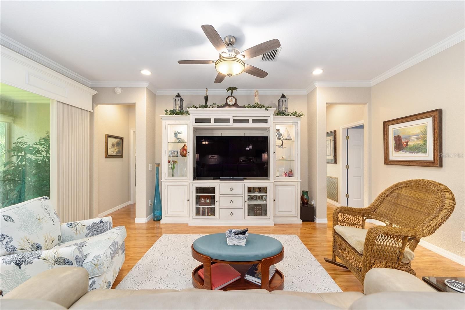 The perfect Hanover 3 Bedroom 2 bath Golf course home is just awaiting you. As you walk up to the twin leaded glass doors you will see the well-manicured lawn and shrubbery in rock beds with curbing going around the entire home. Enter the Foyer and see the laminate wood flooring, the crown molding and the great views. The kitchen with its tall Maple cabinets has been extended for more cabinet space. Upgrades to the kitchen include, stainless steel appliances, granite counters with a granite backsplash, solar tube, rollout soft close drawers, laminate wood flooring, with pendant lights, and top of the line faucet and sink. The dining area overlooks the great room with its crown molding and wooden valances, and views the golf course. The original model showed a formal dining room that is currently being used as a craft room with crown molding and plantation shutters, with other uses available. The primary bedroom overlooks the golf course and has carpet, crown molding and plantation shutters. Ensuite has completely been remodeled with a large double shower with benches on both sides, a double quartz vanity, laminate flooring and unusual fans and lights with one fan playing music. Both guest bedrooms feature plantation shutters with one having laminate wood flooring and the other carpeting. One of the guest bedrooms has its own private entrance into the 2nd bathroom which has also been updated. The enclosed lanai with its stucco wall , roller shades, fans with lights and carpet. Just outside the lanai is a patio for grilling or catching the sun. This fine home has its own WELL FOR IRRIGATION, a whole house surge protector, all new windows in 2020, new roof in 2021, new HVAC in 2022, new hot water heater in 2025. The average electric bill is only $30 per month as this home has solar panels that have been paid for and 6 inches of insolation also added. Newer deluxe washer and dryer are in the inside laundry room with a utility sink and cupboards above. The garage with a golf cart garage has been extended 4 feet and has lots of storage, with drop down stairs for storage above, a fan, a utility sink, a side door and a window, plus a workbench included with the sale. The list of the haves can go on, so you need to make plans quickly, as this is a one of a kind Hanover.