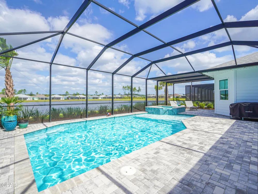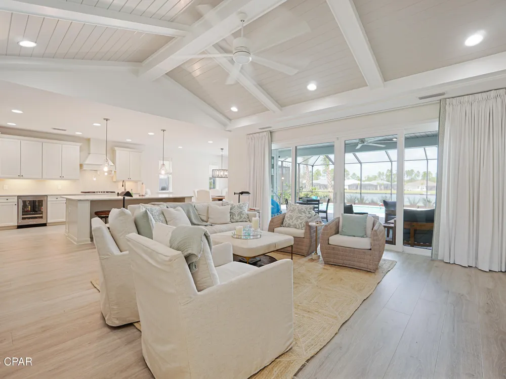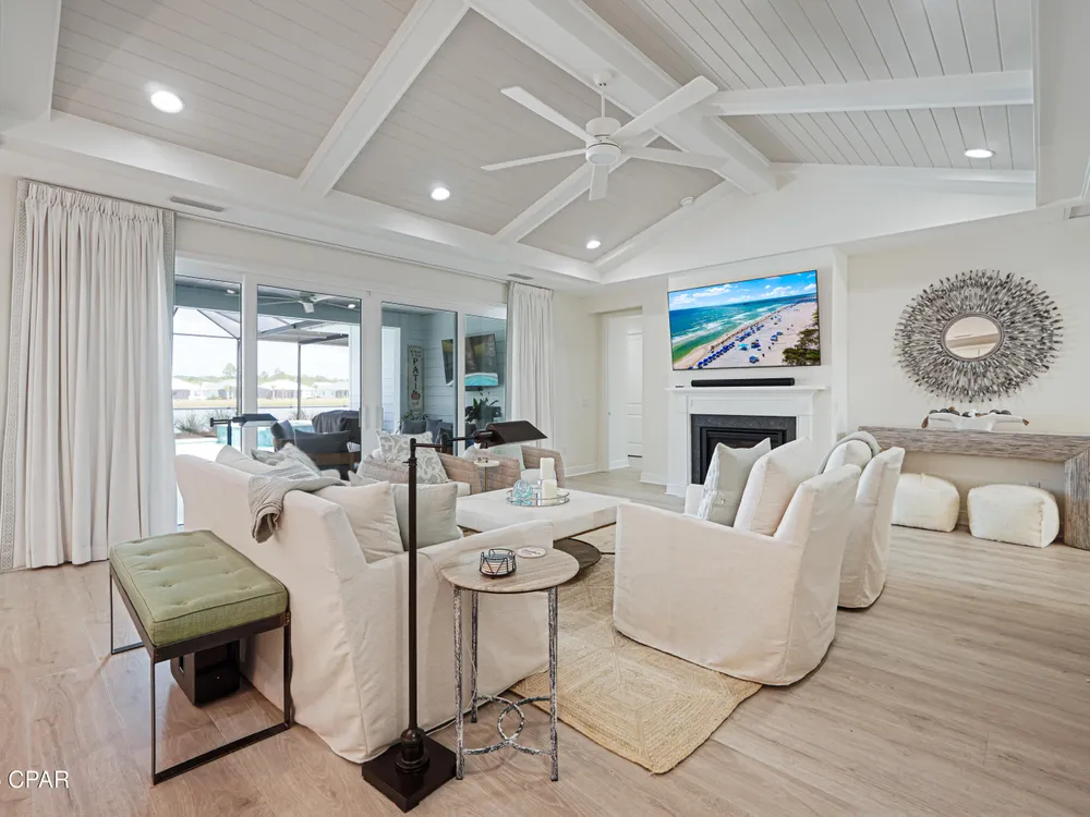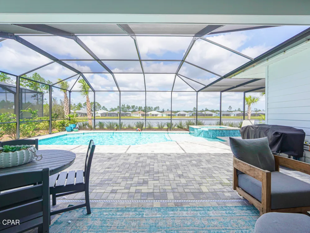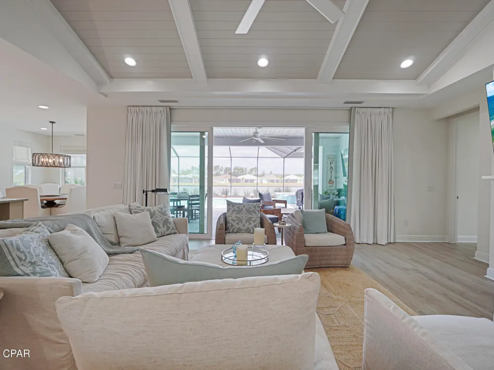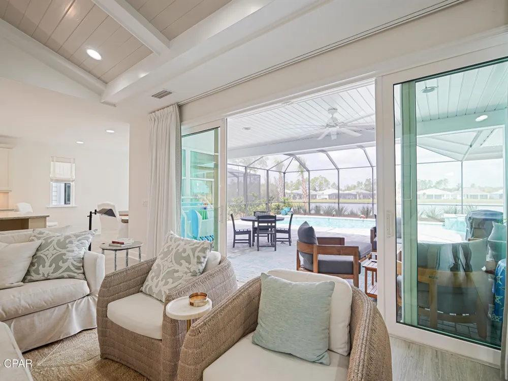 Discover this beautifully furnished Aruba model, thoughtfully designed for elegant coastal living and effortless indoor-outdoor enjoyment. Perfectly positioned to capture sparkling pond views, this home exudes sophistication, warmth, and style from the moment you step inside. The open-concept living space features stunning wood beams, a shiplap ceiling, and a fireplace feature wall, creating a grand yet inviting atmosphere. The chef's kitchen is an entertainer's dream, boasting gas cooking with a hood vent, wall oven, drawers and pull-outs for organization, undermount lighting, neutral backsplash, recessed lighting, and beautiful pendant fixtures. A wine fridge and stellar island overlooking the living room make this space as functional as it is gorgeous. The spacious main en suite is a serene retreat overlooking the pool and pond. Enjoy dual closets, a tray ceiling, and a spa-inspired bath with an upgraded tile shower featuring a rain head, corner seat, and elegant wall-mounted fixtures. Light tones and airy finishes give the entire space a calm, resort-like ambiance. The den is a standout feature, offering built-in cabinetry, a desk, and a Murphy bed with a shiplap accent wall—perfect as a guest space or home office. Guests will also love the private en suite bedroom adorned with coastal wallpaper, soft seafoam accents, tray ceiling, and custom curtains, creating a luxurious sanctuary. Sliding glass doors open seamlessly to the outdoor living area, where the Florida lifestyle shines. The pavered pool area features surround sound speakers, a gas stub for a grill, a TV setup, and plenty of room for lounging or dining al fresco—all screened for comfort and overlooking serene water views. The three-car garage leads into the laundry room, complete with additional cabinetry and a convenient key drop station for convenience and style. Don't miss your chance to own this fully furnished, turnkey Aruba model showcasing designer finishes, smart upgrades, and spectacular pond views right down to the upgraded baseboards. Living in Paradise close to Town Square, the lively hub of the community, offering: Bar & Chill Restaurant, with stunning views of the Intracoastal Waterway, State-of-the-art fitness center, plus indoor fitness classes, Lap pool, designed for both exercise and relaxation, Live entertainment at the bandshell every weekend, Bocce ball, cornhole, and pool tables for socializing and friendly competition, Zero-entry resort-style pool, offering plenty of space to lounge, Kayak & paddleboard launch, perfect for exploring the waterways, Pickleball and tennis courts to stay active and engaged. This home is not just a place to live—it's a lifestyle upgrade. The combination of waterfront tranquility, thoughtful upgrades, and resort-style amenities makes this an extraordinary opportunity in Latitude Margaritaville Watersound. Schedule your private tour today and start living the dream—it's a lifestyle upgrade.