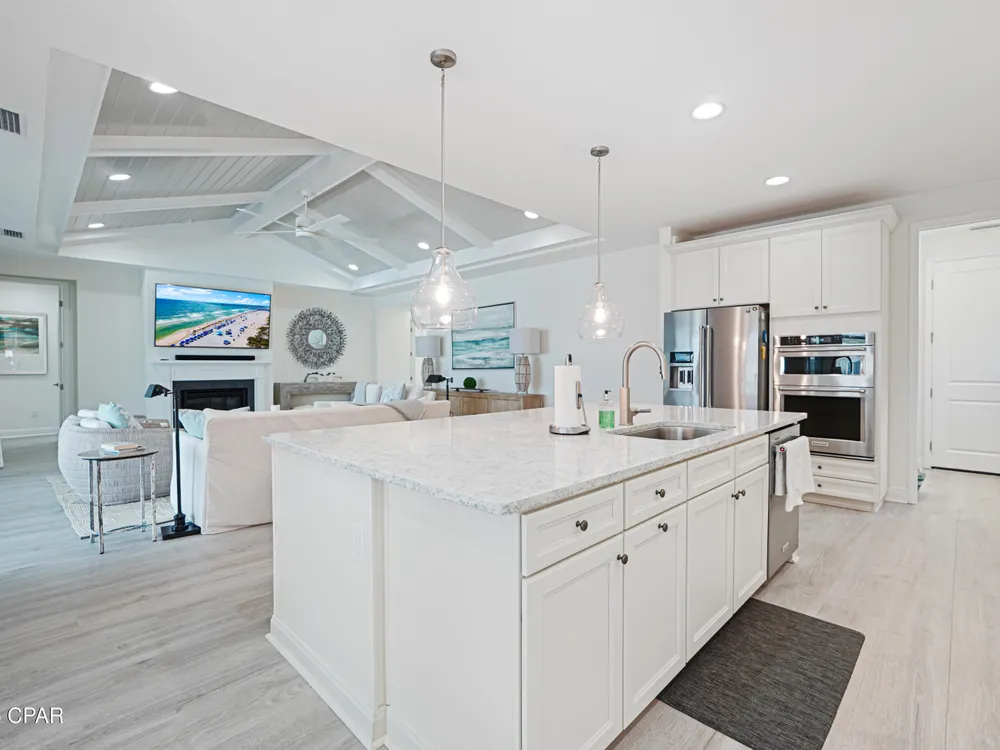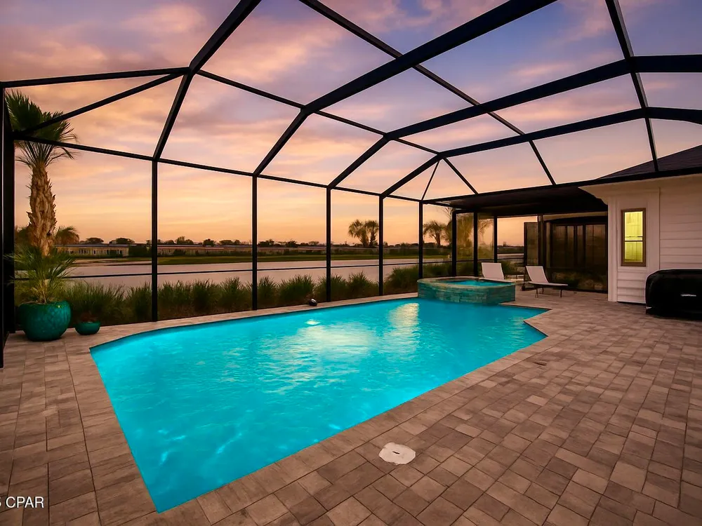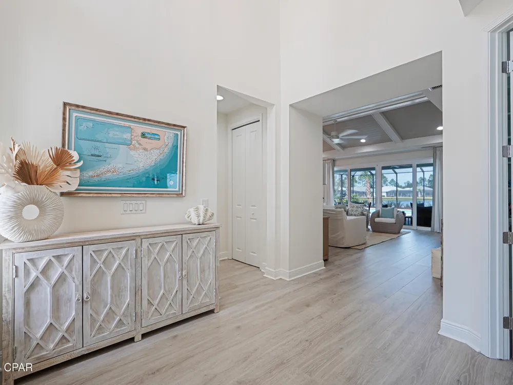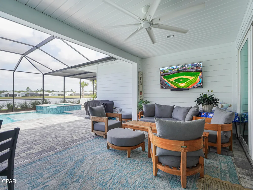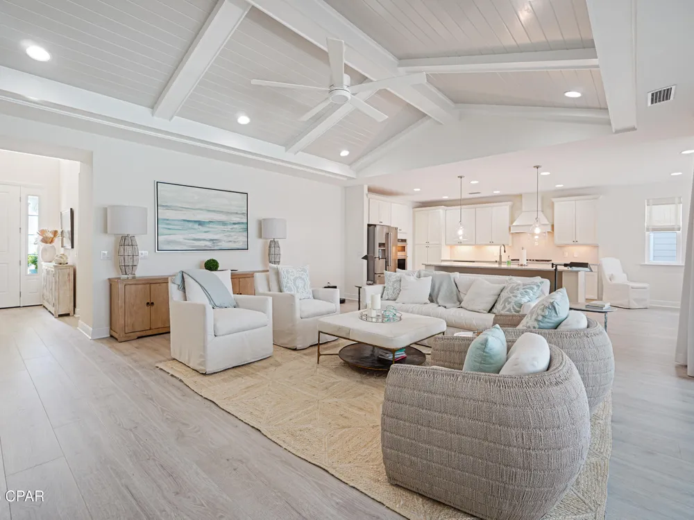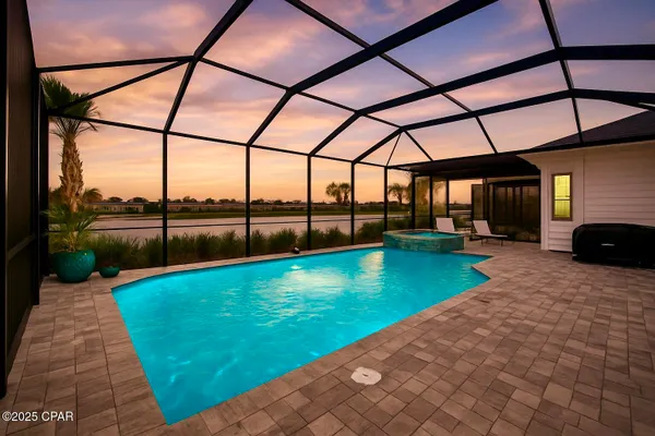 Discover this beautifully furnished Aruba model, thoughtfully designed for elegant coastal living and effortless indoor-outdoor enjoyment. Perfectly positioned to capture sparkling pond views, this home exudes sophistication, warmth, and style from the moment you step inside. The open-concept living space features stunning wood beams, a shiplap ceiling, and a fireplace feature wall, creating a grand yet inviting atmosphere. The chef's kitchen is an entertainer's dream, boasting gas cooking with a hood vent, wall oven, drawers and pull-outs for organization, undermount lighting, neutral backsplash, recessed lighting, and beautiful pendant fixtures. A wine fridge and stellar island overlooking the living room make this space as functional as it is gorgeous. The spacious main en suite is a serene retreat overlooking the pool and pond. Enjoy dual closets, a tray ceiling, and a spa-inspired bath with an upgraded tile shower featuring a rain head, corner seat, and elegant wall-mounted fixtures. Light tones and airy finishes give the entire space a calm, resort-like ambiance. The den is a standout feature, offering built-in cabinetry, a desk, and a Murphy bed with a shiplap accent wall—perfect as a guest space or home office. Guests will also love the private en suite bedroom adorned with coastal wallpaper, soft seafoam accents, tray ceiling, and custom curtains, creating a luxurious sanctuary. Sliding glass doors open seamlessly to the outdoor living area, where the Florida lifestyle shines. The pavered pool area features surround sound speakers, a gas stub for a grill, a TV setup, and plenty of room for lounging or dining al fresco—all screened for comfort and overlooking serene water views. The three-car garage leads into the laundry room, complete with additional cabinetry and a convenient key drop station for convenience and style. Don't miss your chance to own this fully furnished, turnkey Aruba model showcasing designer finishes, smart upgrades, and spectacular pond views right down to the upgraded baseboards. Living in Paradise close to Town Square, the lively hub of the community, offering: Bar & Chill Restaurant, with stunning views of the Intracoastal Waterway, State-of-the-art fitness center, plus indoor fitness classes, Lap pool, designed for both exercise and relaxation, Live entertainment at the bandshell every weekend, Bocce ball, cornhole, and pool tables for socializing and friendly competition, Zero-entry resort-style pool, offering plenty of space to lounge, Kayak & paddleboard launch, perfect for exploring the waterways, Pickleball and tennis courts to stay active and engaged. This home is not just a place to live—it's a lifestyle upgrade. The combination of waterfront tranquility, thoughtful upgrades, and resort-style amenities makes this an extraordinary opportunity in Latitude Margaritaville Watersound. Schedule your private tour today and start living the dream—it's a lifestyle upgrade.