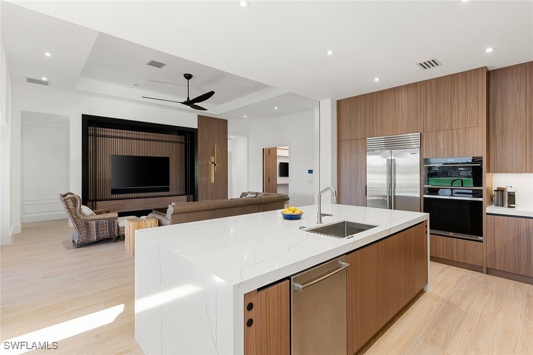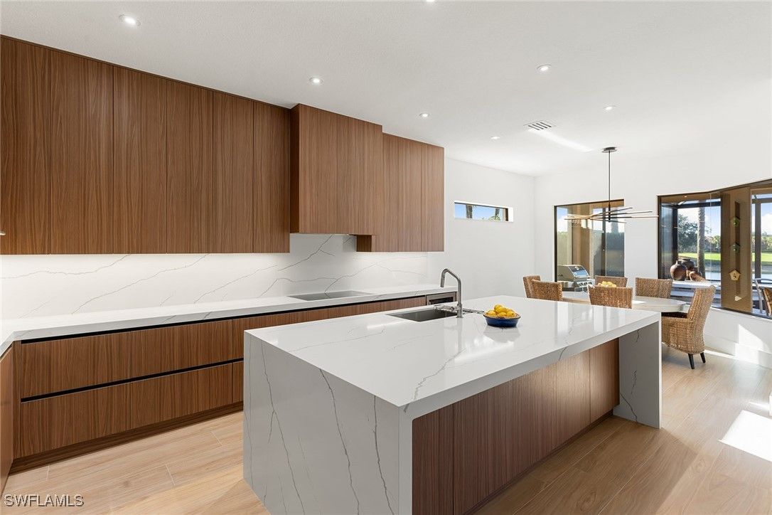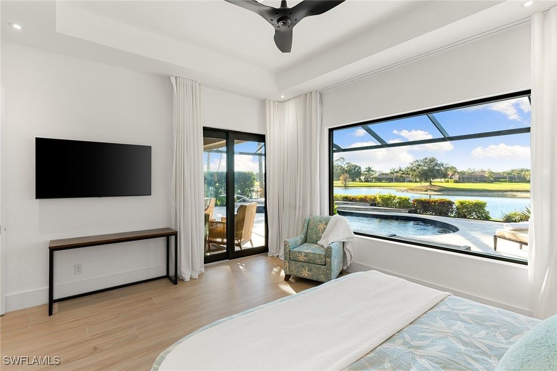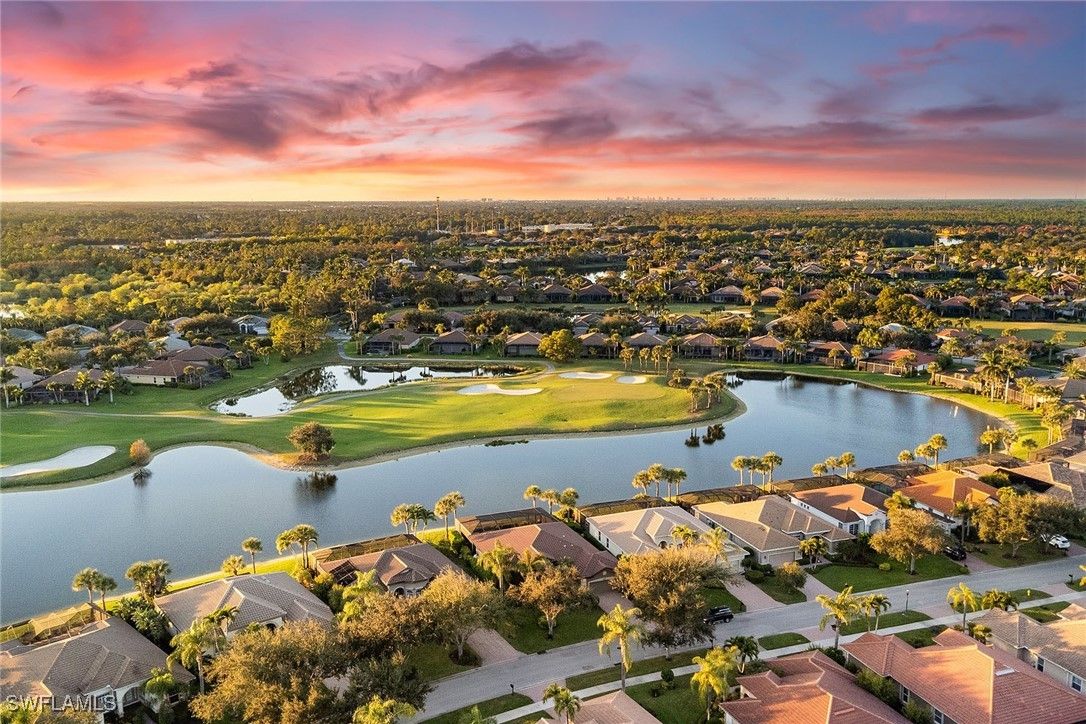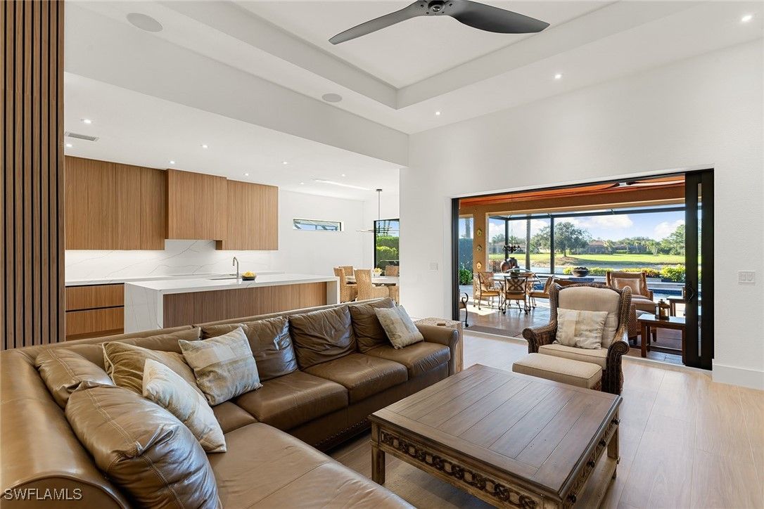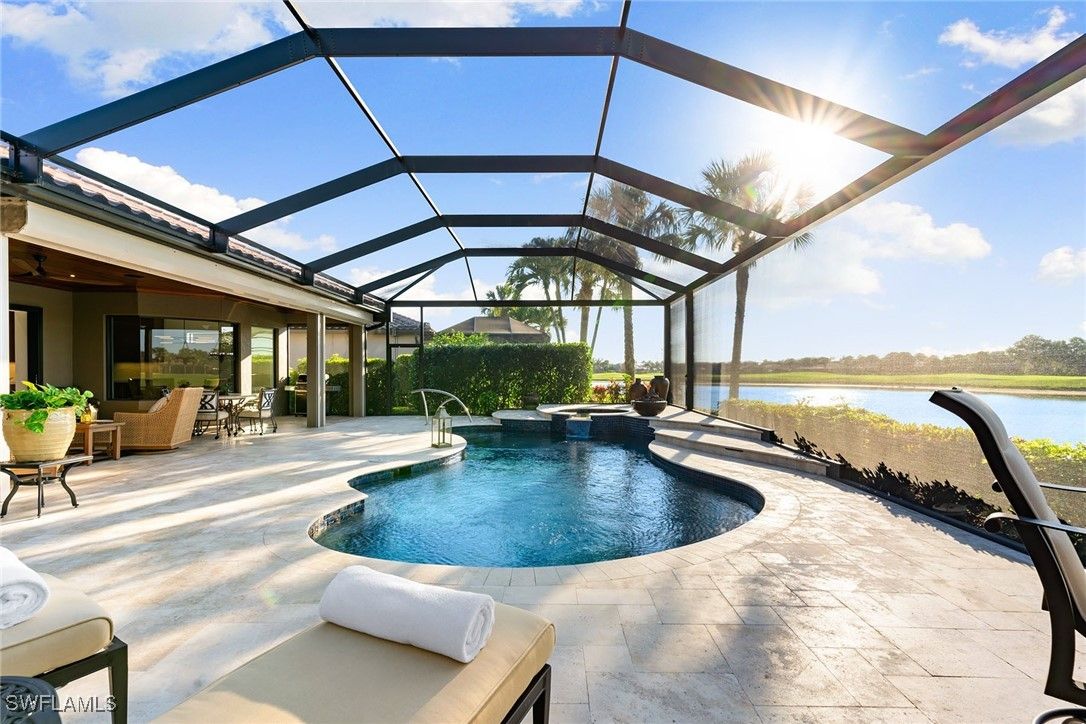 A one-of-a-kind retreat within Mustang Island, a private gated enclave in Lely Resort where refined design meets effortless Florida living. This completely reimagined and renovated smart home offers an ideal blend of sophistication and comfort for those seeking a resort-style lifestyle. Set on a private lakefront homesite surrounded by mature trees and palms, the three-bedroom-plus-den, two-bath residence features a spacious open-concept layout that transitions seamlessly from indoor living to extraordinary outdoor entertaining. The newly renovated kitchen showcases high-end appliances, including a Sub-Zero refrigerator, Wolf wall oven with a second stacked microwave/convection oven, 36-inch induction cooktop, premium quartz surfaces and sleek custom cabinetry. The primary suite offers panoramic lake and golf course views, a custom oversized walk-in closet, and a beautifully appointed spacious bath. Outdoors, the extended screened lanai overlooks wide water and golf course vistas and includes a heated saltwater pool and spa, refinished with tiled stone decking and tongue-and-groove hardwood ceilings over expansive covered lanai. Ideal for entertaining or quiet relaxation, this private retreat captures Naples signature sunset views. Recent upgrades provide peace of mind, including a new roof and gutters, impact-resistant windows and doors, electric rolldown storm shutters securing the covered lanai, new lanai cage and screening, refinished pool and spa, upgraded HVAC, water heater and pool equipment, 8-foot solid core interior doors, insulated interior walls and new laundry appliances. Immediate membership to The Player’s Club and Spa is included, offering access to three resort-style pools, tennis and bocce courts, a wellness center, dining venues and a full-service spa. Membership opportunities are also available at The Classics Golf Club, home to three championship courses. Minutes from downtown Naples and Marco Island, this home delivers the ultimate blend of luxury, privacy and resort living in one of Southwest Florida’s desirable communities.