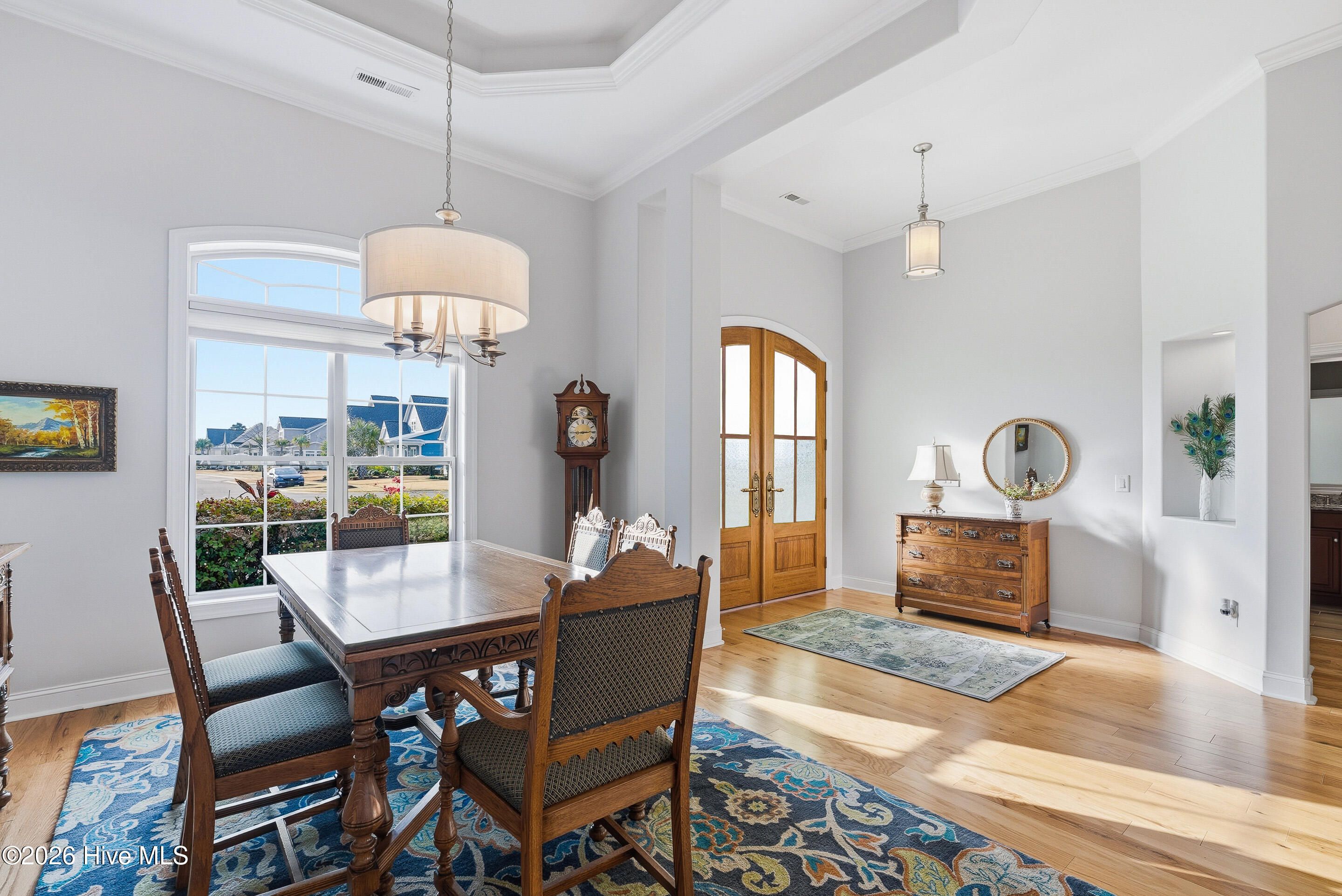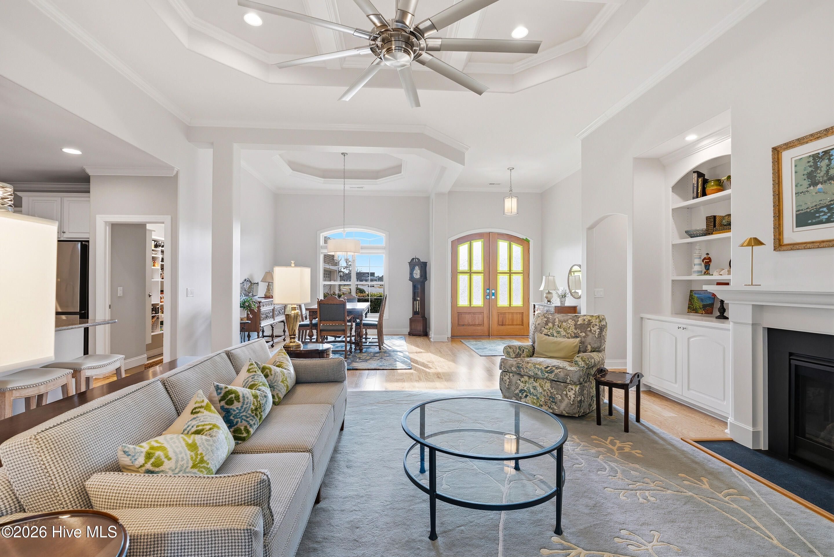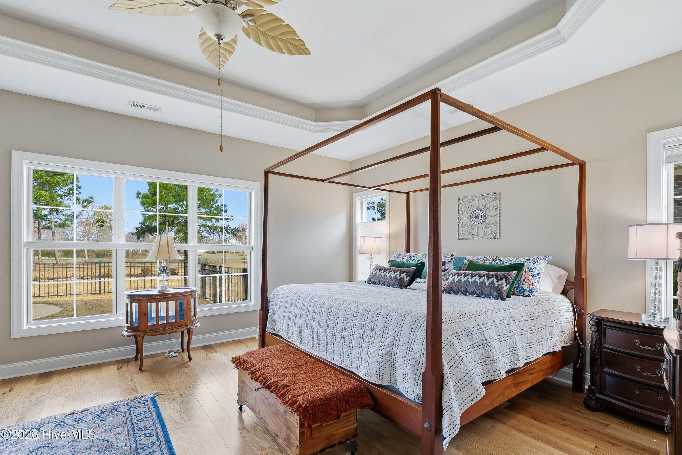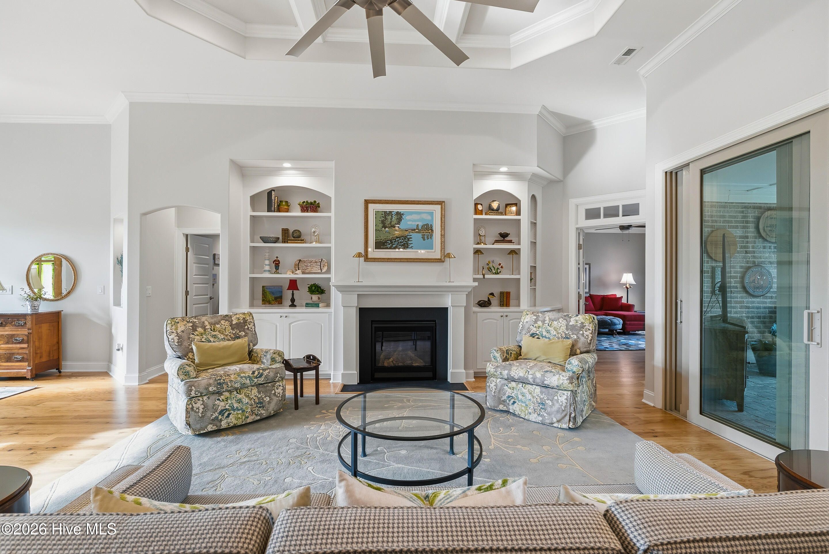 Welcome home to this beautifully maintained 4-bedroom, 4-bath executive home in the desirable gated community of Compass Pointe! Designed with both elegance and functionality in mind, this home showcases thoughtful upgrades and meticulous care throughout. Step through the charming double glass-pane doors into a grand open-concept living space featuring rich hardwood flooring, tray and coffered ceilings, and an abundance of natural light. The dining area, living room, and kitchen flow seamlessly together and extend into a spacious 24x33 heated and cooled sunroom--creating the perfect year-round space for relaxing or entertaining while enjoying views of the golf course. The well-appointed kitchen features a large quartz island with seating and a separate food prep island, and an amazing, huge walk-in pantry, double wall ovens, and a solar tube for additional natural light. Gather around the cozy gas fireplace in the living room, flanked by custom built-ins, or unwind in the sunroom as you watch the golfers pass by. The thoughtfully designed split floor plan offers privacy and flexibility. One wing of the home features two bedrooms and two full baths--including a private ensuite--and an aditional versatile den ideal for an office, media room, or flex-space. The primary retreat is situated on the opposite side of the home and includes convenient access from the luxurious bath to the laundry room, as well as an office. Upstairs, an oversized bonus room with a full bathroom provides endless possibilities for a guest suite, hobby room, or additional living space. The spacious garage accommodates two vehicles plus a golf cart and includes a built-in storage closet. Step outside to the fenced backyard where a propane fire pit creates the perfect setting for entertaining friends and family. From the interior to the garage, this home offers exceptional storage throughout. Residents of Compass Pointe enjoy resort-style amenities including championship golf, tennis and pickleball courts, indoor and outdoor pools, a lazy river, walking and biking trails, a dog park, wellness center, and more.