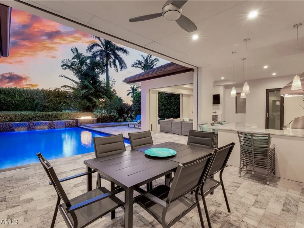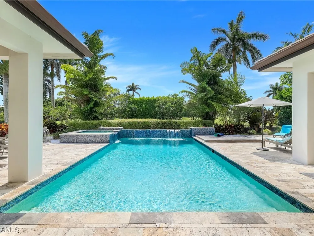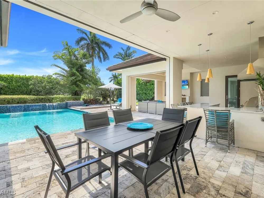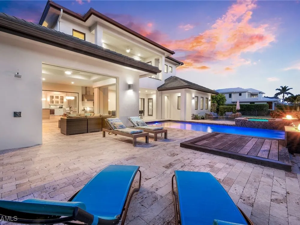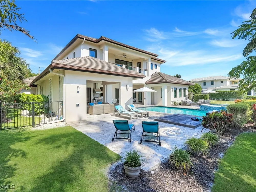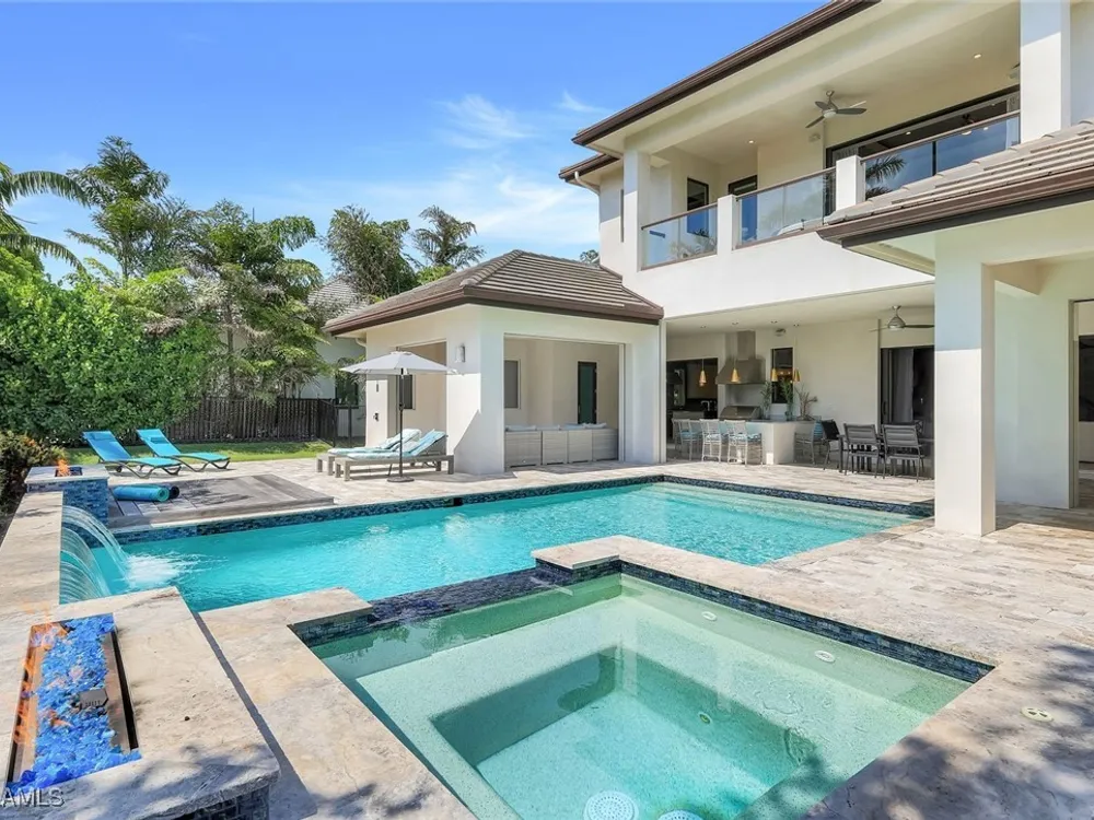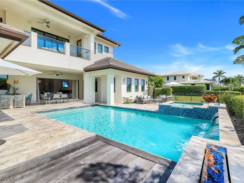 Welcome to your slice of paradise nestled on the prestigious Moorings Golf Course, where luxury living meets unparalleled natural beauty. This exquisite single-family home, perfectly positioned on the 15th green, offers an idyllic retreat for families and entertainers alike. Boasting four spacious bedrooms, a den, and four and a half elegant bathrooms, this residence is designed for comfort, style, and modern living. From the moment you step through the grand entrance, you will be captivated by the home's soaring vaulted and tray ceilings, elegantly adorned with crown molding that adds a touch of sophistication to every room. The expansive living area features gas fireplaces both indoors and on the outdoor patio, creating a cozy ambiance for family gatherings and intimate evenings under the stars. The heart of the home is the gourmet kitchen, a chef's dream, outfitted with top-of-the-line appliances including a Wolf double oven, Bosch dishwasher, and a Sub-Zero built-in refrigerator/freezer. Whether you're hosting a dinner party or preparing a weekday meal, the dual facets and mini bar refrigerator with ice maker make entertaining effortless. Adjacent to the kitchen is a spacious dining area that flows seamlessly into the living space, with recessed impact glass quad sliders that invite natural light and provide breathtaking views of the lush golf course and tranquil lake. Retreat to your opulent master suite, a true sanctuary featuring blackout shades, his and hers walk-in closets, and a spa-like en-suite bathroom. With ample space to unwind, this luxurious haven is designed to promote relaxation and rejuvenation. Each additional bedroom is generously sized, offering privacy and comfort for family members or guests. Additional office area and another living room on 2nd floor. Step outside to your personal oasis: a beautifully landscaped backyard with a sparkling pool and spa, perfect for sun-soaked afternoons and sunset soirees. The outdoor fireplace and firepits provide the ideal setting for cozy gatherings, while the expansive second-story balcony treats you to sweeping views of the golf course and stunning sunsets, making every evening a picturesque experience. This property is equipped with modern conveniences including a dedicated laundry area on the first floor and washer / dryer hook up on the second floor, two tankless hot water heaters installed in 2022, and an HVAC system put in place in 2021. The additional storage room ensures you have plenty of space for all your essentials. Safety and comfort are paramount, with recessed electric screens and shutters protecting your investment. As part of the Moorings community, you'll enjoy exclusive access to a private beach club, offering the ultimate coastal lifestyle. Whether you're hitting the links, lounging by the beach, or enjoying the vibrant local dining and shopping scene, this location truly has it all. No HOA Fees - No rental restrictions - No pet restrictions - Investor friendly
