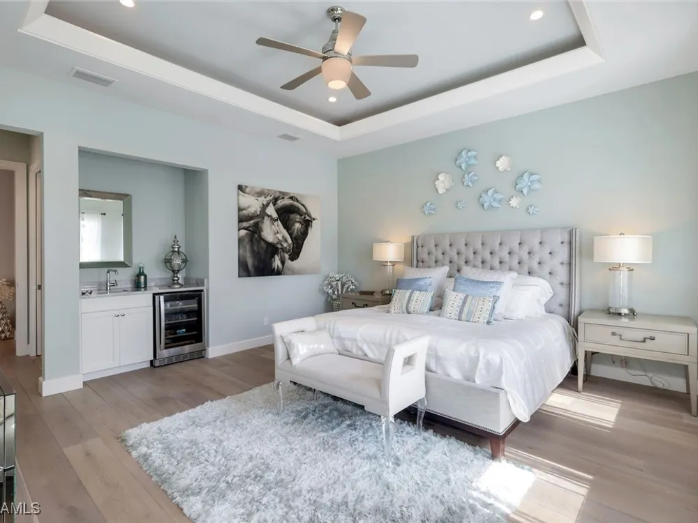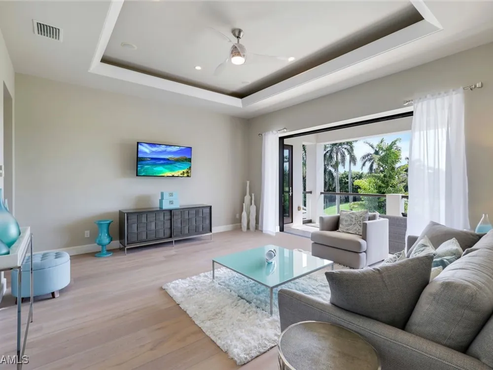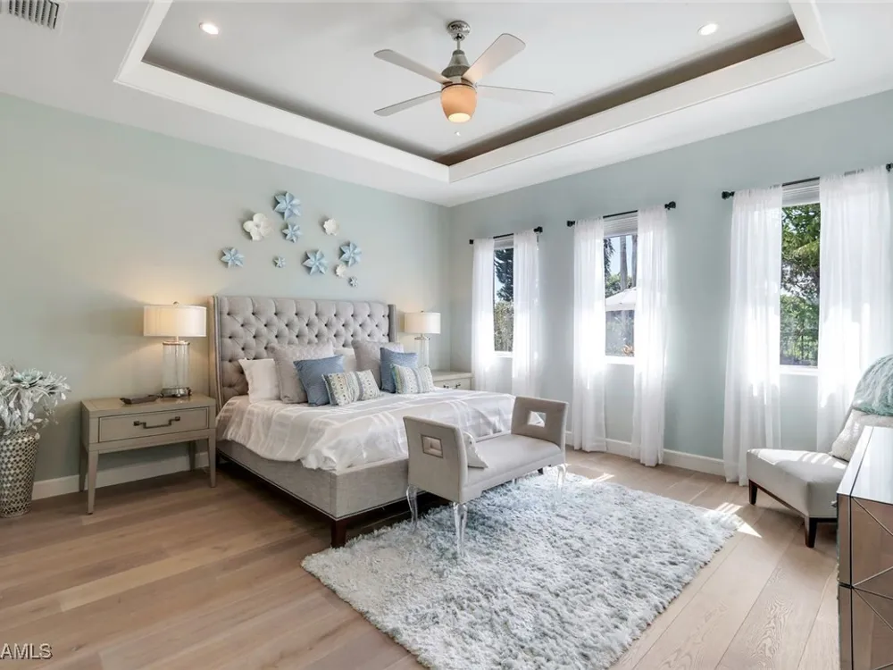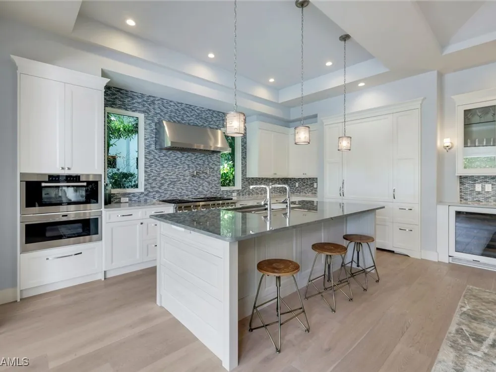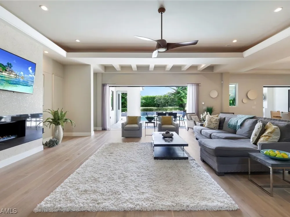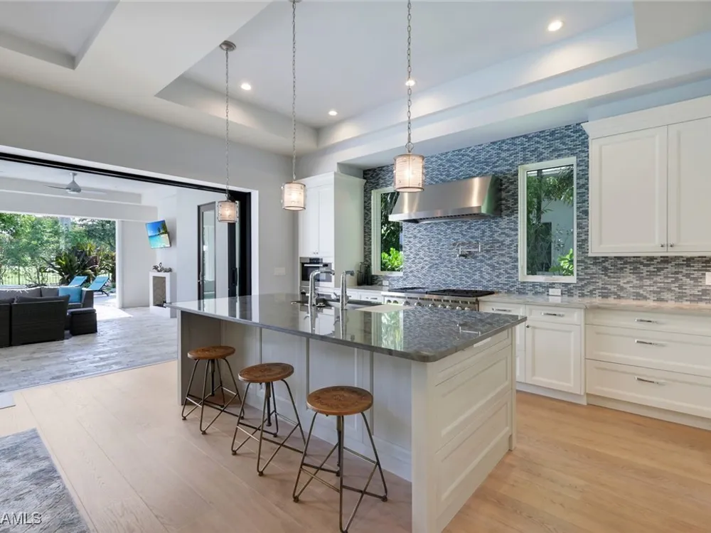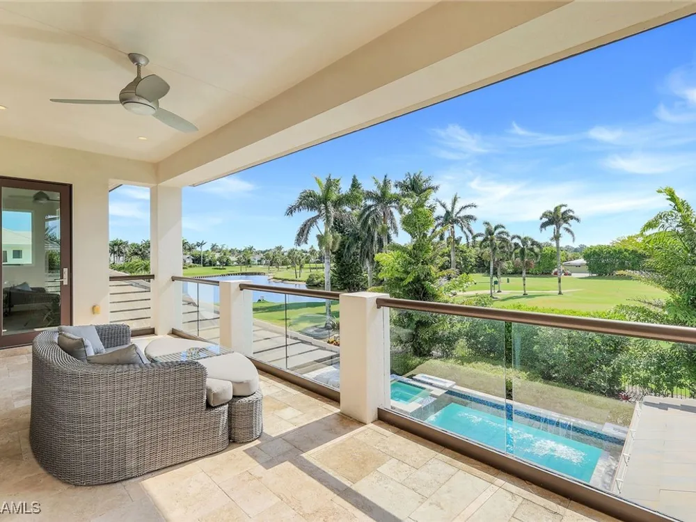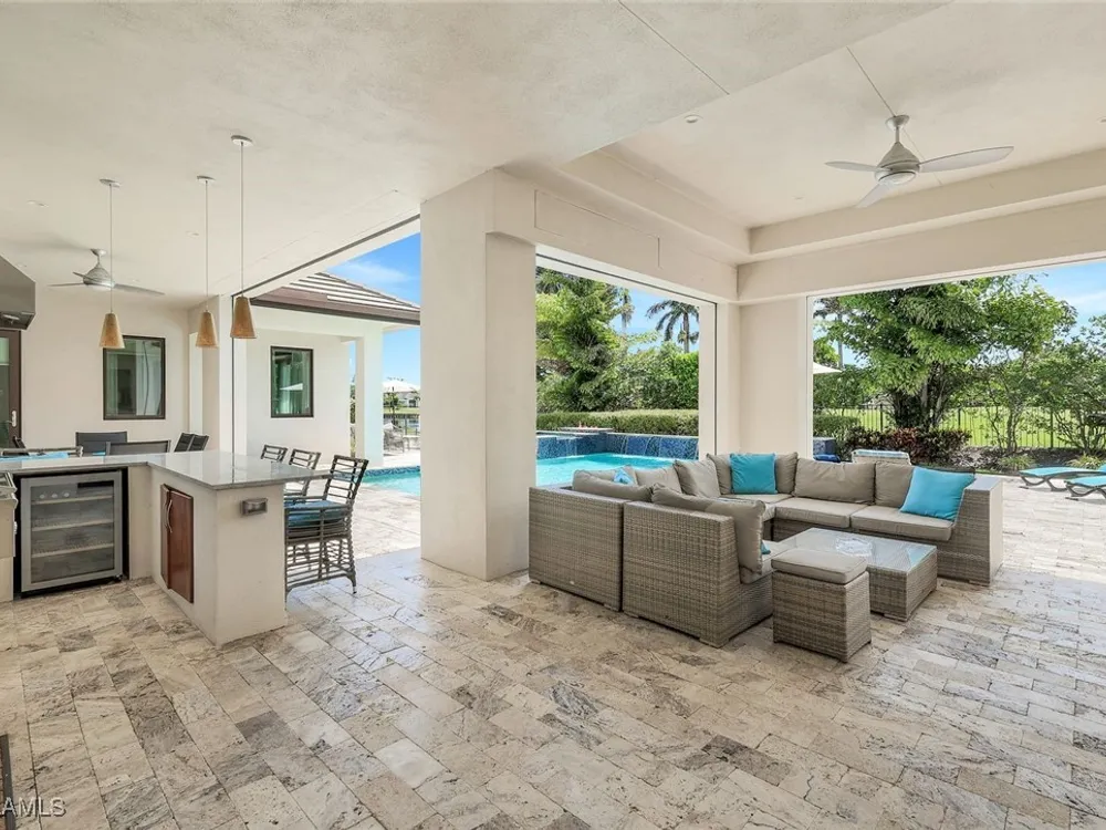 Welcome to your slice of paradise nestled on the prestigious Moorings Golf Course, where luxury living meets unparalleled natural beauty. This exquisite single-family home, perfectly positioned on the 15th green, offers an idyllic retreat for families and entertainers alike. Boasting four spacious bedrooms, a den, and four and a half elegant bathrooms, this residence is designed for comfort, style, and modern living. From the moment you step through the grand entrance, you will be captivated by the home's soaring vaulted and tray ceilings, elegantly adorned with crown molding that adds a touch of sophistication to every room. The expansive living area features gas fireplaces both indoors and on the outdoor patio, creating a cozy ambiance for family gatherings and intimate evenings under the stars. The heart of the home is the gourmet kitchen, a chef's dream, outfitted with top-of-the-line appliances including a Wolf double oven, Bosch dishwasher, and a Sub-Zero built-in refrigerator/freezer. Whether you're hosting a dinner party or preparing a weekday meal, the dual facets and mini bar refrigerator with ice maker make entertaining effortless. Adjacent to the kitchen is a spacious dining area that flows seamlessly into the living space, with recessed impact glass quad sliders that invite natural light and provide breathtaking views of the lush golf course and tranquil lake. Retreat to your opulent master suite, a true sanctuary featuring blackout shades, his and hers walk-in closets, and a spa-like en-suite bathroom. With ample space to unwind, this luxurious haven is designed to promote relaxation and rejuvenation. Each additional bedroom is generously sized, offering privacy and comfort for family members or guests. Additional office area and another living room on 2nd floor. Step outside to your personal oasis: a beautifully landscaped backyard with a sparkling pool and spa, perfect for sun-soaked afternoons and sunset soirees. The outdoor fireplace and firepits provide the ideal setting for cozy gatherings, while the expansive second-story balcony treats you to sweeping views of the golf course and stunning sunsets, making every evening a picturesque experience. This property is equipped with modern conveniences including a dedicated laundry area on the first floor and washer / dryer hook up on the second floor, two tankless hot water heaters installed in 2022, and an HVAC system put in place in 2021. The additional storage room ensures you have plenty of space for all your essentials. Safety and comfort are paramount, with recessed electric screens and shutters protecting your investment. As part of the Moorings community, you'll enjoy exclusive access to a private beach club, offering the ultimate coastal lifestyle. Whether you're hitting the links, lounging by the beach, or enjoying the vibrant local dining and shopping scene, this location truly has it all. No HOA Fees - No rental restrictions - No pet restrictions - Investor friendly