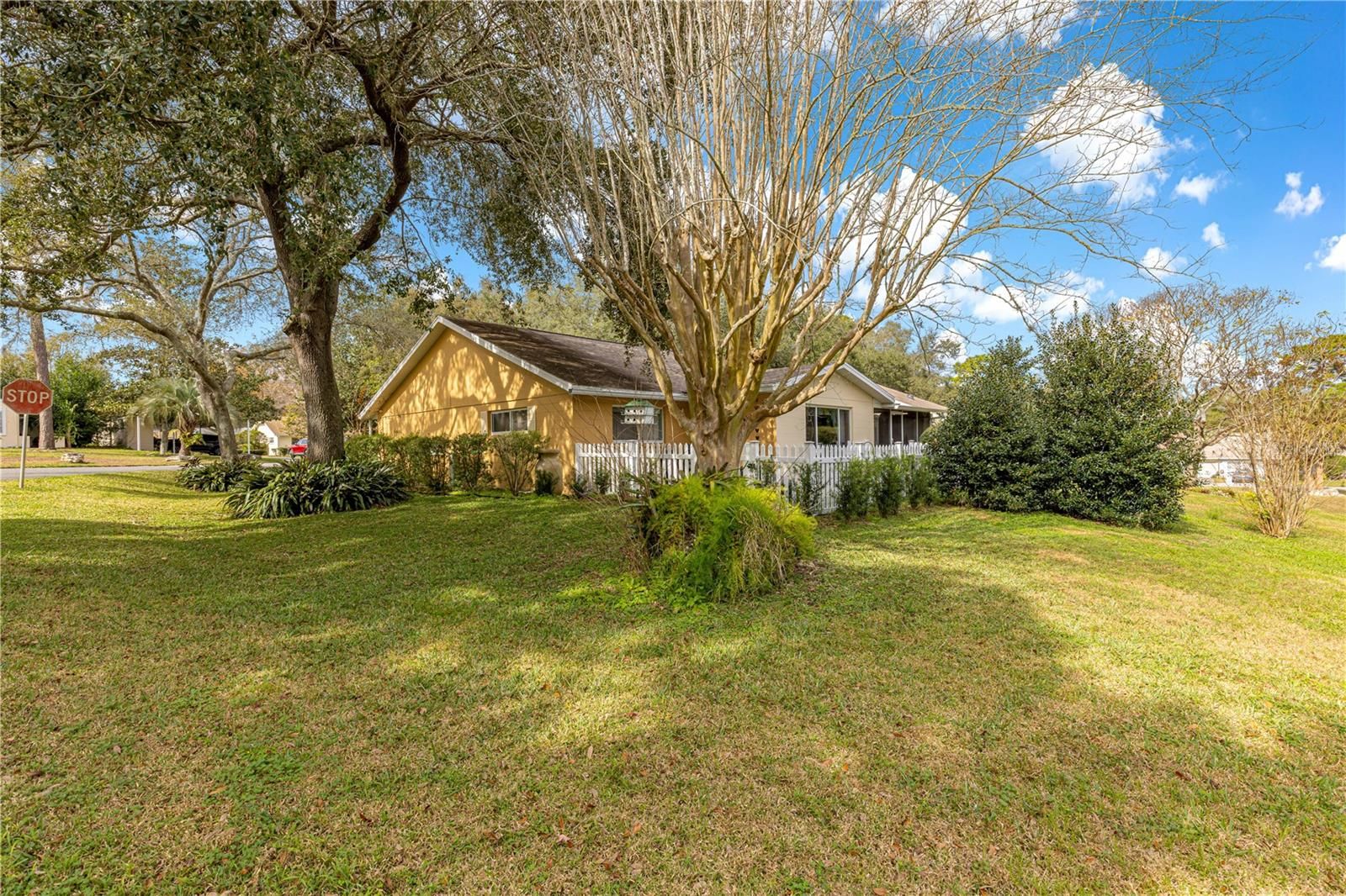 This beautiful, expanded Augusta END UNIT located in the much sought after 55+ community of On Top of the World. Fully remodeled, no carpet and plenty of space. Open concept floor plan. Kitchen features soft close cabinets, Quartz countertops and stainless steel appliances. Wood look LVP flooring throughout, updated fans and lighting fixtures. Both baths updated! Primary suite with his and hers walk-in closets and custom shelving, pretty double sink vanity and step in shower. Roof replaced in 2020. HVAC in 2017. Whole home Pelican water filtration system. Fenced back area for our furry friends. This home is priced to sell! Call for your appointment to view today.