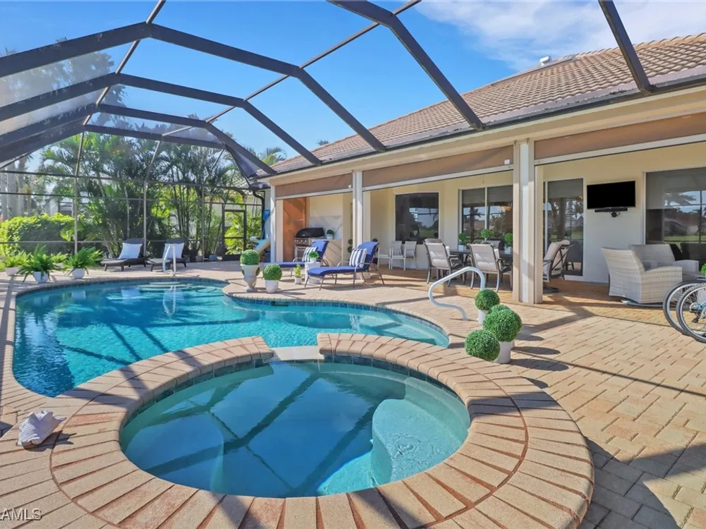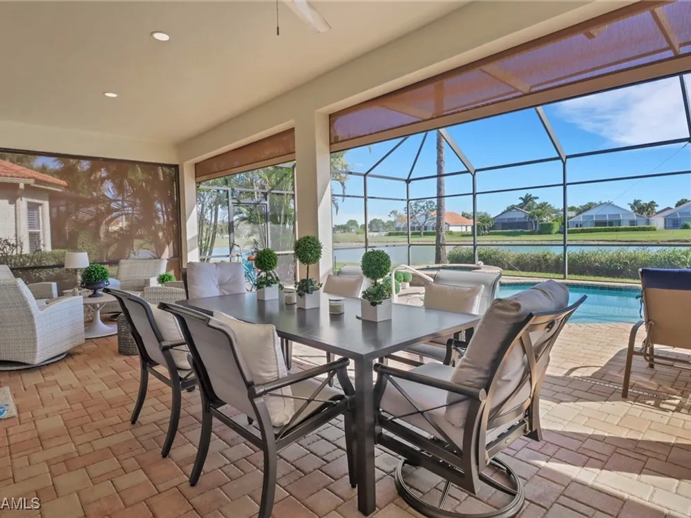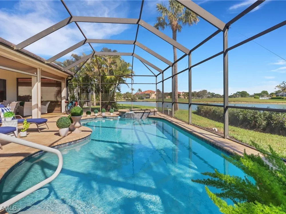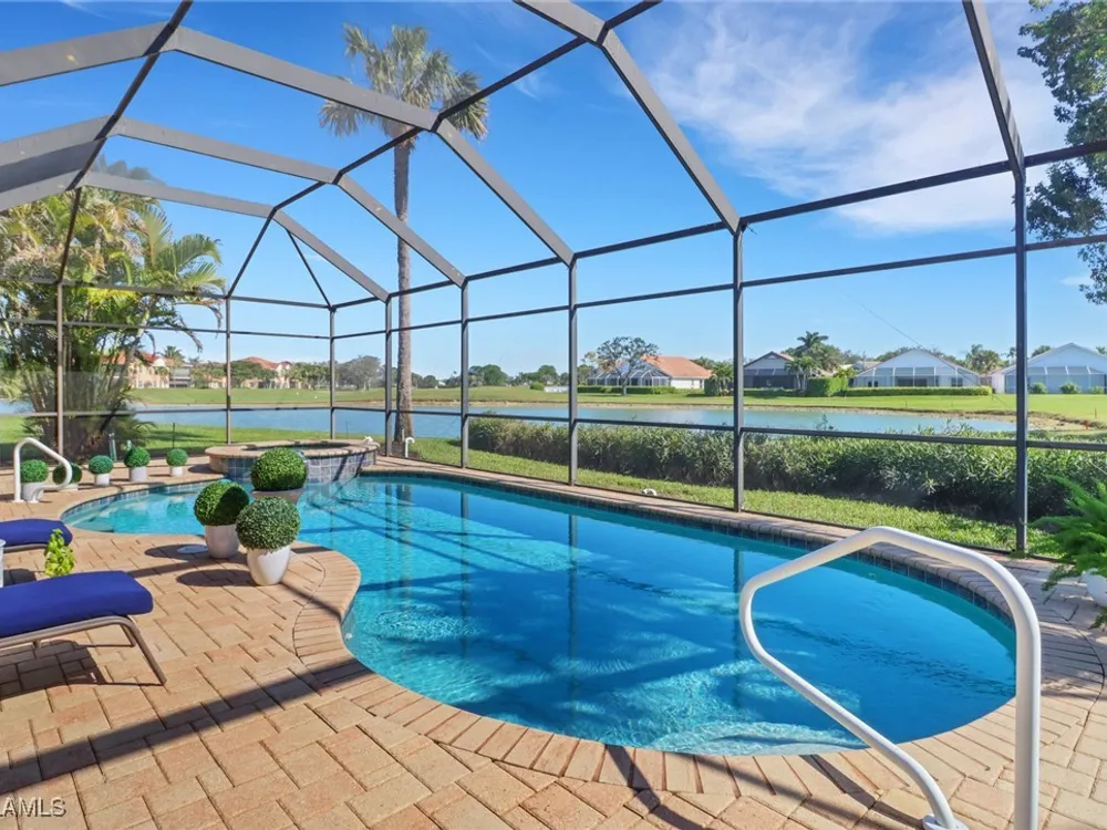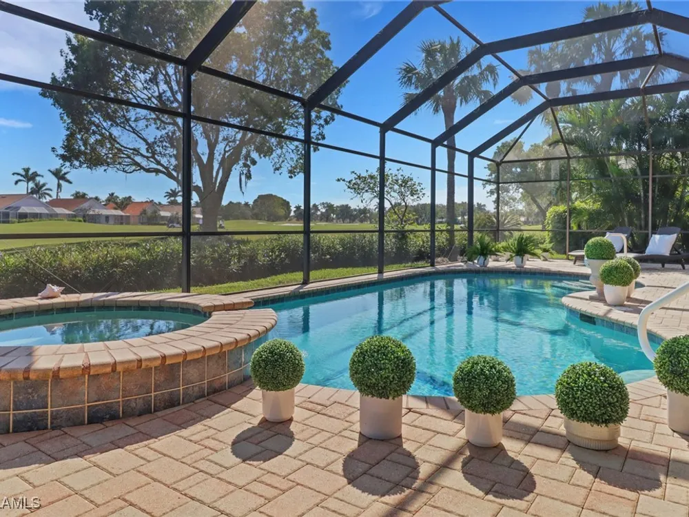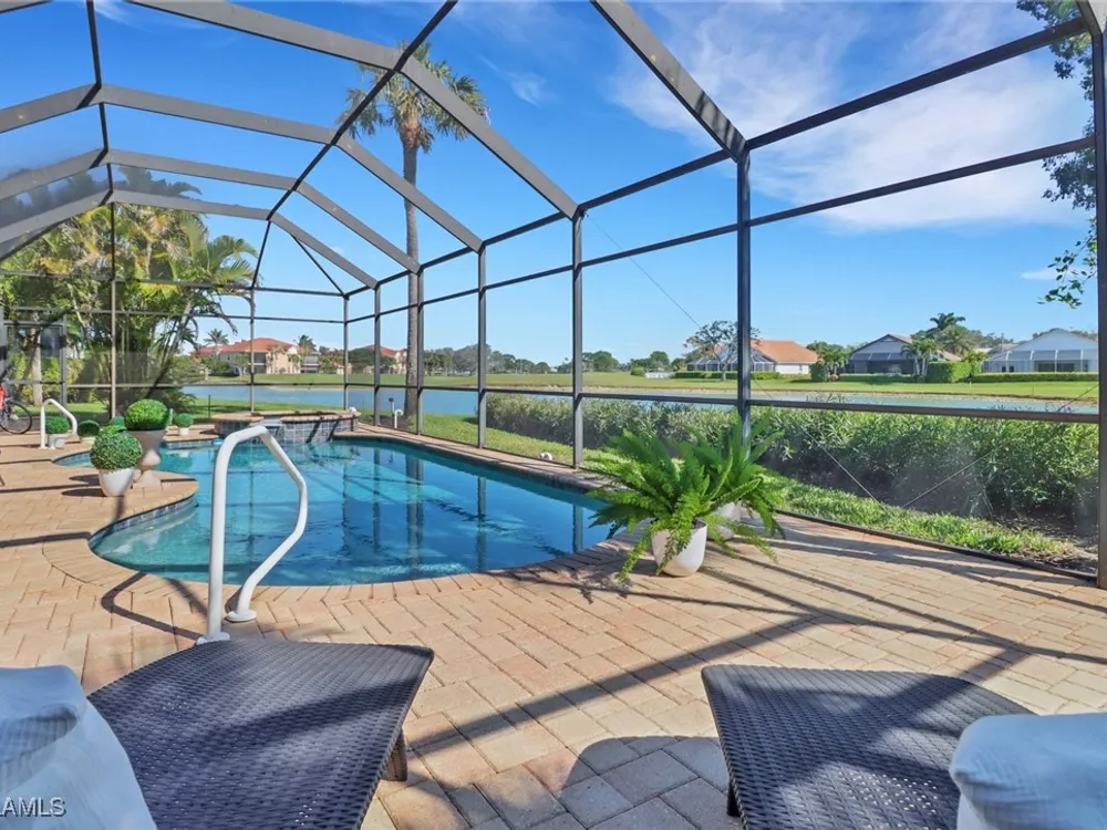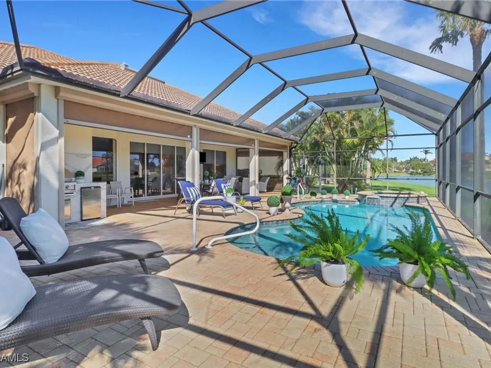 Welcome to this exquisitely remodeled ranch-style home with a brand-new roof in the highly sought-after Mustang Island neighborhood of Lely Resort, Naples, FL. Situated on a serene lakefront lot with breathtaking views of the Mustang Island Golf Course, this furnished 3-bedroom, 2-bathroom residence offers luxurious Florida living at its finest. Inside you'll find soaring ceilings, custom cabinetry, fitted blinds, and elegant mirrors enhance the home’s sophisticated charm. The open-concept design seamlessly connects the living and dining areas to the gourmet kitchen, a chef’s dream with a gas range, spacious island, and cozy breakfast nook. The master suite provides two walk-in closets, dual sinks, and a spa-like walk-in shower. The home is complemented with a versatile den, stylish dry bar, and plush carpeted bedrooms. Outside, the expansive screened patio is perfect for entertaining or unwinding, featuring a fully equipped summer kitchen, cooling fans, wine cooler, and heated pool with hot tub, all overlooking the lake and holes 10 and 11 of Mustang Island's golf course. For added peace of mind, the home includes custom storm-safe shutters and a whole-house gas generator, a rare find in this community. Don’t miss this incredible opportunity for a ready-to-move-in home, your own piece of paradise in Lely Resort!