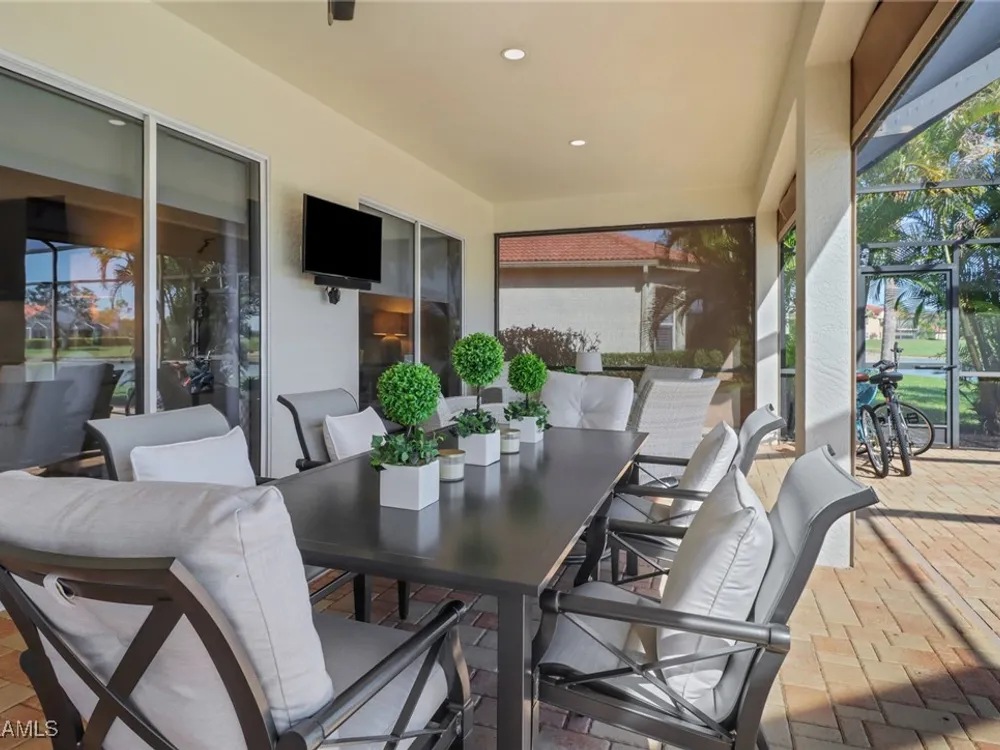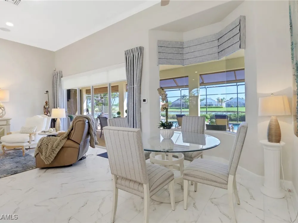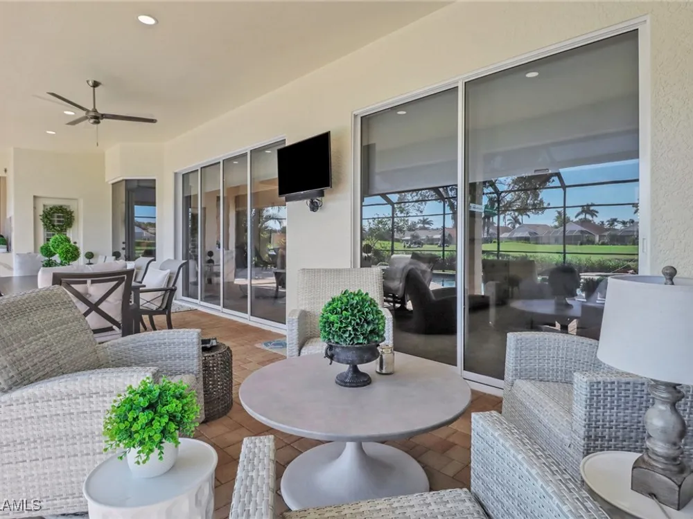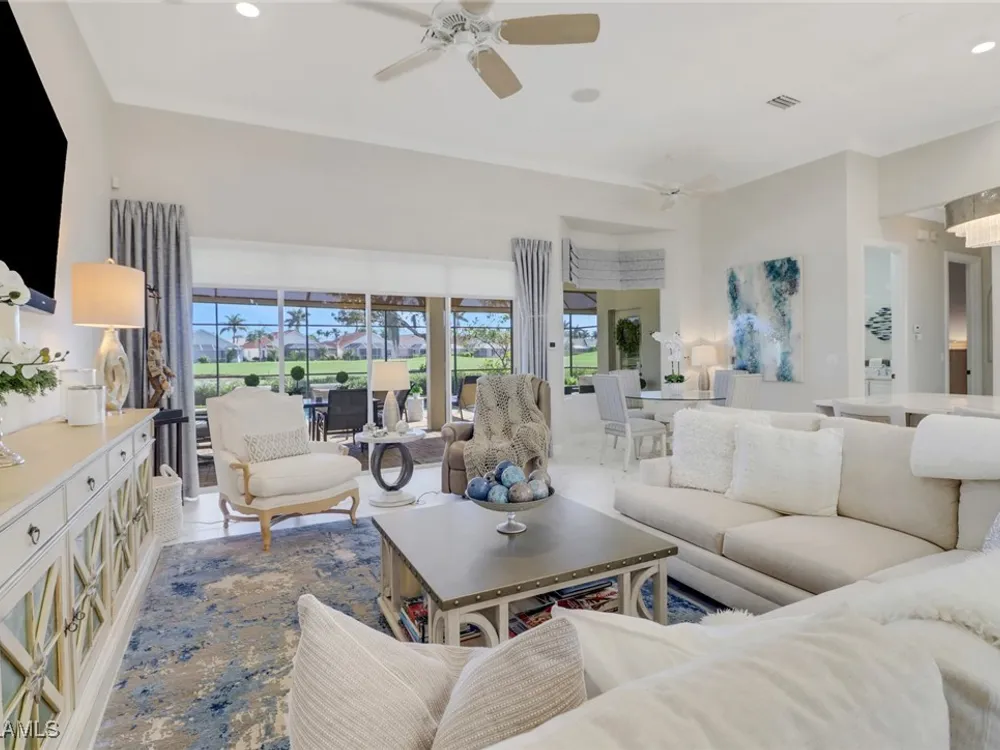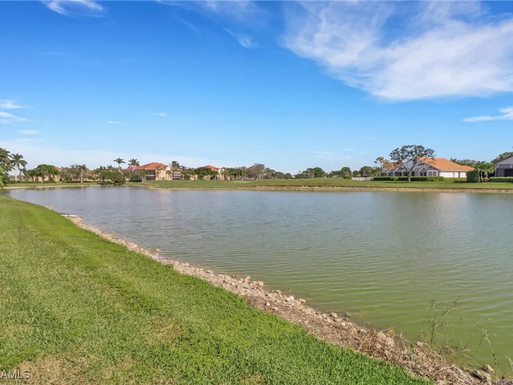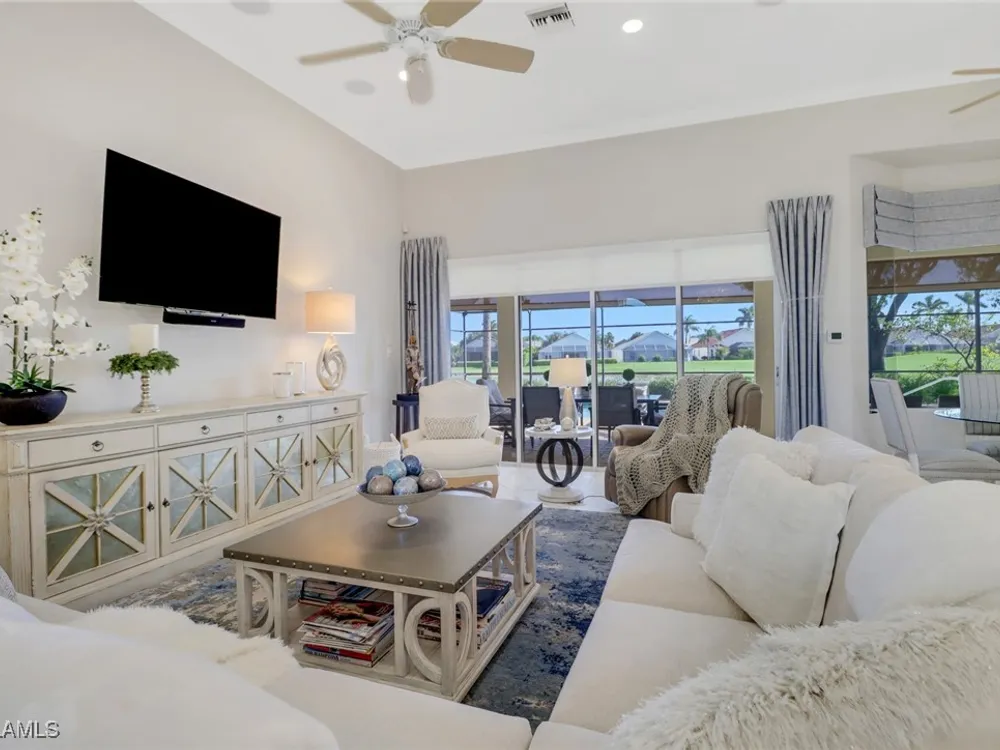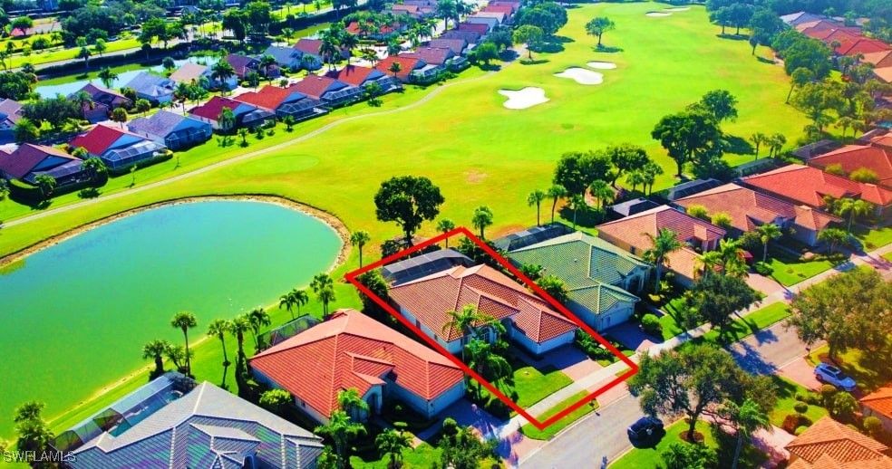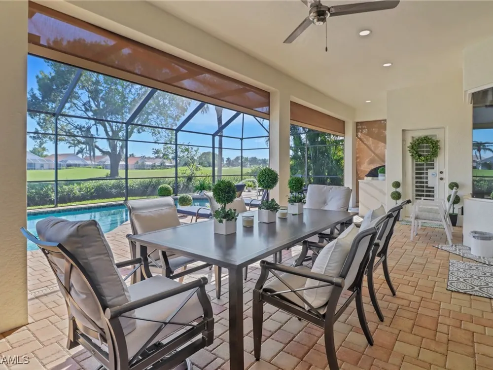 Welcome to this exquisitely remodeled ranch-style home with a brand-new roof in the highly sought-after Mustang Island neighborhood of Lely Resort, Naples, FL. Situated on a serene lakefront lot with breathtaking views of the Mustang Island Golf Course, this furnished 3-bedroom, 2-bathroom residence offers luxurious Florida living at its finest. Inside you'll find soaring ceilings, custom cabinetry, fitted blinds, and elegant mirrors enhance the home’s sophisticated charm. The open-concept design seamlessly connects the living and dining areas to the gourmet kitchen, a chef’s dream with a gas range, spacious island, and cozy breakfast nook. The master suite provides two walk-in closets, dual sinks, and a spa-like walk-in shower. The home is complemented with a versatile den, stylish dry bar, and plush carpeted bedrooms. Outside, the expansive screened patio is perfect for entertaining or unwinding, featuring a fully equipped summer kitchen, cooling fans, wine cooler, and heated pool with hot tub, all overlooking the lake and holes 10 and 11 of Mustang Island's golf course. For added peace of mind, the home includes custom storm-safe shutters and a whole-house gas generator, a rare find in this community. Don’t miss this incredible opportunity for a ready-to-move-in home, your own piece of paradise in Lely Resort!