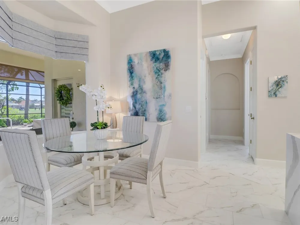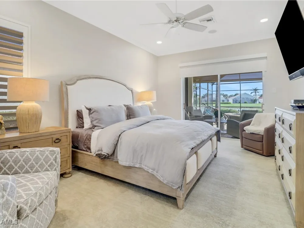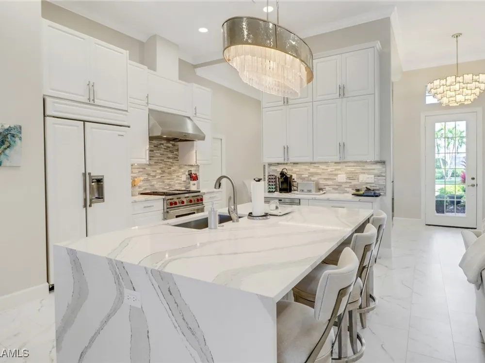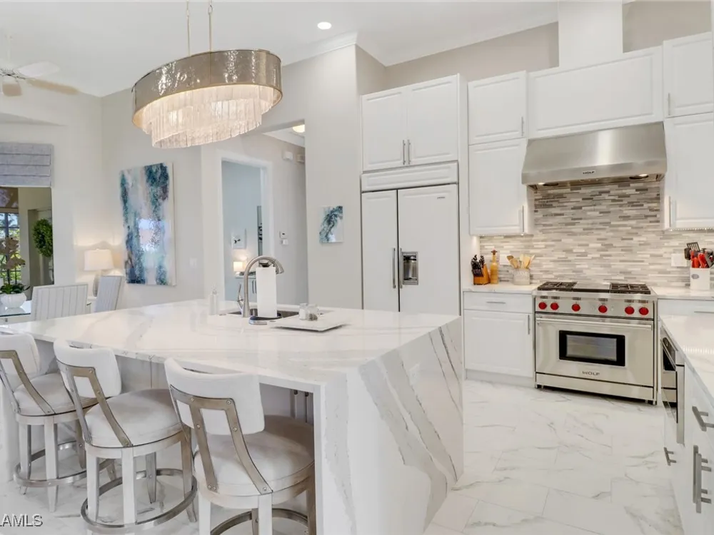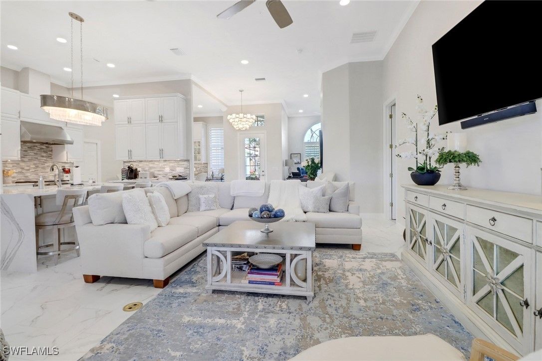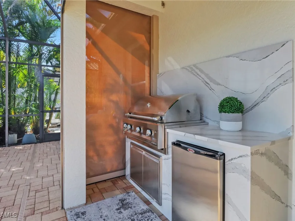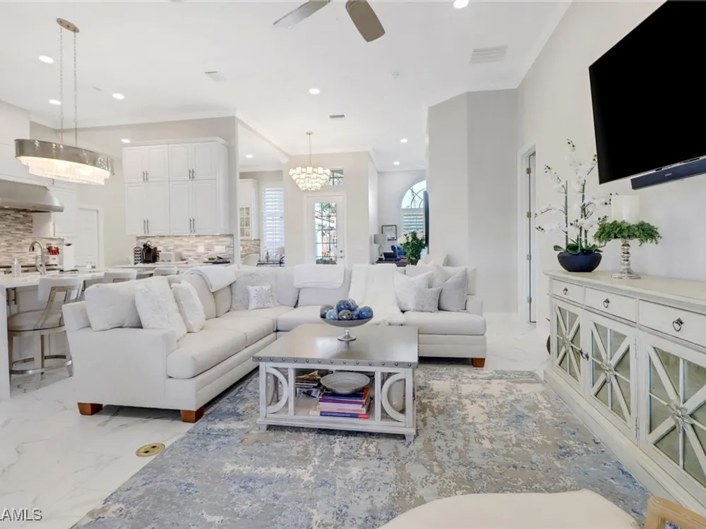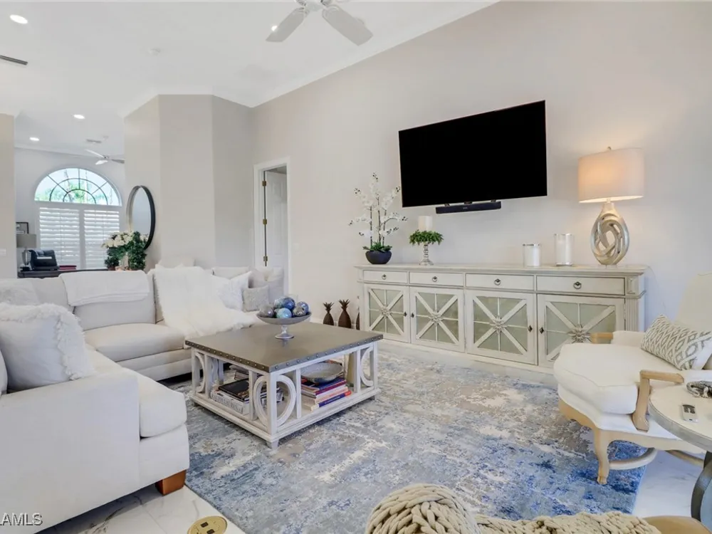Welcome to this exquisitely remodeled ranch-style home with a brand-new roof in the highly sought-after Mustang Island neighborhood of Lely Resort, Naples, FL. Situated on a serene lakefront lot with breathtaking views of the Mustang Island Golf Course, this furnished 3-bedroom, 2-bathroom residence offers luxurious Florida living at its finest. Inside you'll find soaring ceilings, custom cabinetry, fitted blinds, and elegant mirrors enhance the home’s sophisticated charm. The open-concept design seamlessly connects the living and dining areas to the gourmet kitchen, a chef’s dream with a gas range, spacious island, and cozy breakfast nook. The master suite provides two walk-in closets, dual sinks, and a spa-like walk-in shower. The home is complemented with a versatile den, stylish dry bar, and plush carpeted bedrooms. Outside, the expansive screened patio is perfect for entertaining or unwinding, featuring a fully equipped summer kitchen, cooling fans, wine cooler, and heated pool with hot tub, all overlooking the lake and holes 10 and 11 of Mustang Island's golf course. For added peace of mind, the home includes custom storm-safe shutters and a whole-house gas generator, a rare find in this community. Don’t miss this incredible opportunity for a ready-to-move-in home, your own piece of paradise in Lely Resort!