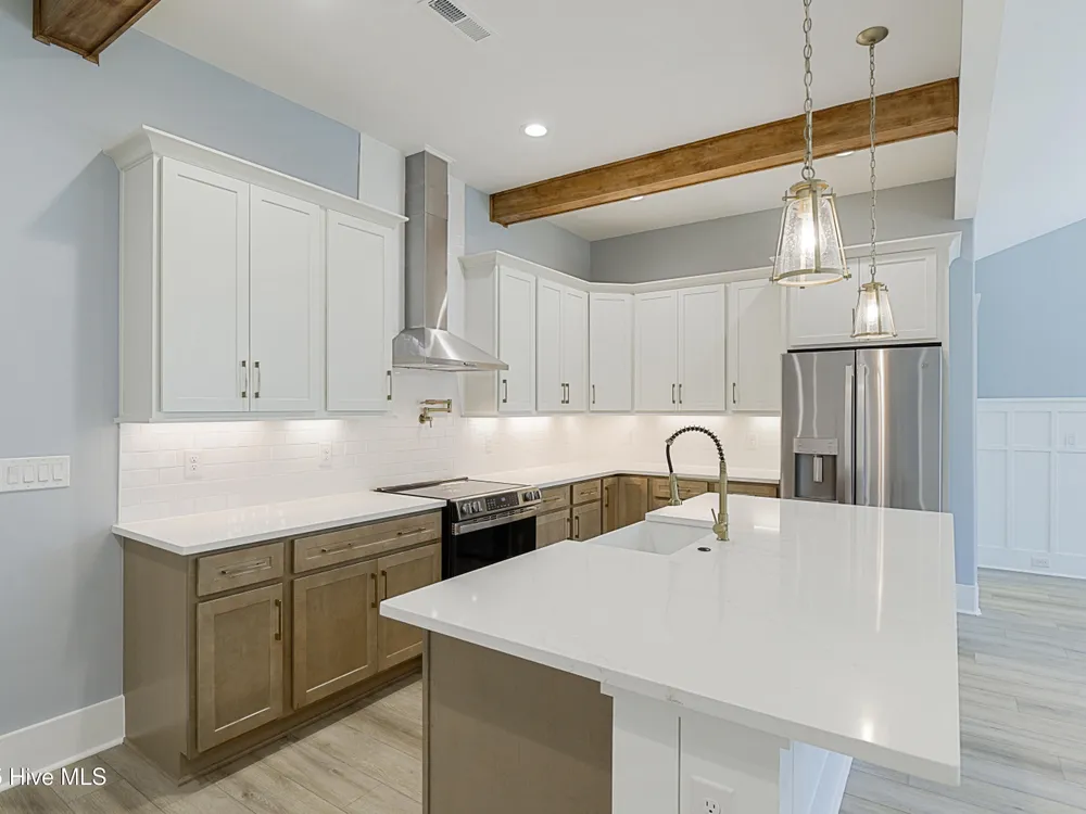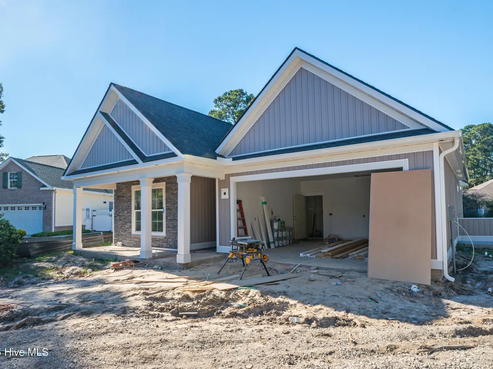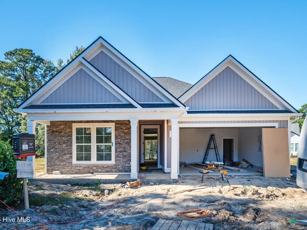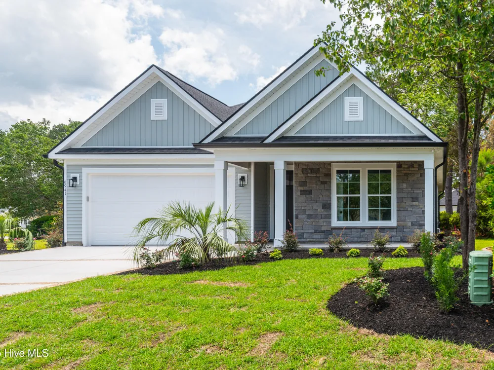 Looking for a brand-new home that showcases quality craftsmanship and thoughtful design? Your search ends here! This 3-bedroom, 2-bathroom Craftsman-style home by Fox Homes, one of the area's premier custom builders, is nearly complete and ready to impress. Located in the prestigious gated golf community of Brunswick Plantation, this 1600-sq-ft beauty combines timeless style with modern comfort. From the moment you arrive, the stone-accented exterior, and inviting front porch set the tone for exceptional curb appeal. Step inside to discover 9 foot ceilings, a vaulted living area with wood beams, and elegant tray ceilings in both the foyer and primary suite. The open-concept floor plan seamlessly connects the kitchen, dining, and living areas--perfect for entertaining or relaxing at home. The chef's kitchen features custom cabinetry, quartz countertops, a subway tile backsplash, and an impressive island with plenty of seating. Detailed crown molding, built-in cabinetry, and custom wainscoting add character throughout the home. Your primary suite is a retreat of its own, complete with an walk-in closet with built-ins and a luxurious en-suite bathroom featuring a large tiled shower, double vanities. Additional highlights include a built-in drop zone, spacious laundry room, and a screened back porch--ideal for unwinding after a day on the golf course. Homeowners at Brunswick Plantation enjoy resort-style amenities including indoor and outdoor pools, a hot tub, fitness center, tennis and pickleball courts, and of course, championship golf. Conveniently located near the charming shops and restaurants of downtown Calabash, you're just minutes from Sunset Beach and a short drive to all the attractions of the Myrtle Beach area.