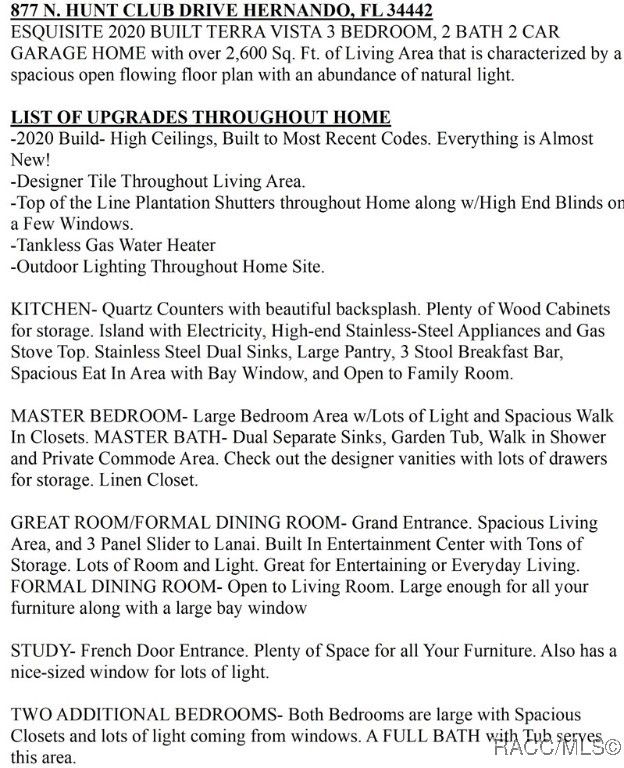 WELCOME HOME to this 2020 BUILT, IMACULATELY MAINTAINED, BEAUTIFULLY DECORATED, TERRA VISTA HOME LOADED WITH UPGRADES. You will love everything about this Great Room/Den, 3 Bedroom, 2 Bath, 2 Car Garage located in the Village of Hunt Club. Even better news, it’s minutes away from some of the best amenities in the state. This home has many features that are too numerous to list here (Please see picture section for list) but the highlights include: A well-designed, Chef's Delight Kitchen that has plenty of counter (Quartz) and cupboard space (designer wood), High End Stainless Appliances, Pantry, and Eat In Area. Your Master Suite is private, has plenty of room for all your furniture, walk in closets and a Bath Suite fit for royalty. It gets better, your Living Space includes a Great Room, Dining Room, and Den. Perfect for entertaining or everyday living. Talking about entertaining, your Large Covered and Screened Lanai will be the hit of the show. The privacy, plenty of room for all your furniture, and the Peaceful Easy Feeling are the features you will love the most. There is more! Two Large Additional Bedrooms are perfect for family or guests, ample in size, plenty of closet space, and split from Master Suite. Full Bath serves this area. Large 2 Car Garage, Indoor Laundry Room and beautifully landscaped home site with numerous fruit trees that will put a smile on your face. Yes, it sounds unbelievable but the second you walk in, you will see this home has the IT FACTOR!