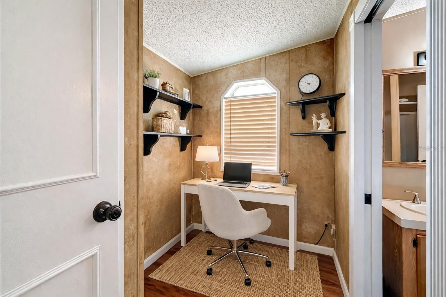 Welcome to this beautifully updated home in Sun Country Estates, offering a flexible split-bedroom layout, hardwood floors throughout, and exceptional indoor and outdoor versatility. The spacious living and dining room combination features cathedral ceilings and ceiling fans in every room, creating an open, comfortable feel. Virtual staging is used in select images to demonstrate possible furnishings and room scale. No physical changes have been made to the property. The kitchen is generously sized with oak cabinetry, a cabinet-style laundry area, and appliances including the range and refrigerator. Just beyond the kitchen is a small flex room currently used as a home office — ideal for remote work, hobbies, or extra storage. The home features two private bedroom suites, each with its own full bath, making it ideal for guests or multi-generational living. Major updates include a newer roof (2013) and updated flooring. Outdoor enjoyment is a standout, with a wood deck off the back of the home leading to a brick patio and brick fire pit, perfect for entertaining. The fully fenced backyard features vinyl privacy fencing, a stone fountain feature (currently landscaped as a flower bed; original pond flooring is stored in the garage and can be easily reconnected), plus multiple storage sheds. For those needing space for hobbies, vehicles, or projects, the property offers a detached one-car garage/workshop, a rear carport, an additional carport at the end of the driveway, and a large workshop with electricity. Two separate sheds provide even more storage and flexibility. Low property taxes add to the appeal. The home is vacant, and remaining furniture currently in the home will convey. A unique opportunity offering space, privacy, and functionality — all in a convenient Ocala location.