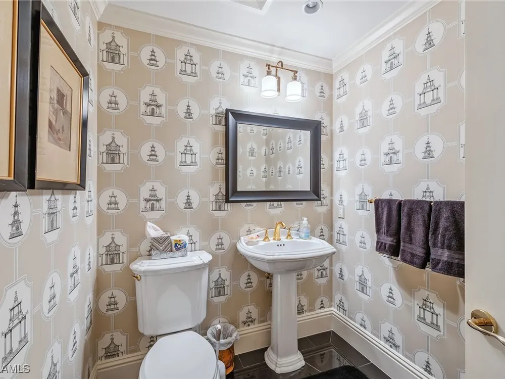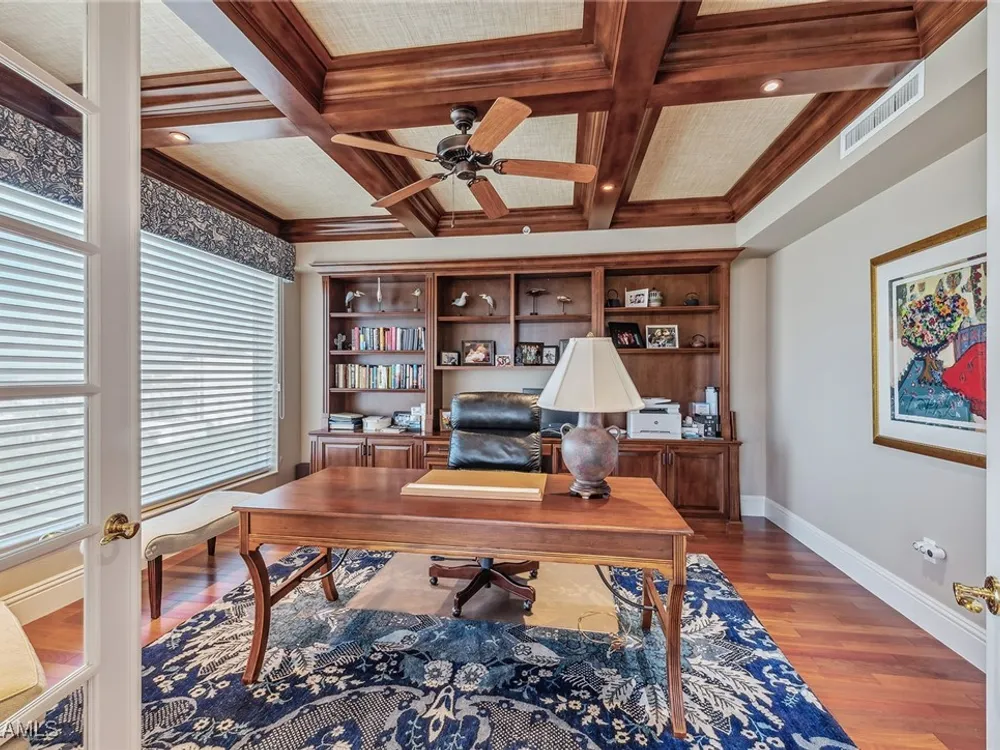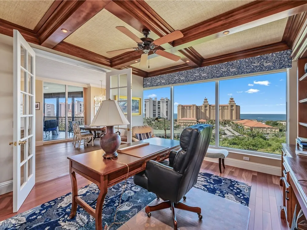 Gorgeous high-floor views. Enter this spacious and popular four-bedroom, 4.5-bath floor plan from your private foyer into an expansive living and entertaining space highlighted by floor-to-ceiling sliding glass doors, polished travertine tile flooring and an expansive screened-in lanai with electric rolldown hurricane barrier. The design has been cleverly modified to include a dedicated office next to the kitchen with outstanding light and views. The kitchen design features a built-out countertop, bright white cabinetry, stainless appliances and a separate breakfast table area. The spa-inspired primary bath features an oversized shower, dual vanities and dual water closets. Your friends and family can enjoy maximum privacy in three spacious guest suites, all with en-suite baths. Trieste is planning upgrades to common areas and residents enjoy a geo-heated tropical pool, fitness room, social room, library and staffed front desk in the lobby. Experience Bay Colony and Pelican Bay beach clubs, with attended beach services or work on your serve at the newly renovated Bay Colony Tennis Club.