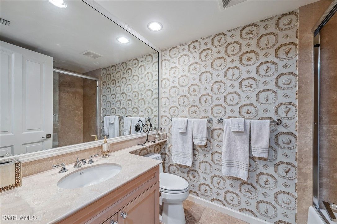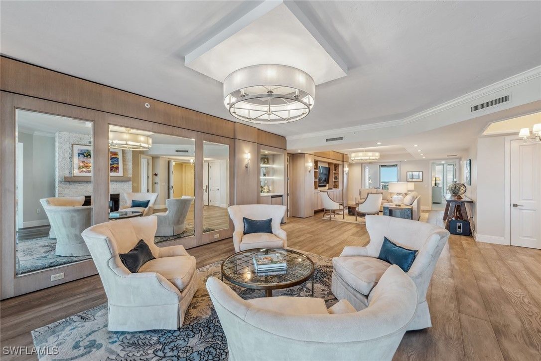 Gorgeous high-floor three-bedroom-plus-den, three-and-a-half-bath Gulf-view designer renovation with custom finishes and upgrades throughout. Your private foyer welcomes you into an expansive living and entertaining space highlighted by designer light fixtures, custom ceiling trim and the finest decor choices. The renovated kitchen design features stainless steel appliances, smooth-close cabinetry and neutral soothing solid surface countertops. The spa-inspired primary bath features an oversized shower, dual vanities and professionally designed lighting and a separate standalone soaking tub. Your friends and family can enjoy maximum privacy in two spacious guest suites with en-suite baths. Trieste has completed refreshing upgrades to common areas and residents enjoy a geo-heated tropical pool, fitness room, social room, library and staffed front desk in the lobby. Experience Bay Colony and Pelican Bay beach clubs with attended beach services or work on your serve at Bay Colony Tennis Club.