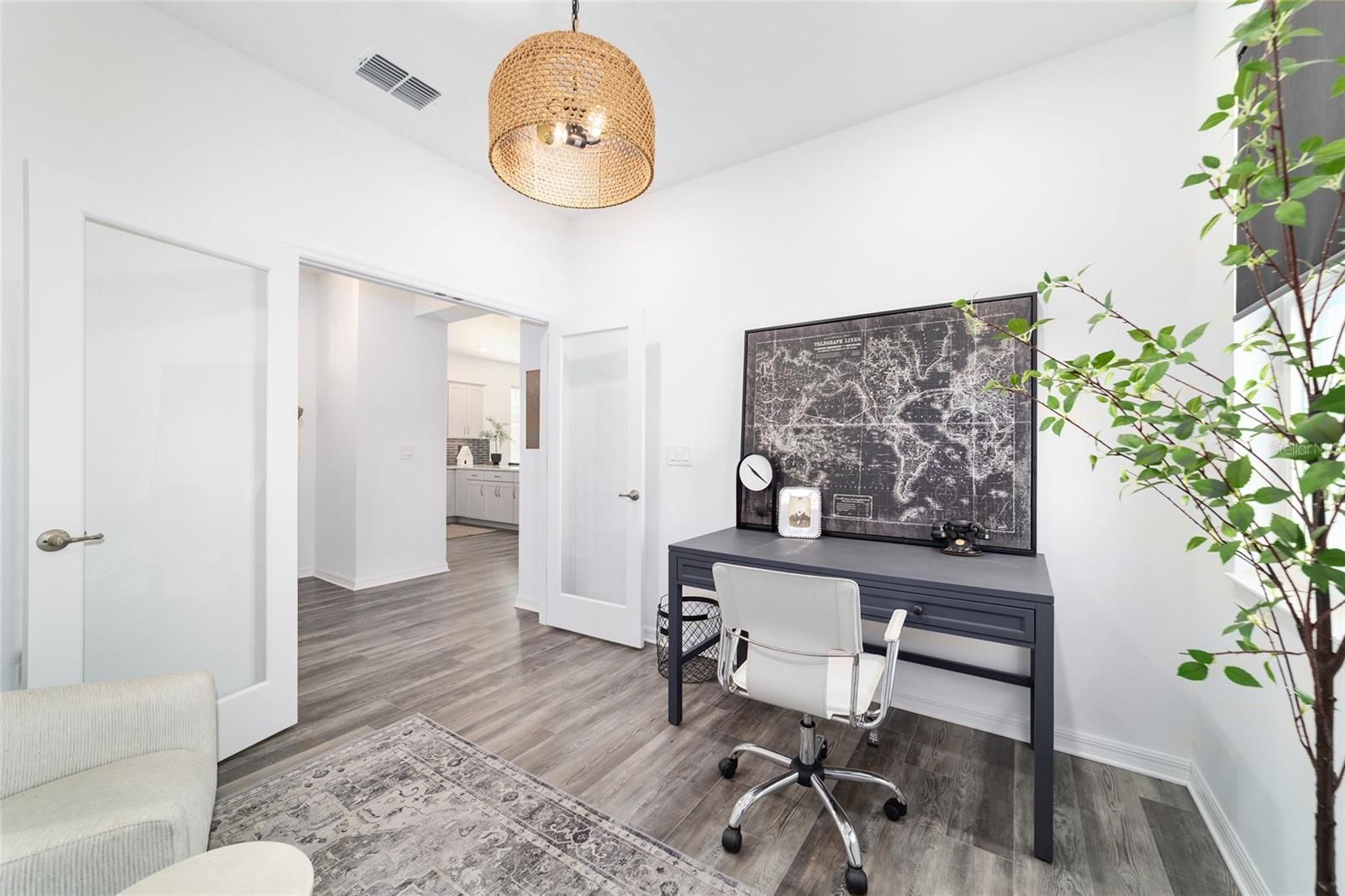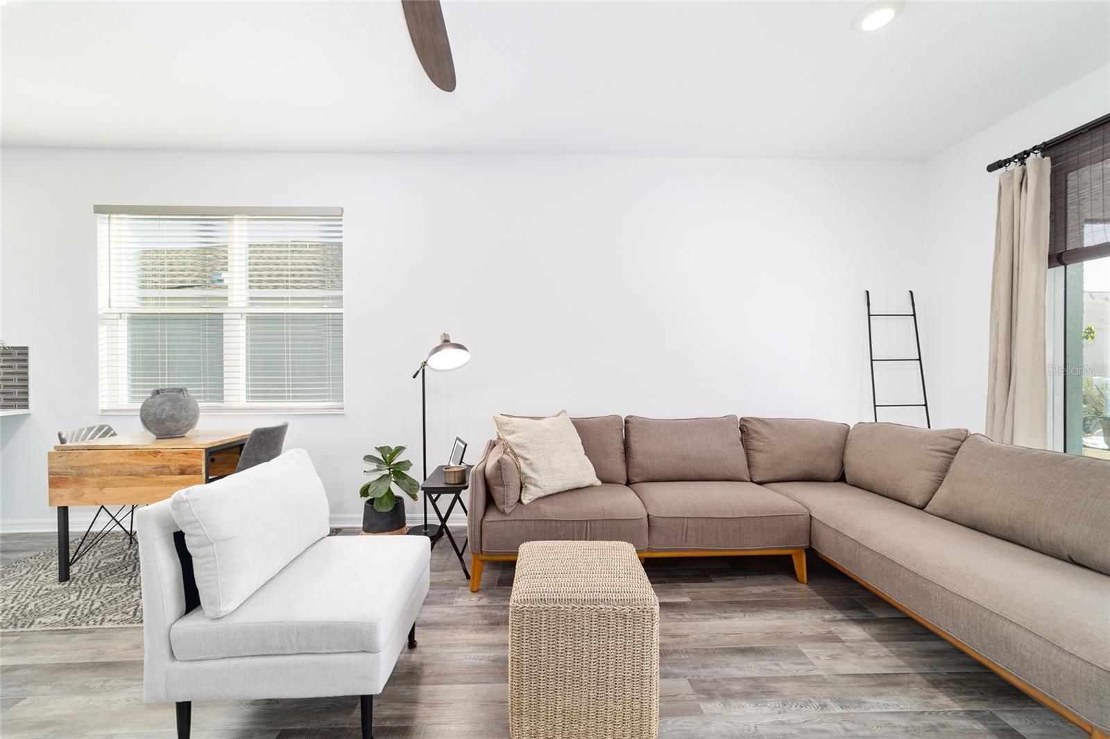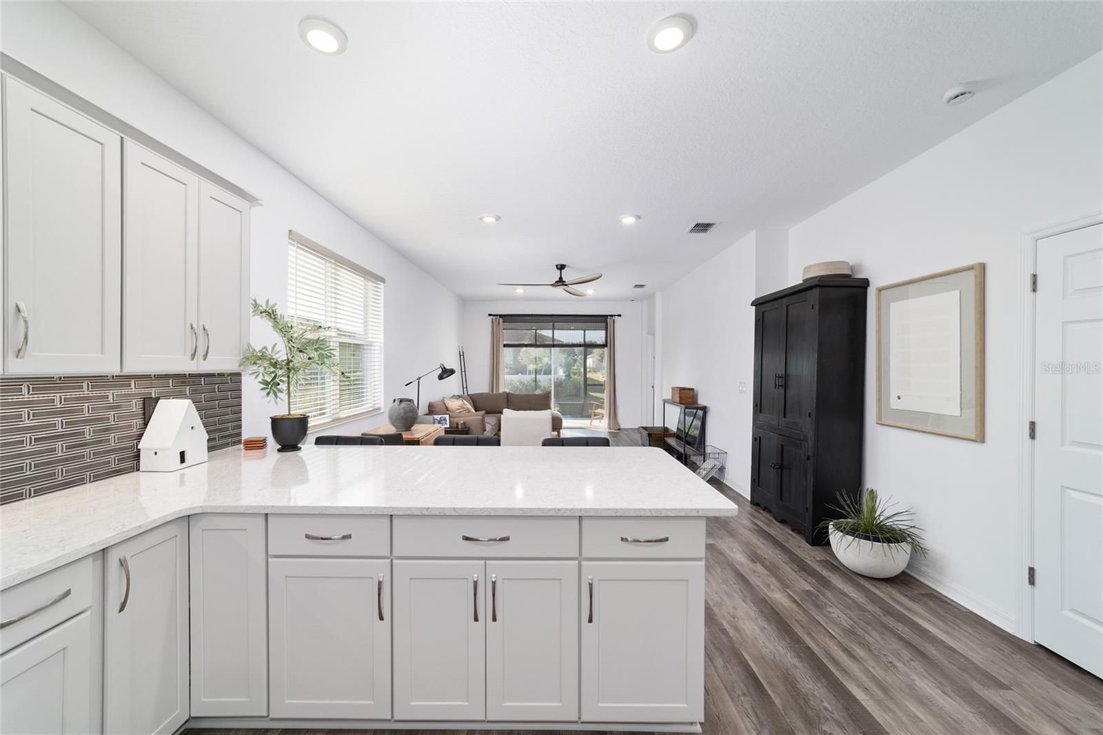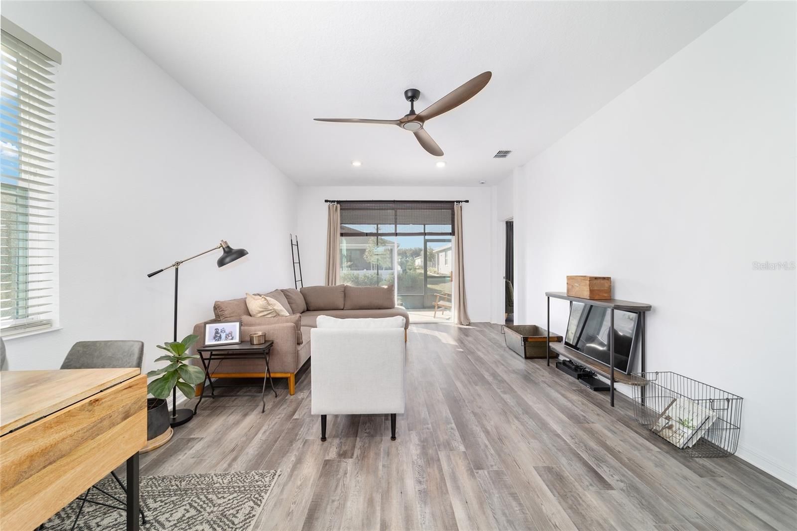 This stylish Tamar model is located in the Weybourne Landing neighborhood of On Top of the World and offers 2 bedrooms, 2 bathrooms, and a flex room with French doors, along with a 2-car garage. The open-concept layout features a foyer that leads into the kitchen, dining, and living areas. Luxury vinyl plank flooring throughout creates a bright, open feel. The kitchen includes 42" cabinetry with crown molding and a lazy Susan, under-cabinet LED lighting, quartz countertops, a breakfast bar, pantry, stainless steel Whirlpool appliances, natural gas cooking, and a tile backsplash. The primary suite offers a walk-in closet and an ensuite bath with dual quartz vanities, a linen closet, and a walk-in shower with floor-to-ceiling tile and a glass enclosure. A secondary bedroom is positioned at the front of the home, while the flex room provides additional space suitable for a home office, den, or hobby area. The guest bath includes a quartz vanity and a tub/shower combination. Additional features include custom window treatments, ceiling fans, landscaped grounds, and a screened lanai that extends the living space outdoors. Residents of On Top of the World enjoy access to a wide range of amenities, including golf courses, a driving range, clubhouses, fitness centers, indoor and outdoor pools, and numerous clubs and activities. The community offers convenient access to shopping, dining, medical facilities, the The World Equestrian Center, and downtown Ocala.