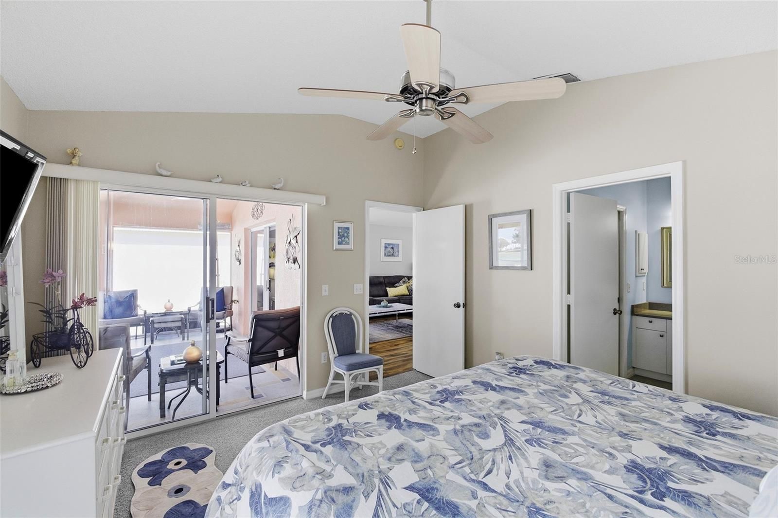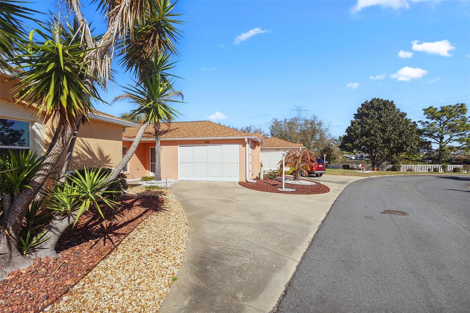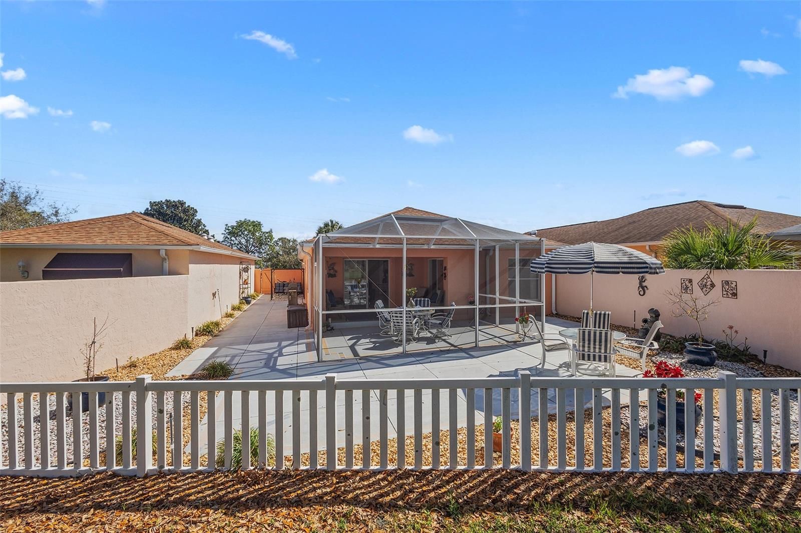 Golf Frontage Courtyard Villa | Tastefully TURNKEY | Located across from Tierra Del Sol Recreation Center Large Homesite with Expansive Birdcage | Roof 2015 | HVAC 2018 | NO BOND From the moment you arrive, this charming Courtyard villa in the Village of Palo Alto welcomes you with low-maintenance Florida landscaping and a spacious homesite that provides an open feel rarely found in villa living. Perfectly positioned directly across the street from Tierra Del Sol Recreation Center, Championship Golf Course, dining, and entertainment, this location places you just minutes from the vibrant lifestyle of both Spanish Springs Town Square and Lake Sumter Landing. WATCH THE TOUR VIDEO by clicking on the Tour Link. Step inside to a light and inviting interior featuring VOLUME CEILINGS that enhance the open feel of the 1,116 square feet of living space. The thoughtfully designed floor plan flows comfortably through the main living and dining areas into the kitchen, creating an easy layout for both everyday living and entertaining. This home is being offered TASTEFULLY TURNKEY , making it simple to begin enjoying The Villages lifestyle immediately. The primary suite offers a comfortable private retreat and features an updated ensuite bathroom with quartz countertops and a beautifully tiled walk-in shower with an upgraded glass enclosure. You'll love the spacious walk-in closet, and direct entry to the lanai through the sliding doors. The guest bathroom has also been tastefully updated with quartz countertops, providing a fresh and cohesive feel throughout both baths. The second bedroom and guest bath create a welcoming space for visiting family and friends. Outdoor living is where this home truly shines. The large rear birdcage overlooks scenic golf frontage, offering a peaceful setting to relax with morning coffee or unwind while enjoying Florida sunsets over the fairway. The generous lot enhances the sense of openness and provides a wonderful extension of the living space. Additional updates include a ROOF replaced in 2015 and HVAC in 2018, providing peace of mind for years to come. With its stucco exterior, low-maintenance landscaping, golf views, and unbeatable location near Tierra Del Sol, this courtyard villa is an exceptional opportunity for a full-time residence, seasonal getaway, or investment in the heart of The Villages.
