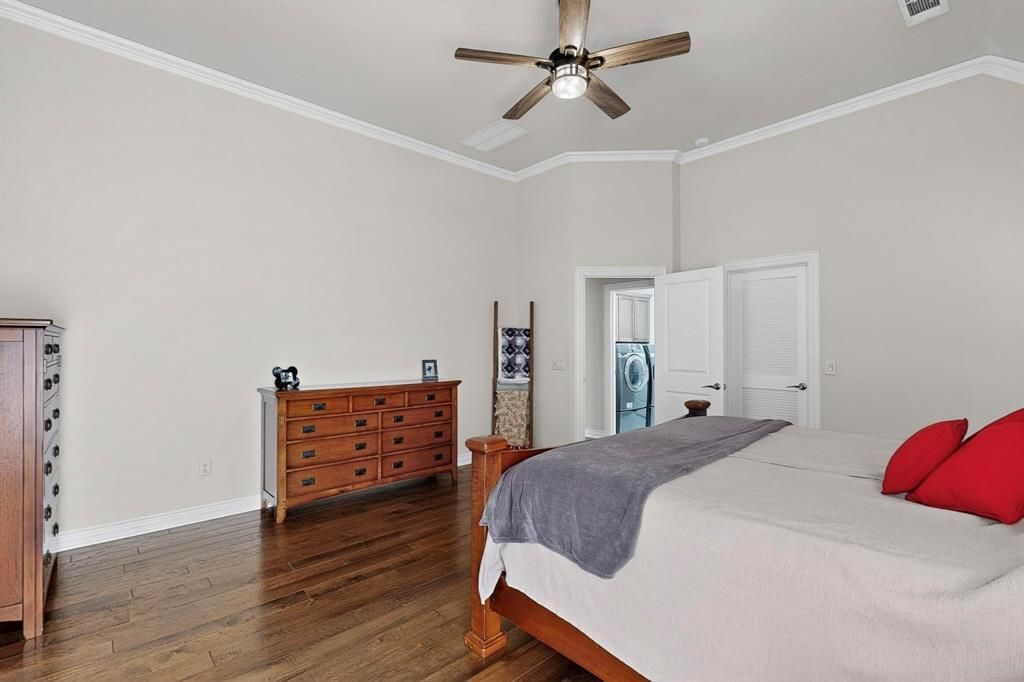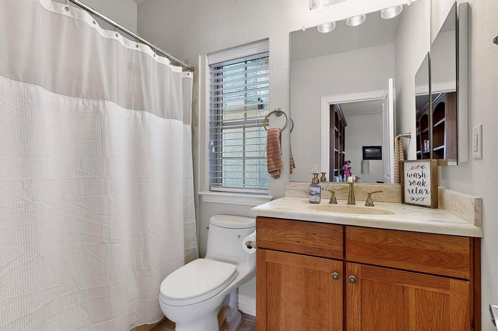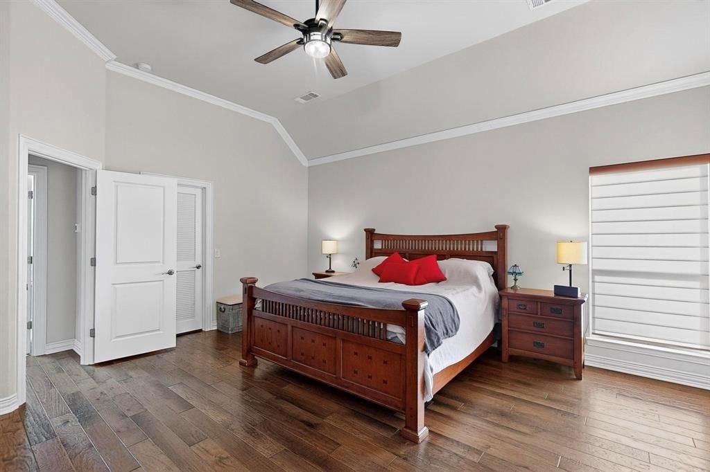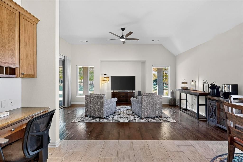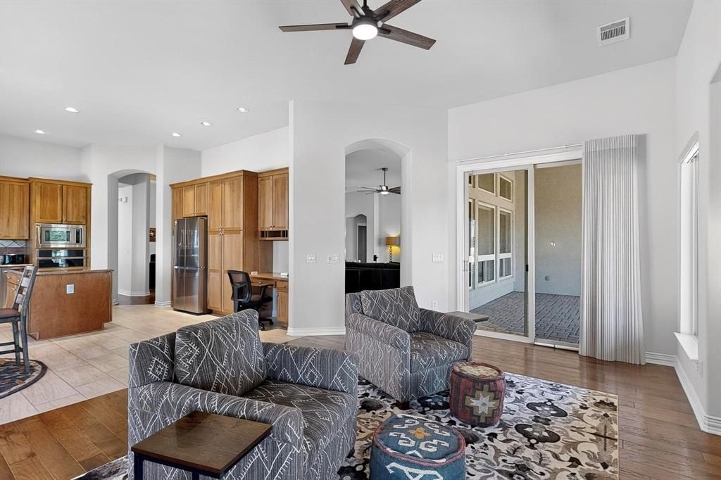 Enjoy the unobstructed backyard view from this extended Sonoma home. Set on one of the largest green belts in Robson. Manicured landscaping. The driveway and back patio have pavers, which add an elegant look to the property. 3 full car garage. 26 x 21 and a separate 20 x 12 bay. Sunlight fills this home. There are high ceilings throughout most of the house. Wood and tile floors throughout. No carpet. The living room has transom windows, built-in shelves, crown molding, and a fan. The kitchen has a surplus of cabinets, an island, stainless steel appliances, a trash compactor, and a gas cooktop. It also boasts a newer wall oven, bay window, under-cabinet lighting, and a tiled backsplash. The kitchen is open to a morning room or den for casual use. The primary suite offers 3 large walk-in closets and crown molding. The bath has been updated with a walk-in shower, separate vanities, cabinets with mega storage, a make-up sitting area, quartz counters, and built-in medicine chests. The second bedroom is spacious and has a large walk-in closet. The office is ample in size with built-in cabinets and shelves. The dining room is being used as a second office. The water heater was new in 2022, the roof approx. 7 yrs. There are storage cabinets in the garage, a radiant barrier, a floored attic, a surge protector, and a variable-speed fan added to the HVAC system. All this and just a few minutes' bike ride to the amenity center.